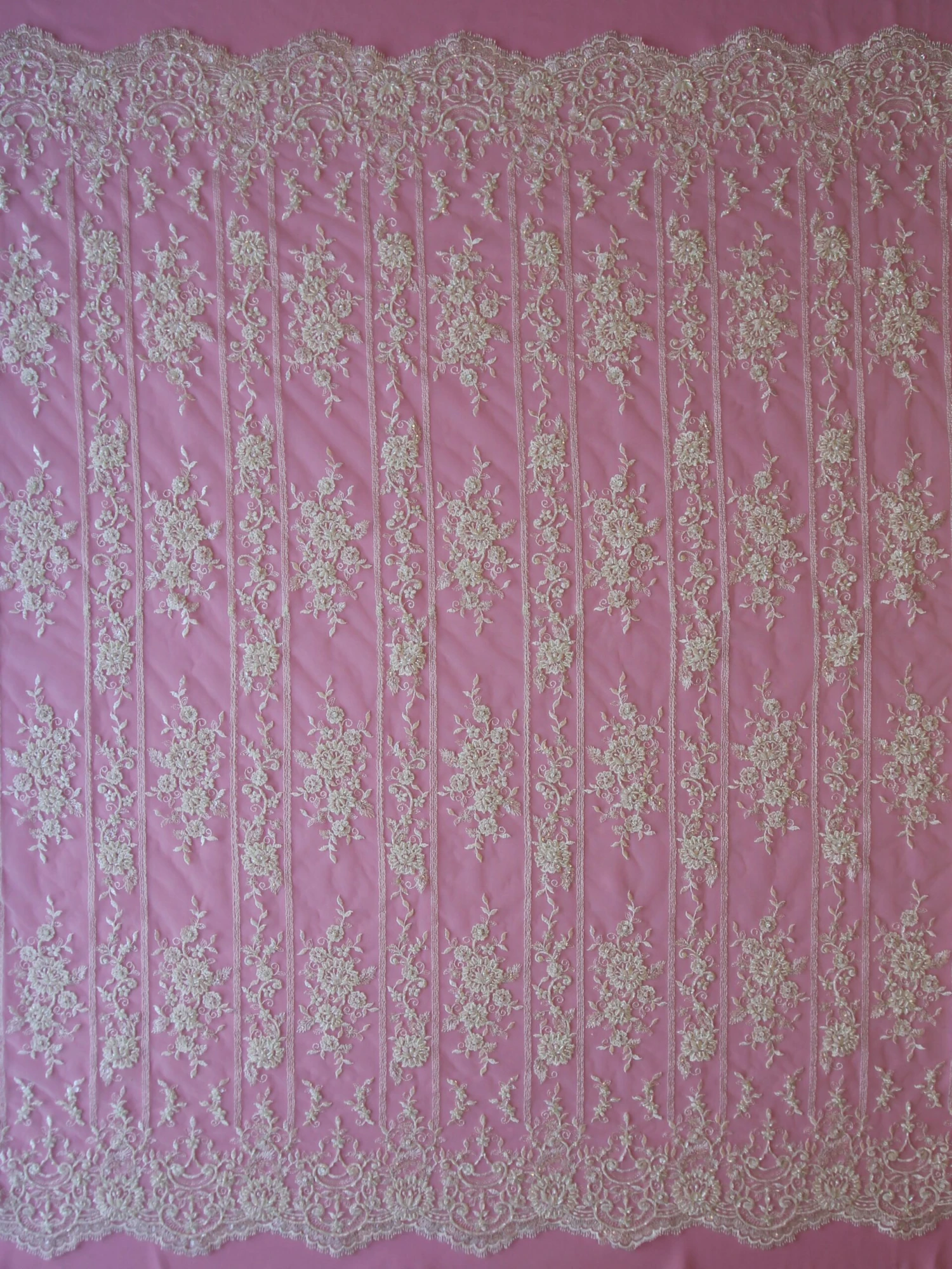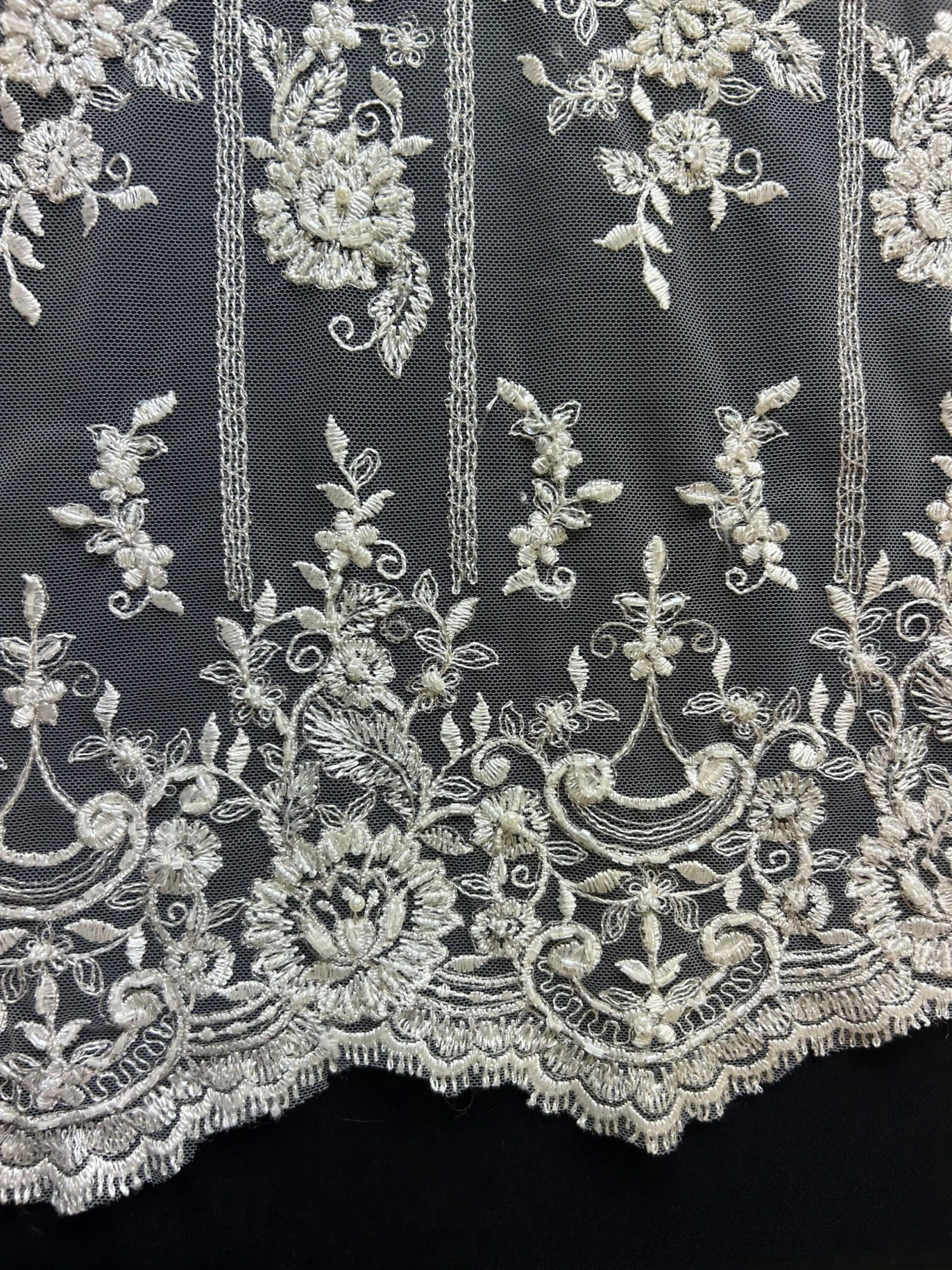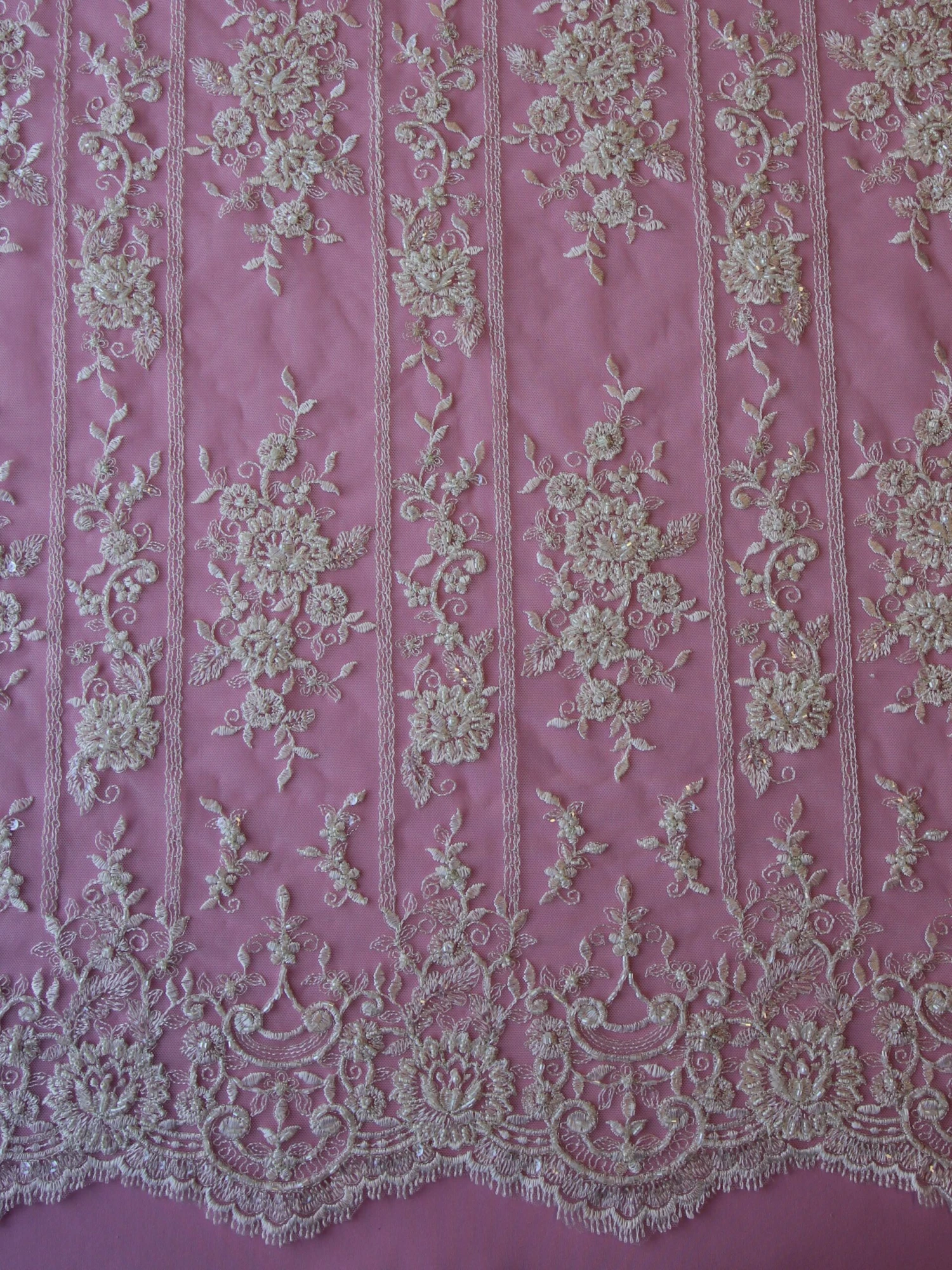 The borders are symmetrical and scalloped, measuring 19 cm (7.5″) from the edge to the inward most point and are then embellished with tubular beads, sequins and pearls.