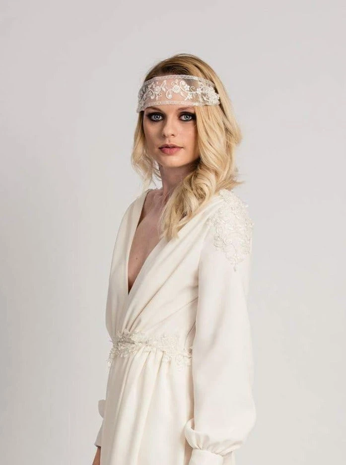 The body of the pattern is comprised of vertical lines and floral motifs, both of which use a subtle champagne colour filigree thread in addition to the ivory embroidery yarn.