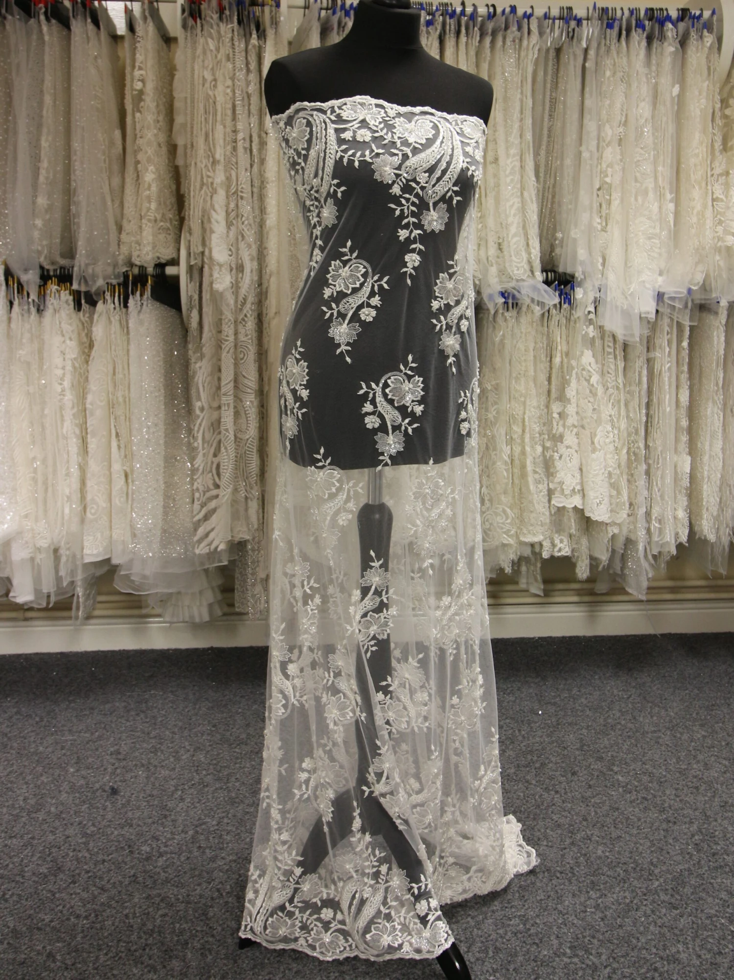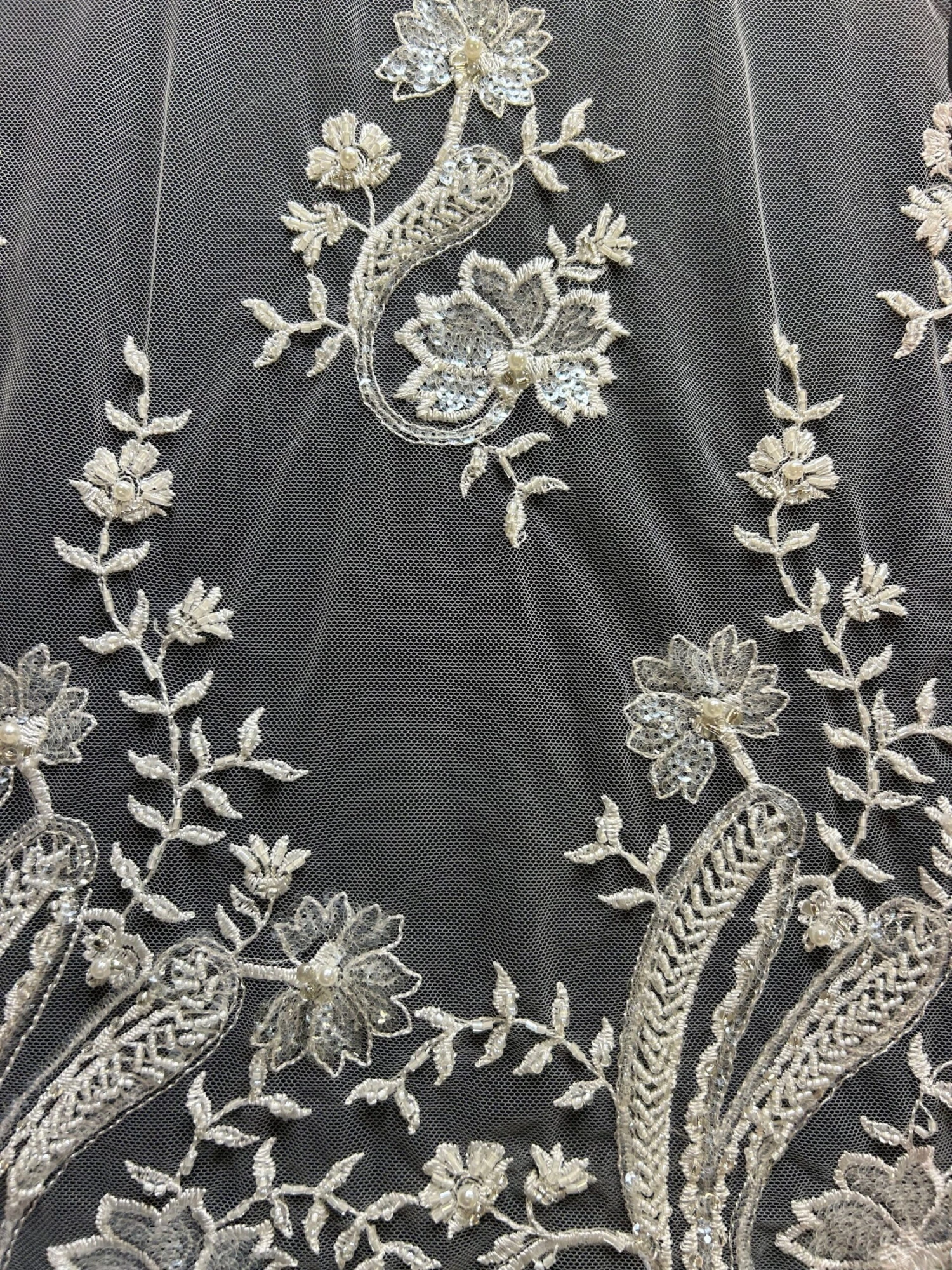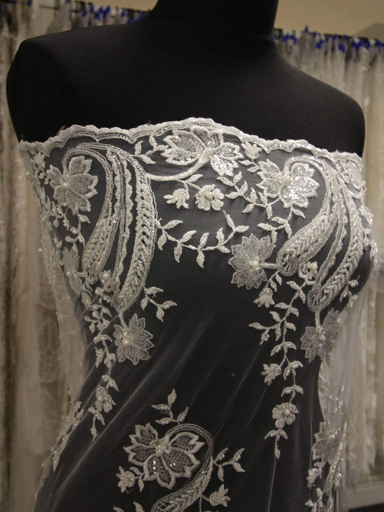 Martha is an elegant ivory bridal lace measuring 132 cm (52″) in width. Our designer has embroidered an ivory tulle with a fine ivory embroidery thread and the adorned it with a variety of different beads, diamantes, sequins and beads.