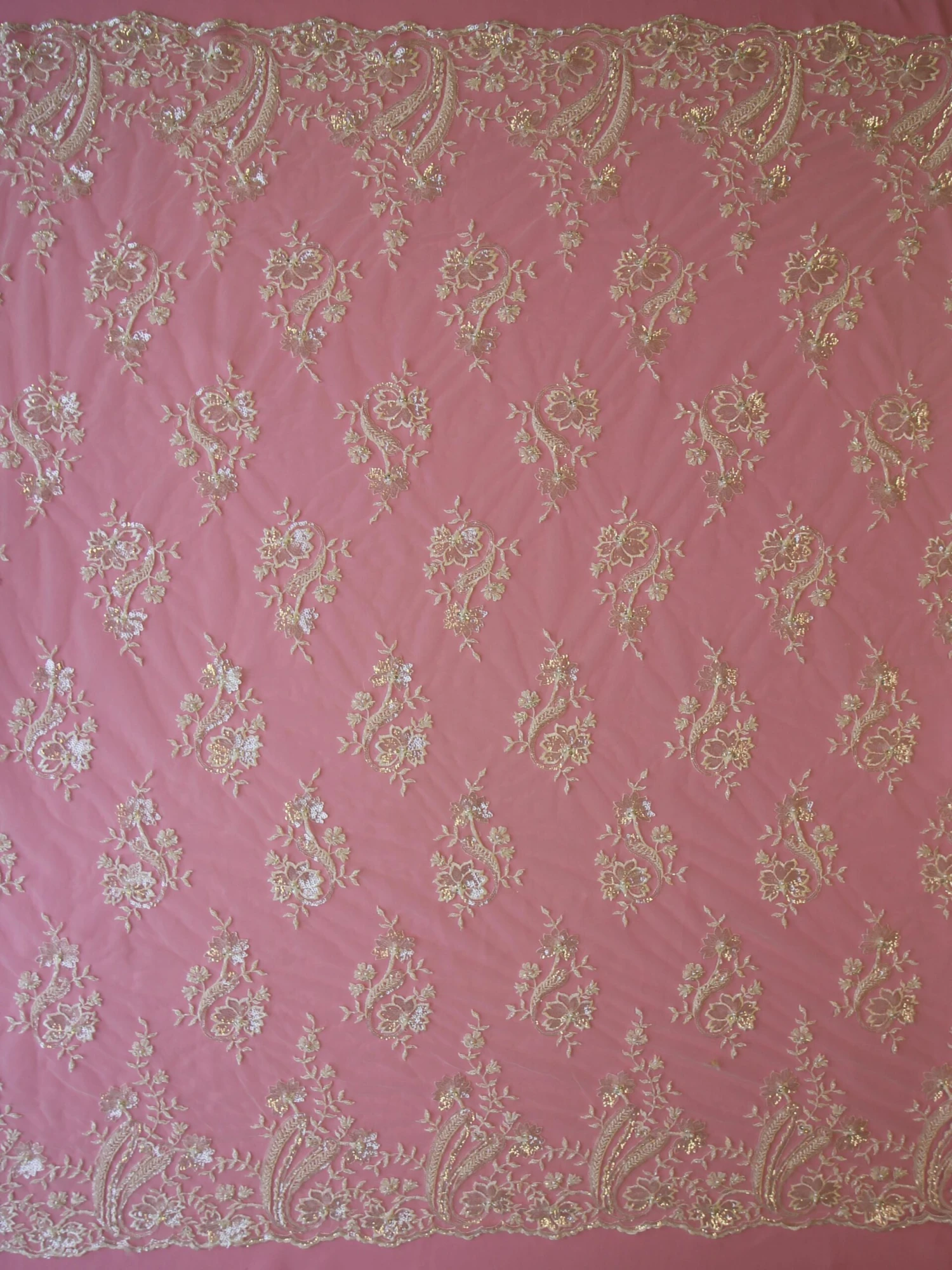 Both edges are scalloped and match one another. The borders extend into the design by 27 cm (11″)