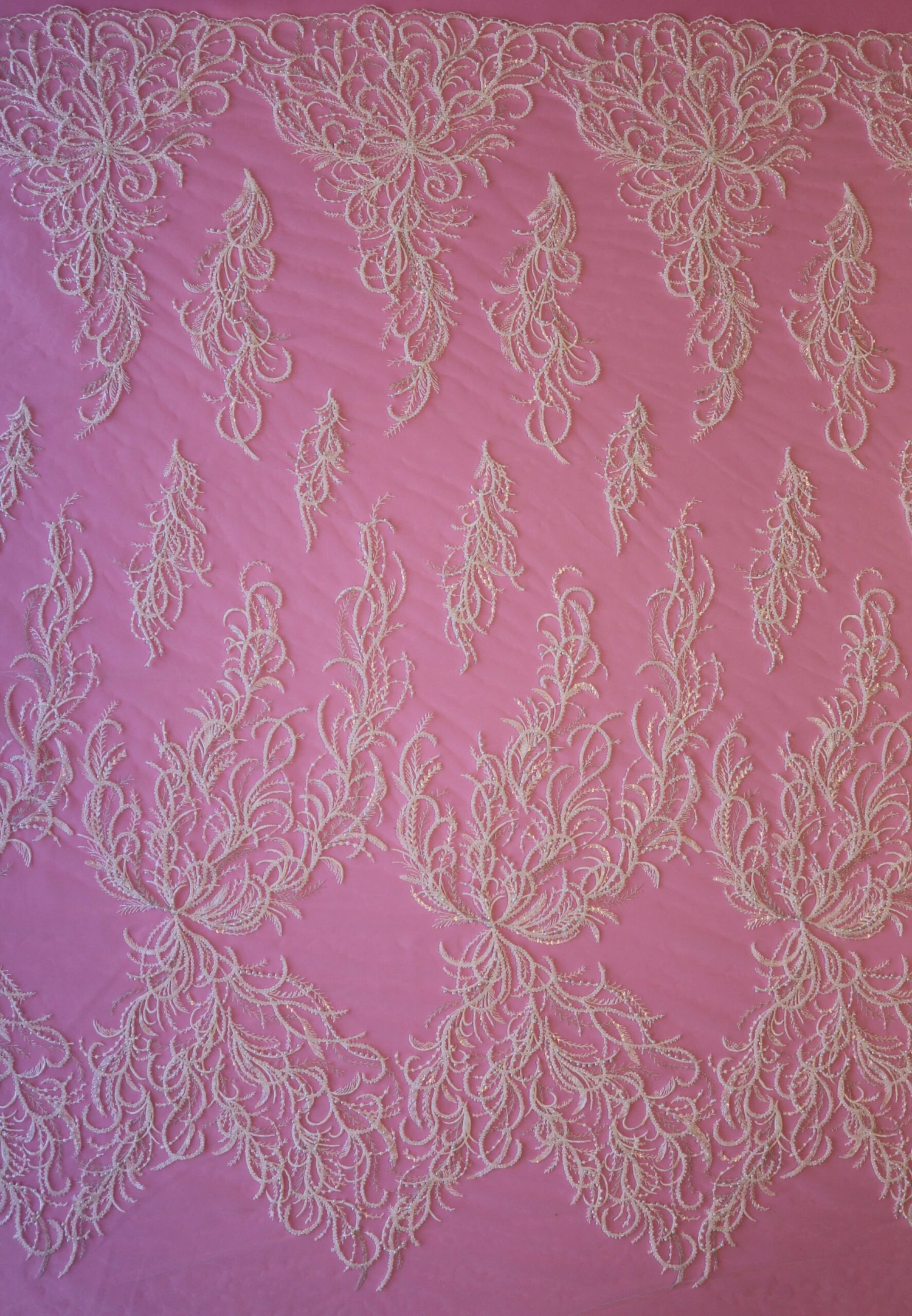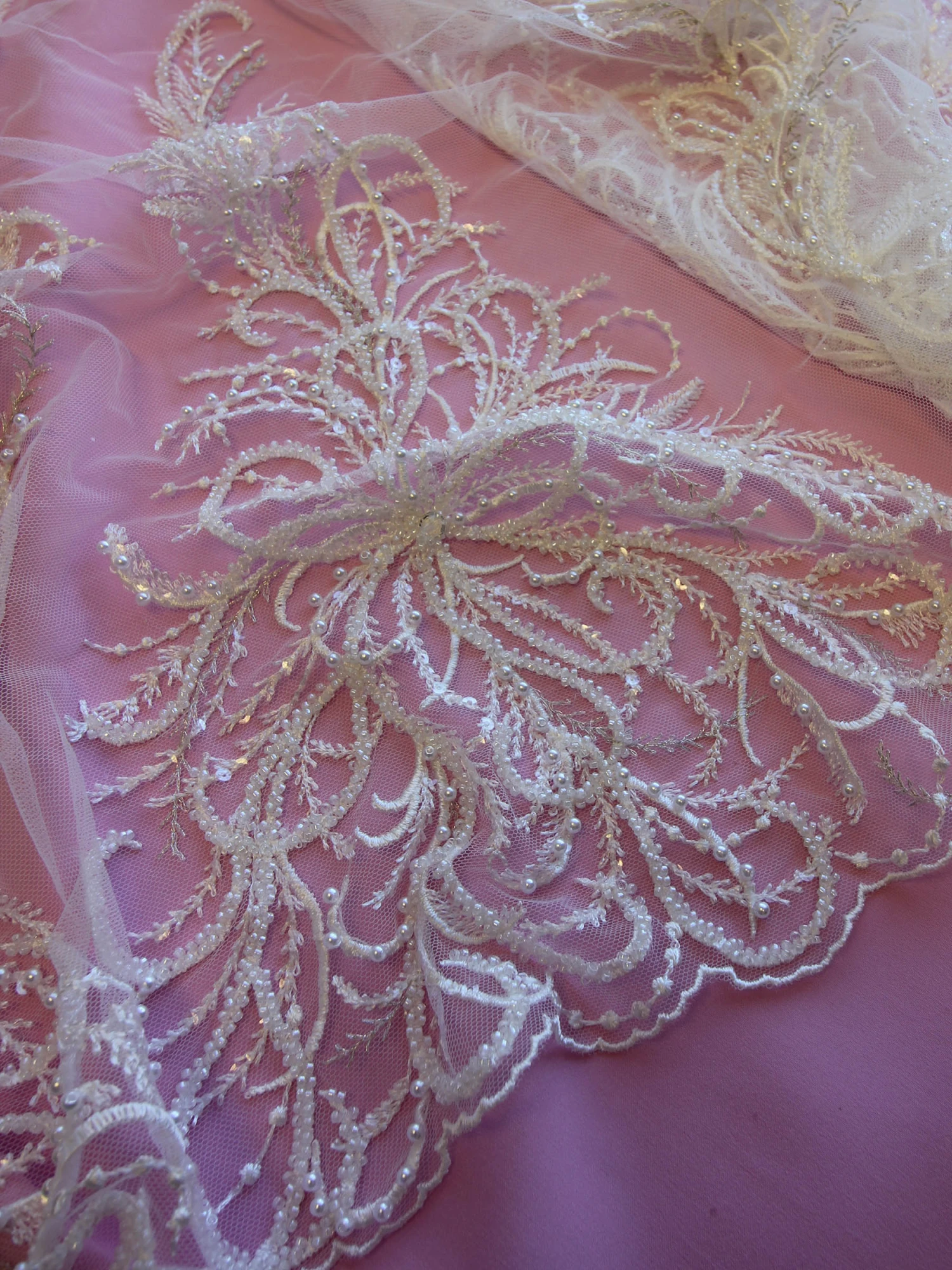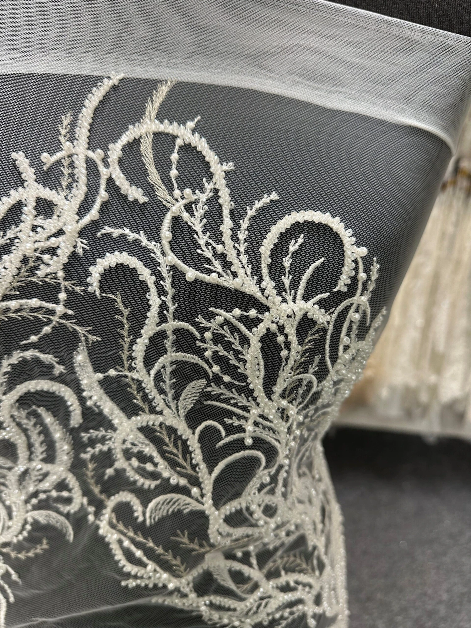 A graceful and elegant ivory bridal lace that measures 132 cm (52″) wide, this lace has a different pattern on both edges. The base is an ivory tulle that is been tastefully embroidered and then decorated extravagantly with beads and pearls.