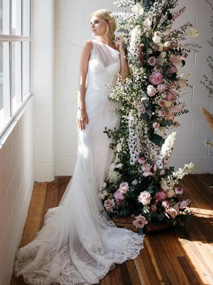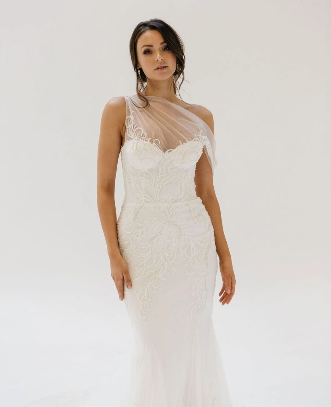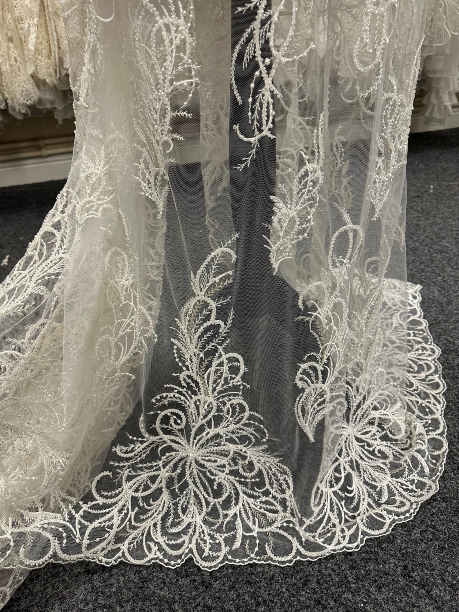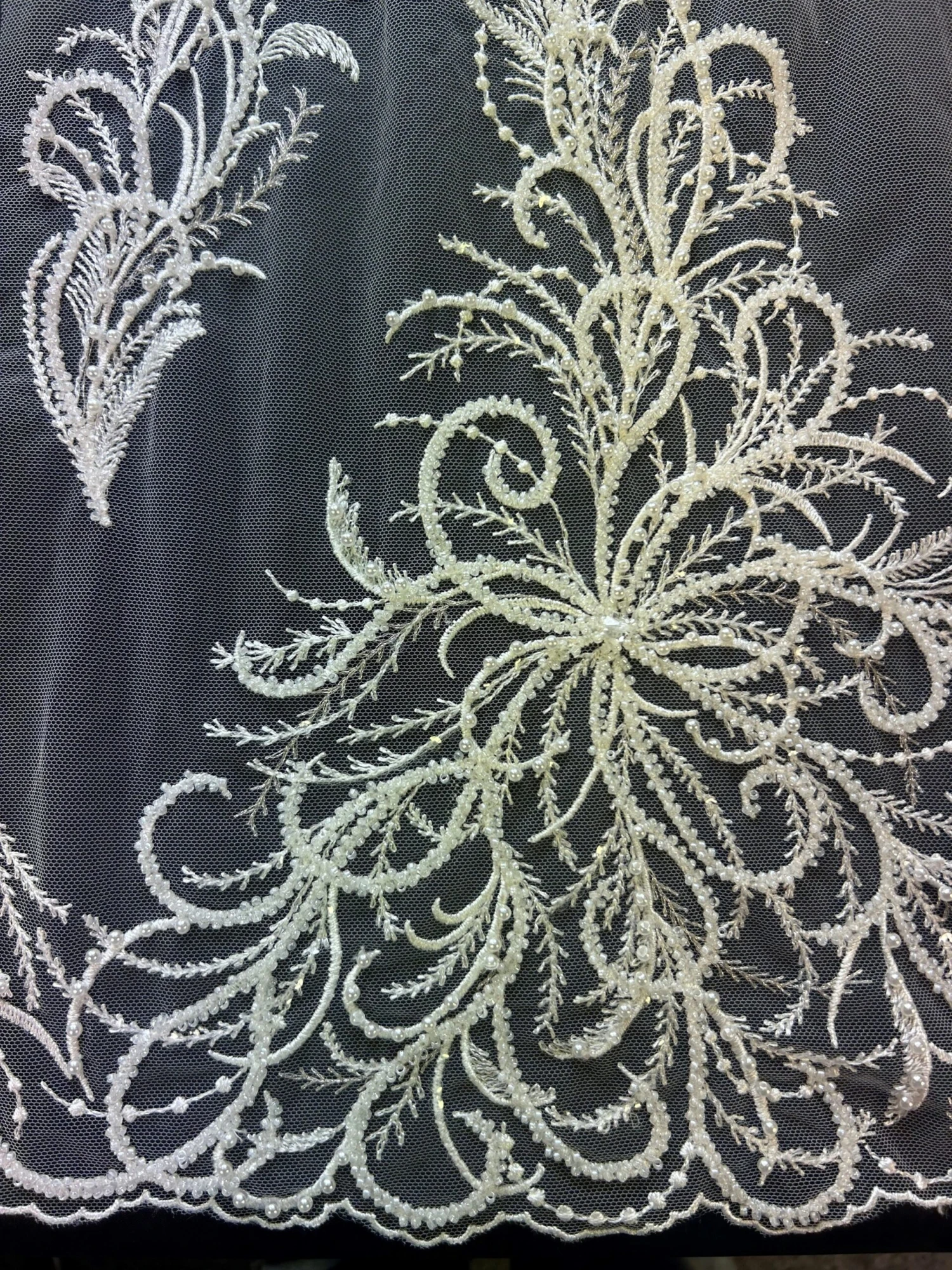 A graceful and elegant ivory bridal lace that measures 132 cm (52″) wide, this lace has a different pattern on both edges. The base is an ivory tulle that is been tastefully embroidered and then decorated extravagantly with beads and pearls.