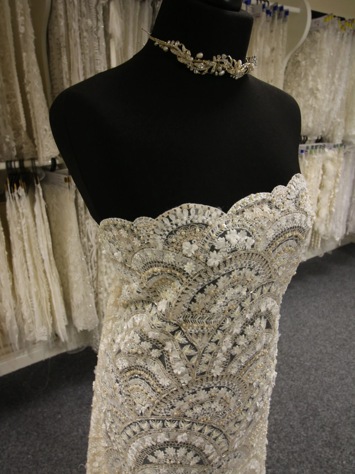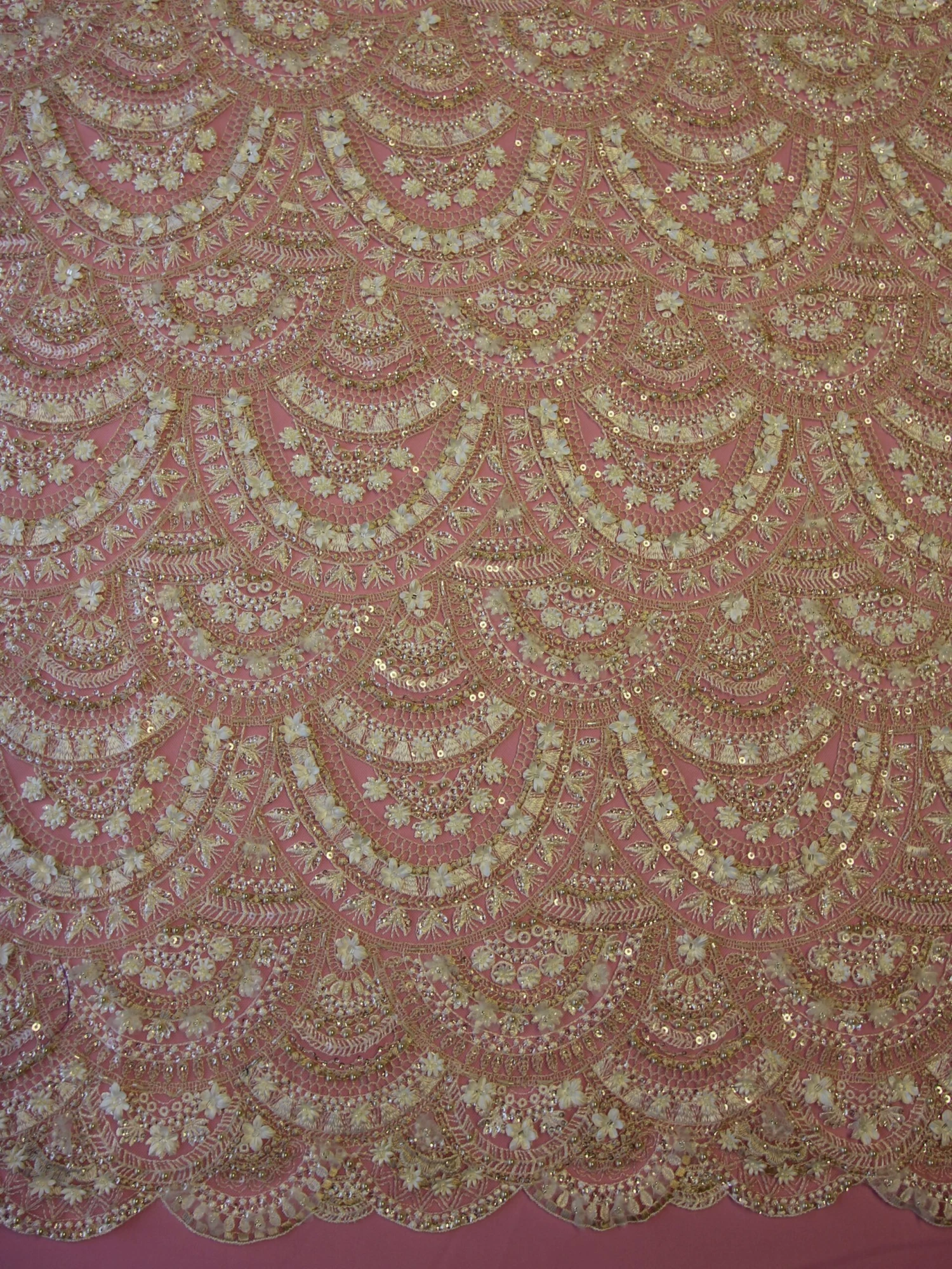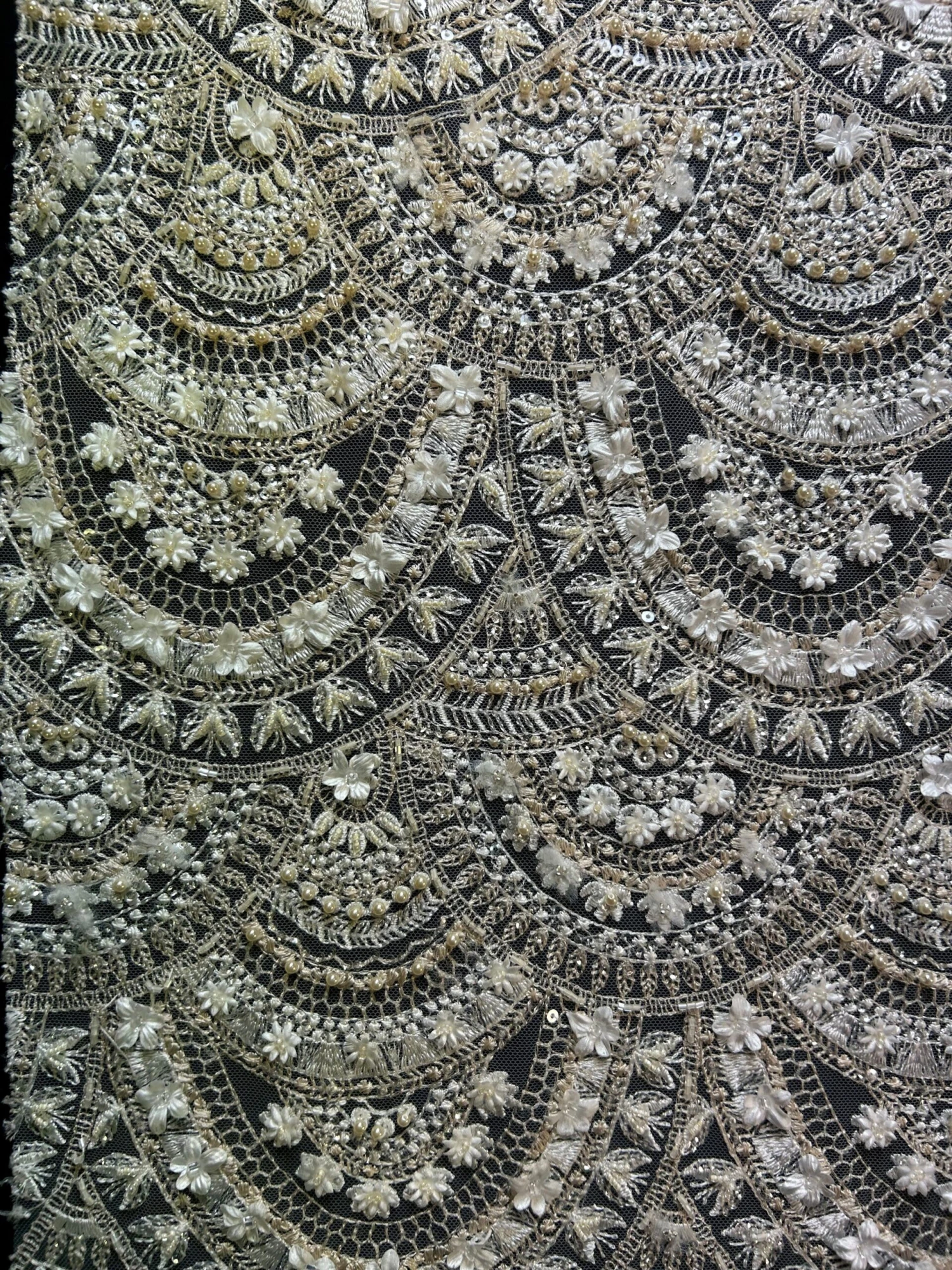 Like a sky full of rainbows, Emmeline is a lace of layered arcs, each containing intricate layers of flower and leaf patterns. The arcs feature intricate embellishment with sequins, pearls, beads and delicate 3D flowers in tones of both ivory and champagne. Offering an exquisite alternative to traditional floral displays, this lace is 132cm (52″) wide and simply magnificent.