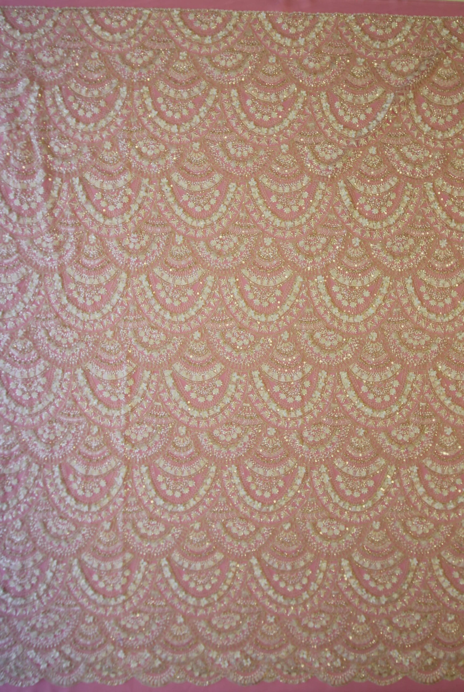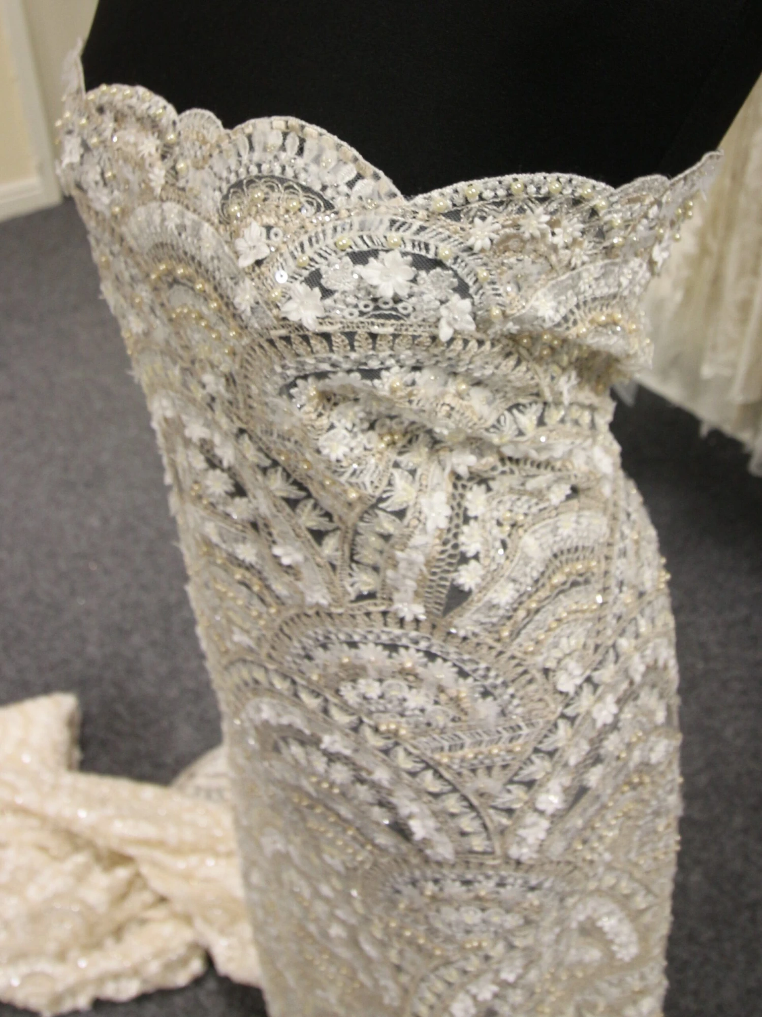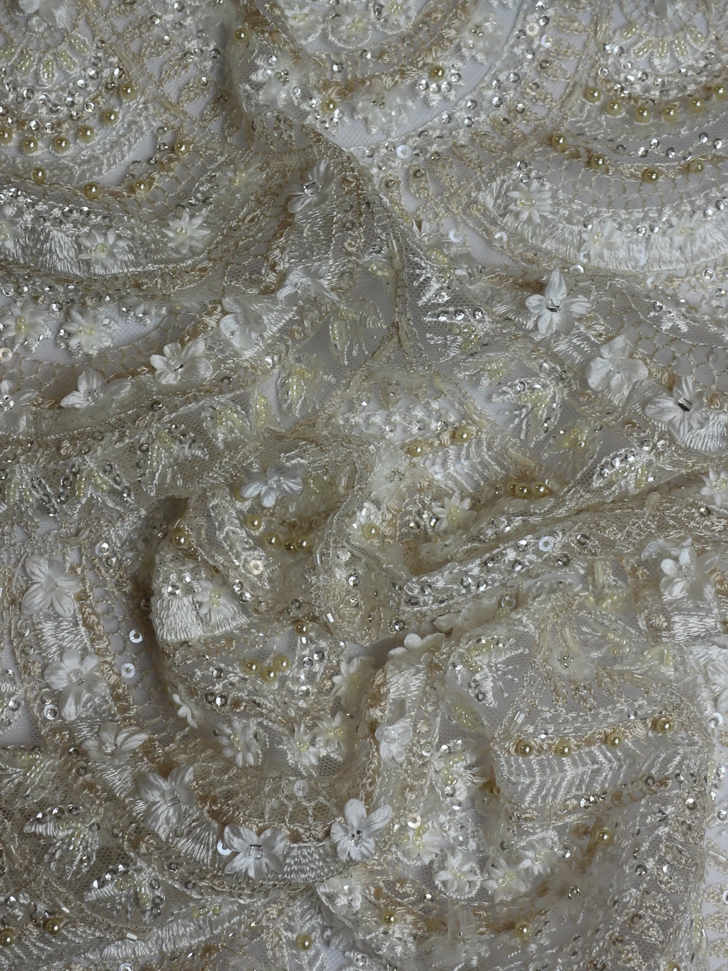 Like a sky full of rainbows, Emmeline is a lace of layered arcs, each containing intricate layers of flower and leaf patterns. The arcs feature intricate embellishment with sequins, pearls, beads and delicate 3D flowers in tones of both ivory and champagne. Offering an exquisite alternative to traditional floral displays, this lace is 132cm (52″) wide and simply magnificent.