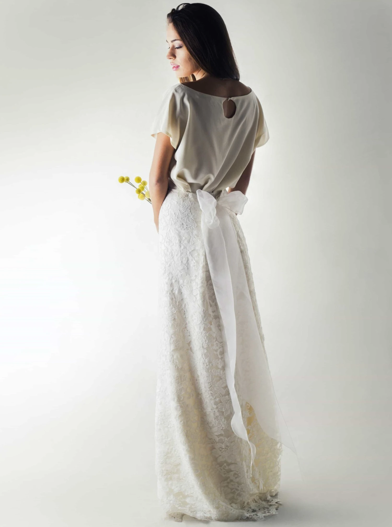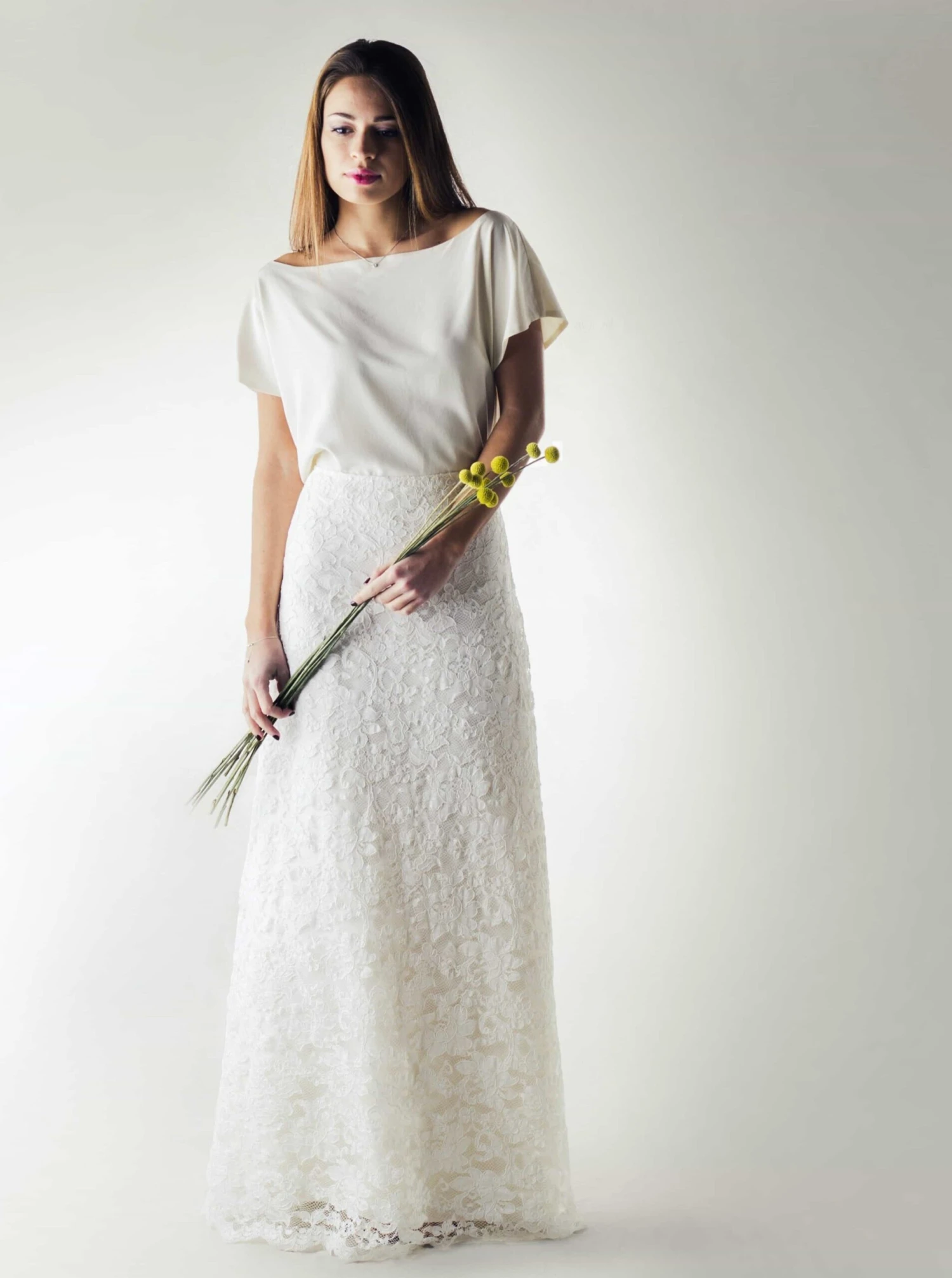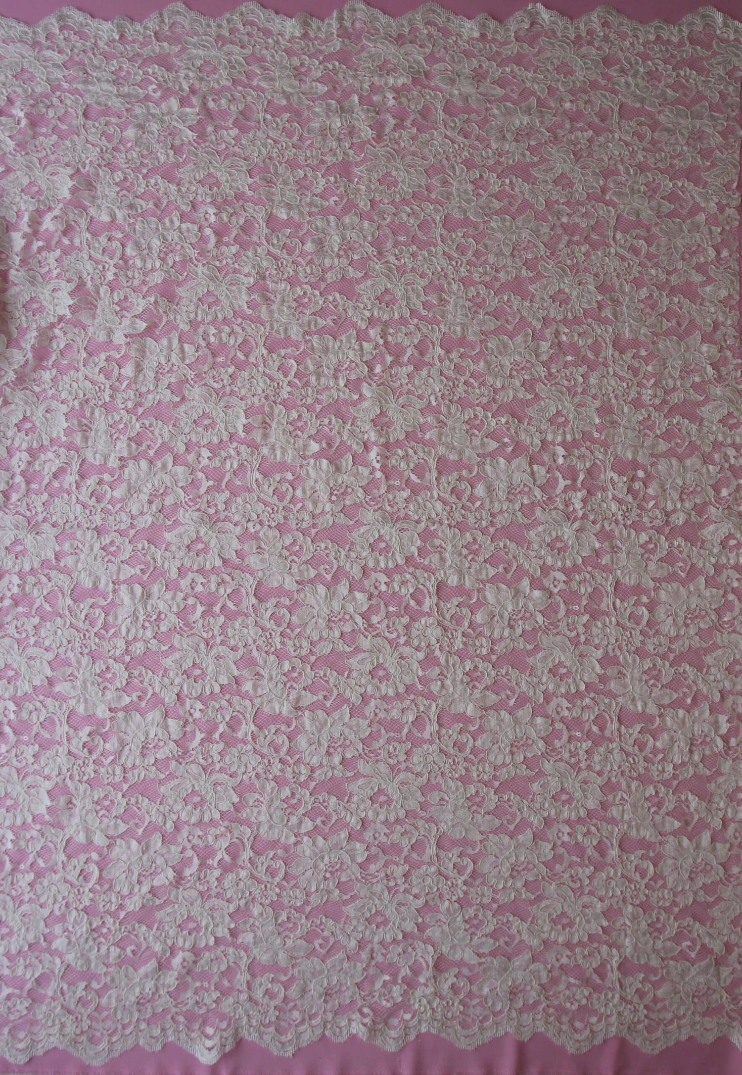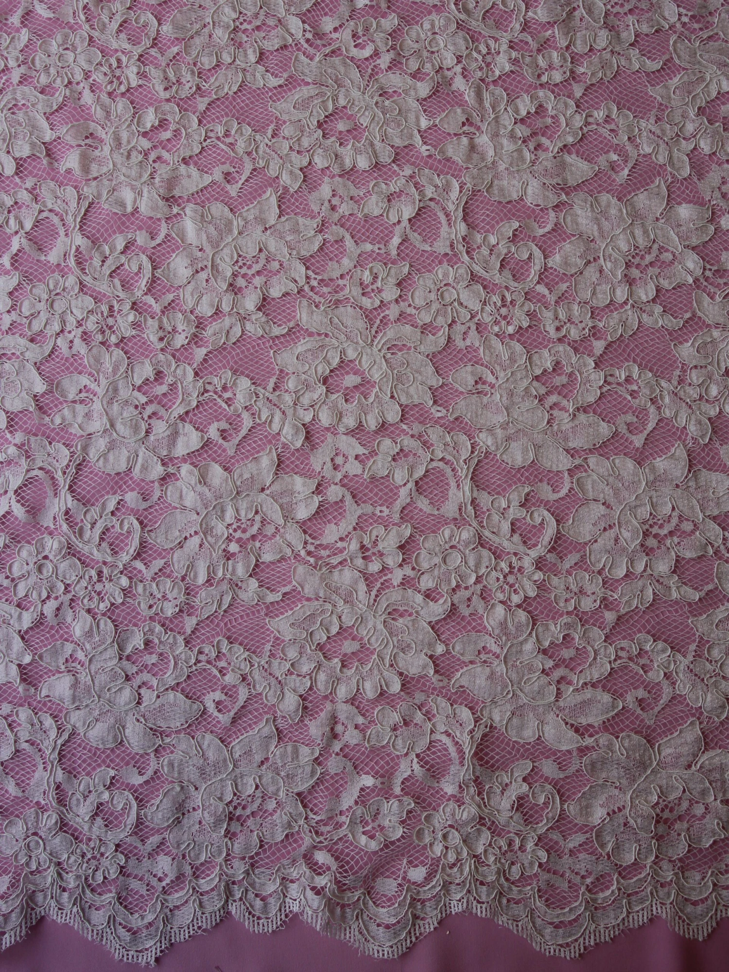 The borders are symmetrical and have a fringe which has been over embroidered, so that it is held within the lace itself. This lace measures 132 cm wide (52″). The largest flowers measure approx. 10 cm (4″) across.