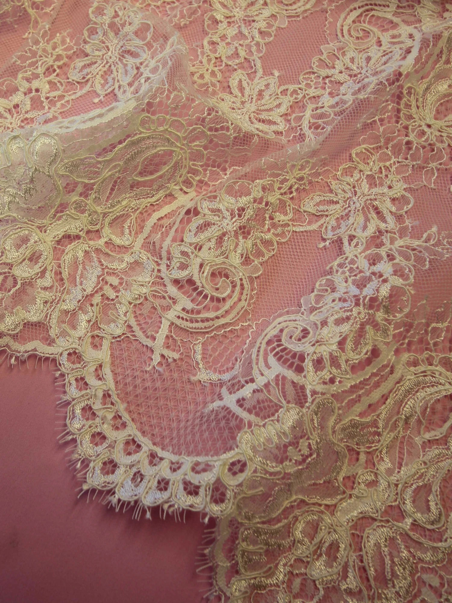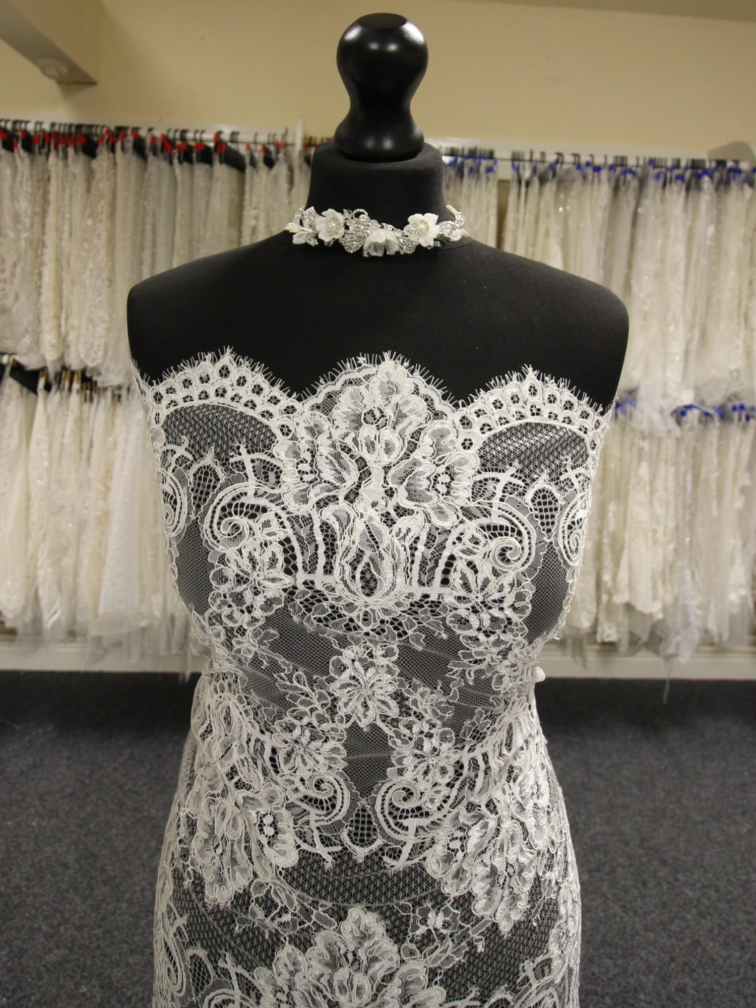 Karen is a glamorous ivory wedding lace, measuring 142 cm (56″) wide. Our designer has skillfully used a variety of different techniques to tastefully embellish this lace to eye catching effect. Both borders are scalloped and fringed and match one another. The piece de resistance is a delicate ivory cording which follows the contours of the pattern giving it some great depth and 3 dimensionality. The background used a variety of different weaves and embroidery is used at various densities to create different textures.