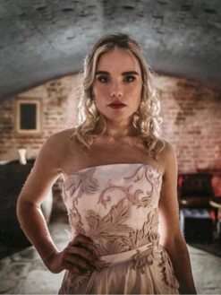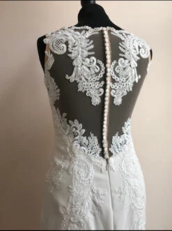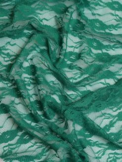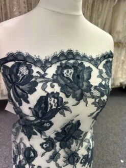 Keeley is a spectacular ivory lace that measures 129 cm (51″) wide with a background pattern, exhibiting a variety of different weaves, both open and dense. There is delicate use of a fine cording around the edge of the leaf motifs and much heavier boucle style edging around the flowers. The designer has also added beads and pearls throughout the design, mainly in the flowers, which add a certain glamour to this lace.