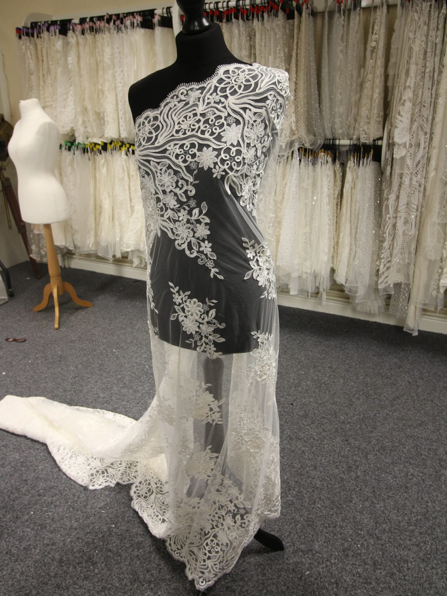 Libby is an ivory lace that measures 132 cm (52″) from edge to edge. Both borders match one another and extend 38 cm (34″) into the body of the pattern. The outer detail in the border is beautifully embroidered and then embellished with a lustrous ribbon. There is a little cording at the edge of the border but most the inner part of the border and the motifs throughout the body of the lace are tastefully corded. The motifs measure 22 cm (9″) x 13.5 cm (5.5″).