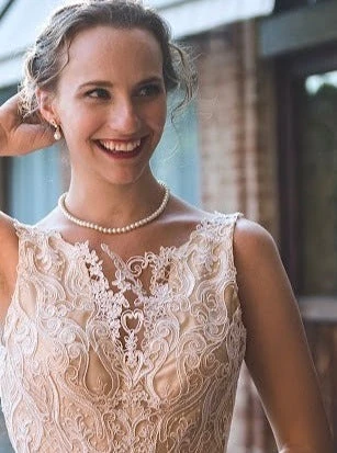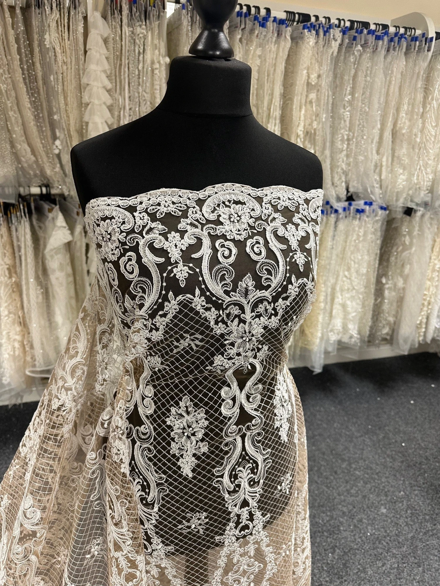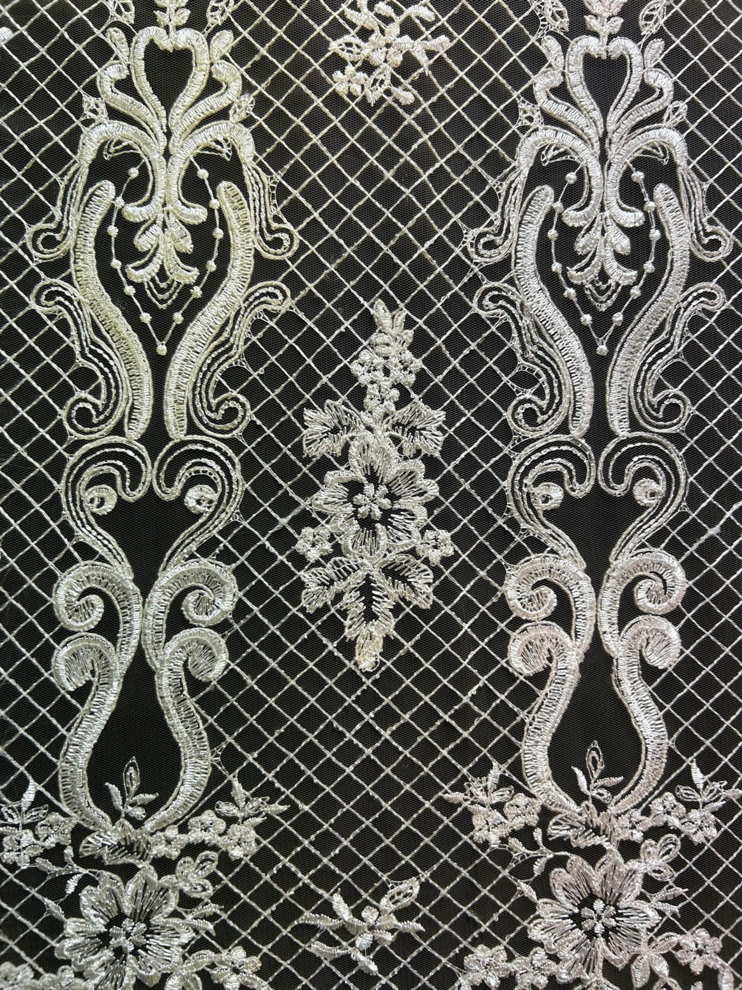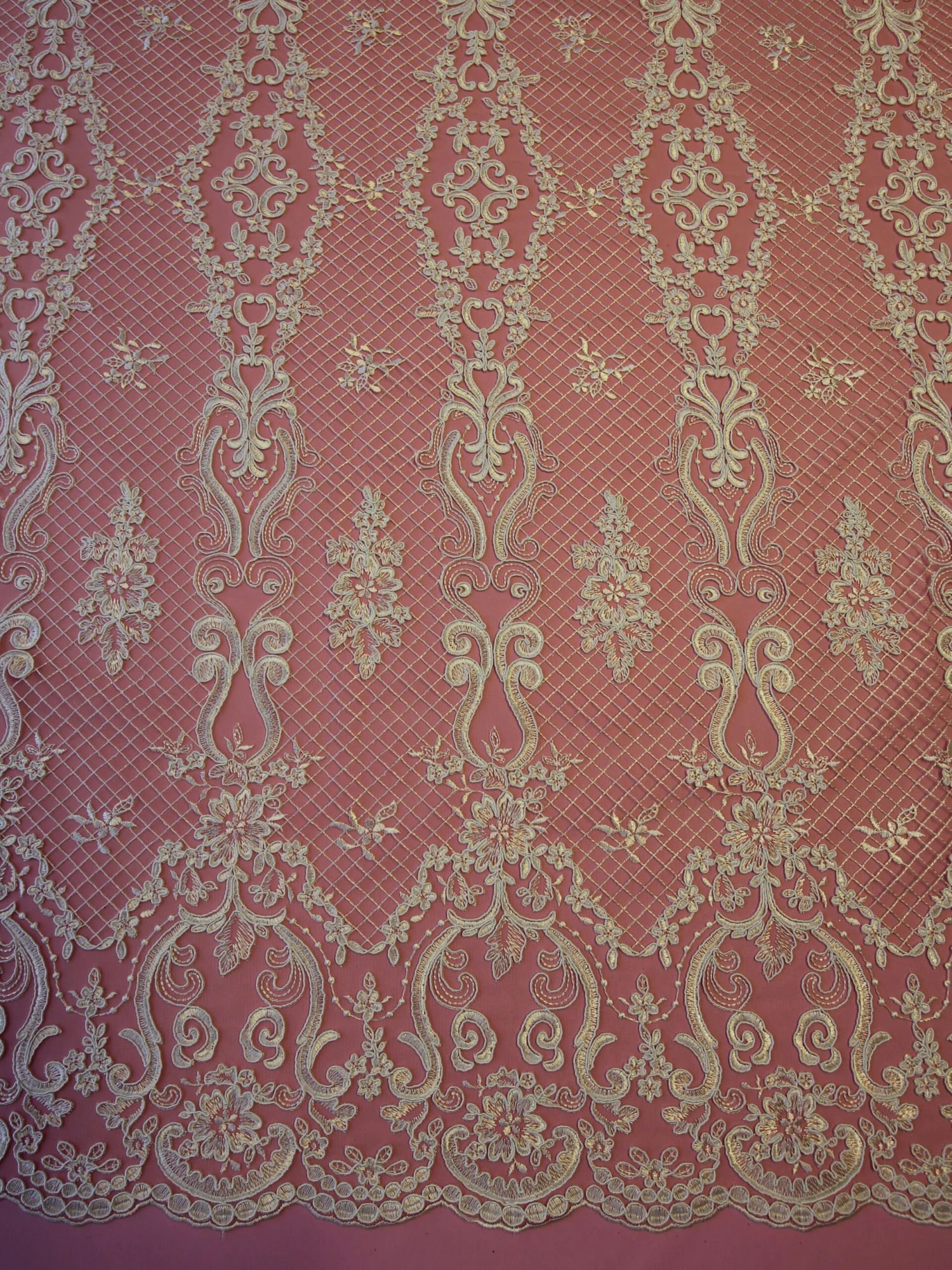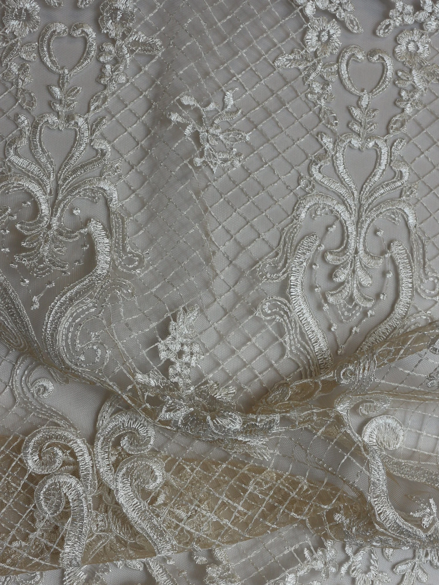 The ivory embroidery and light cording feature on a Champagne/Nude tulle base. This symmetrical lace design measures 132 cms (52″) wide. Â