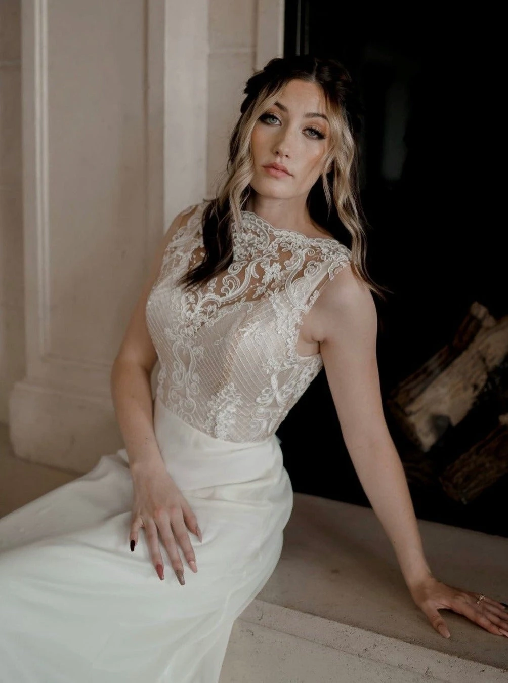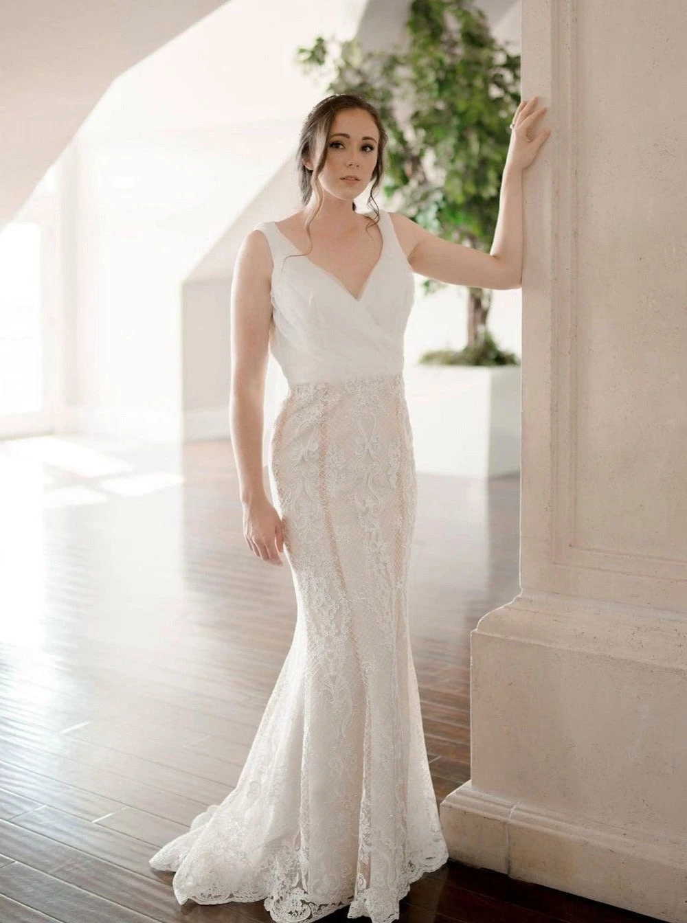 Superb example of current trends interlinked, this ivory lace on a nude tulle base features a compelling design of flowers, baroque style leaves and lattice work yet still retains a floral element with beautiful floral bouquets featuring within the lattice work and around and within the striking leaf design.