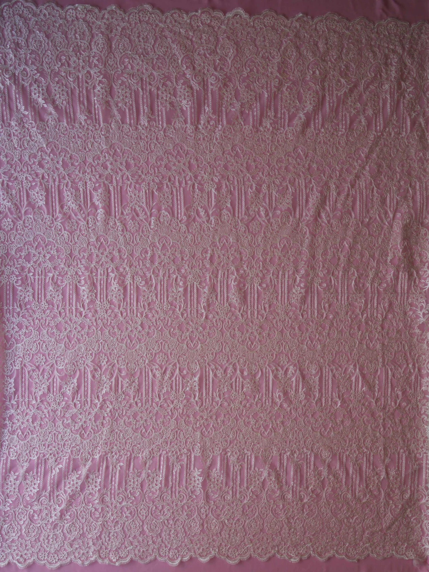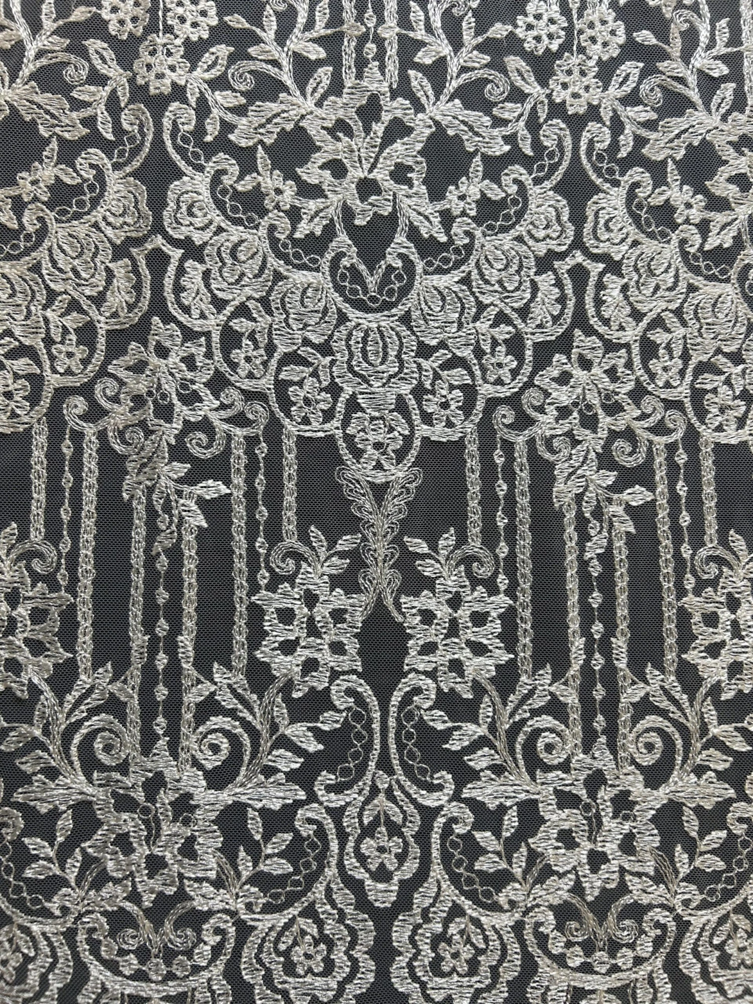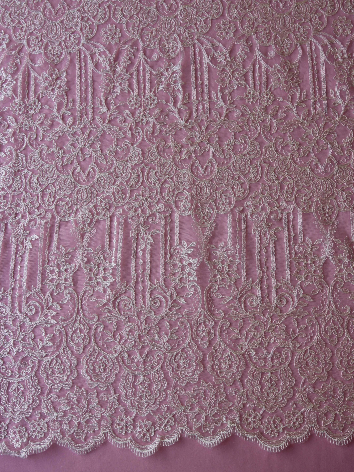 Colette is a tasteful Ivory embroidered lace that measures 132 cm (52″) wide and has matching symmetrical scalloped edges.