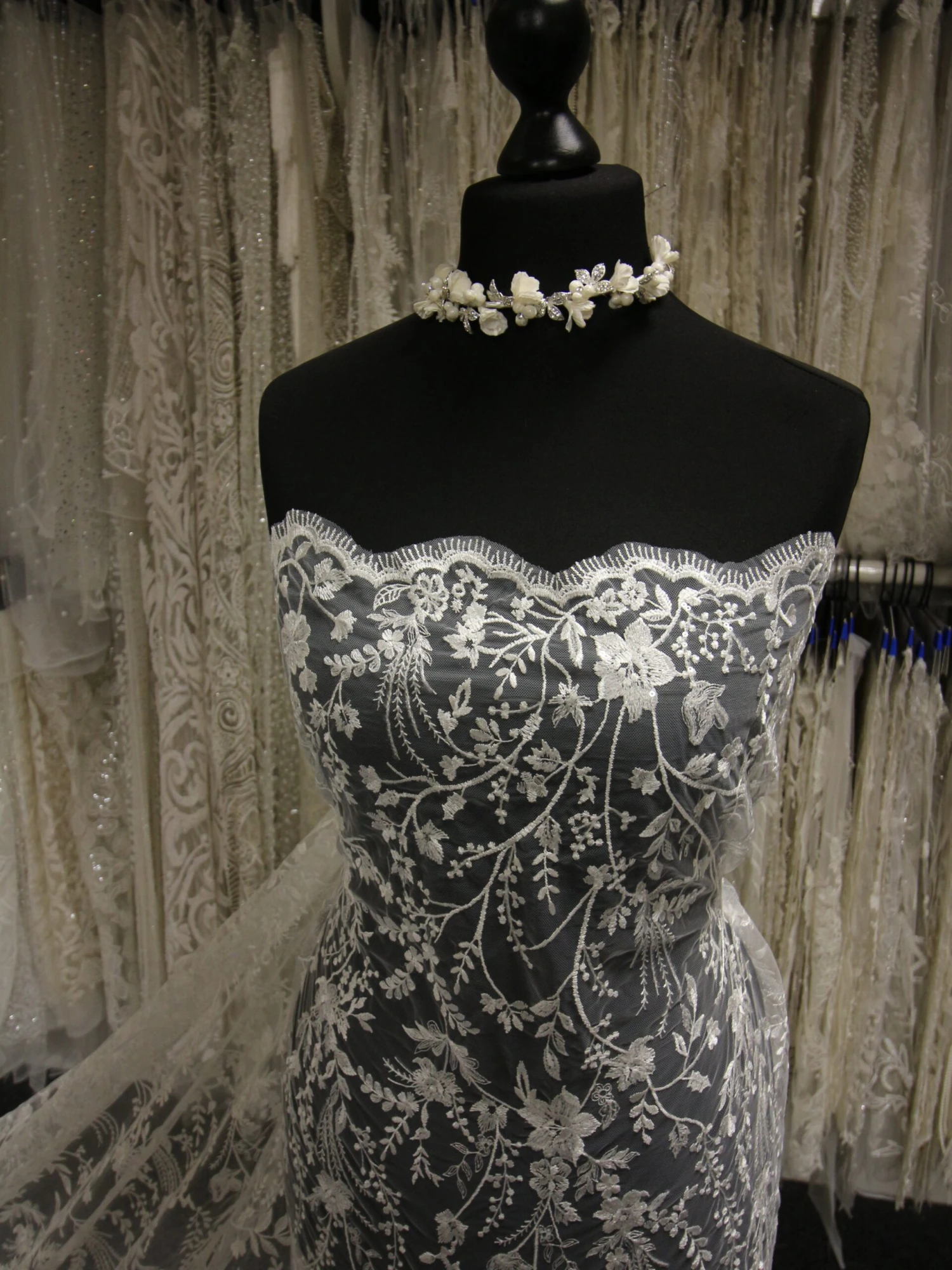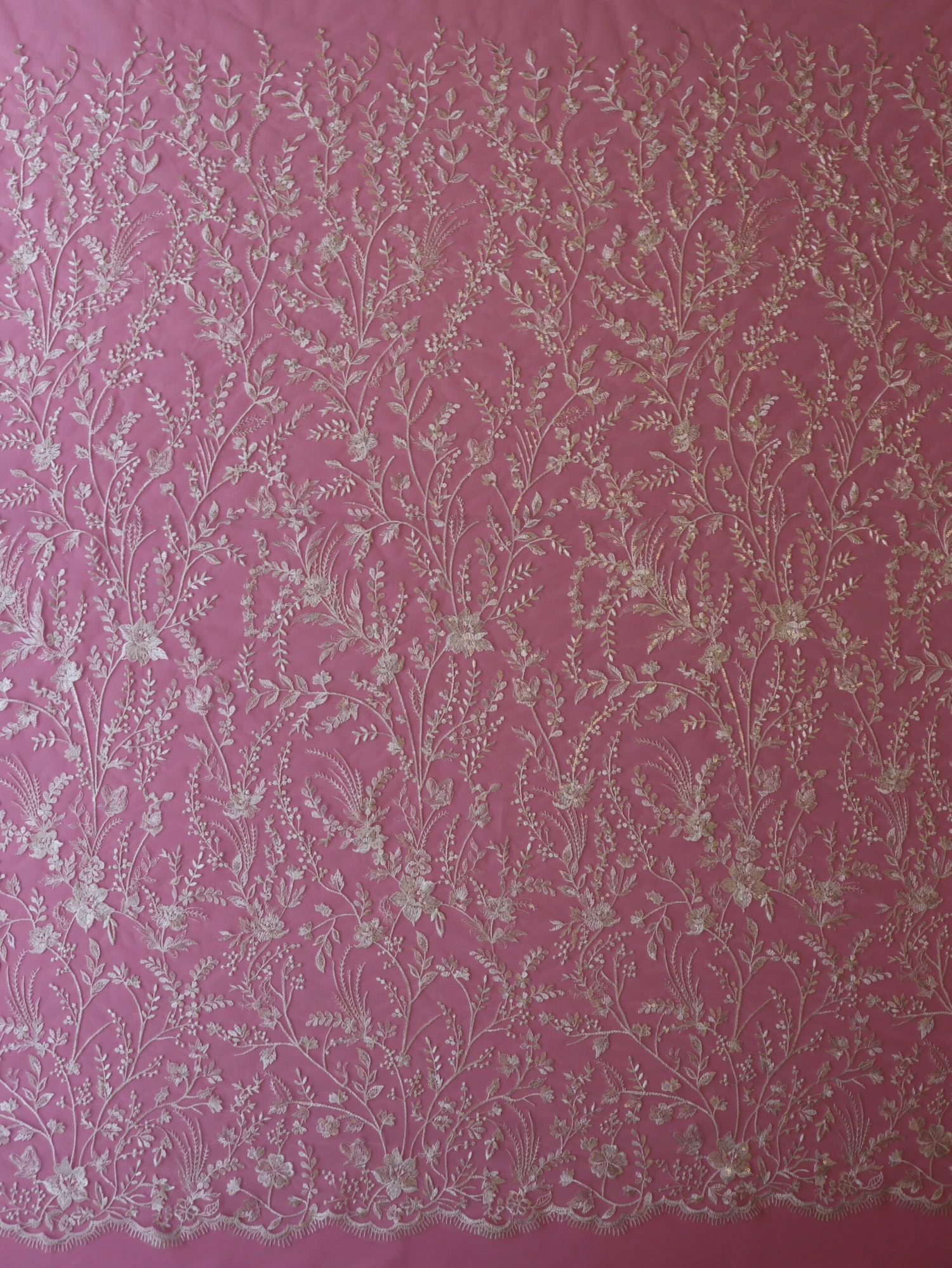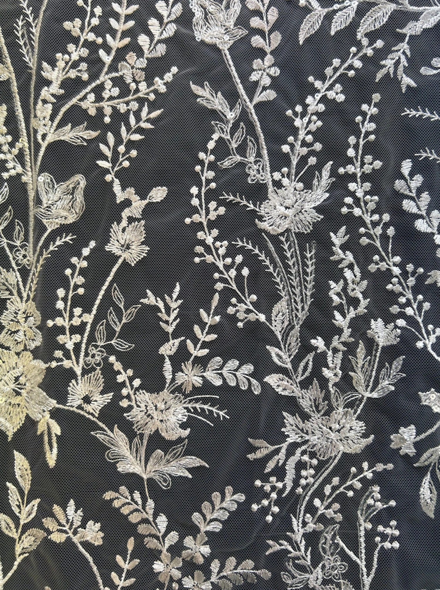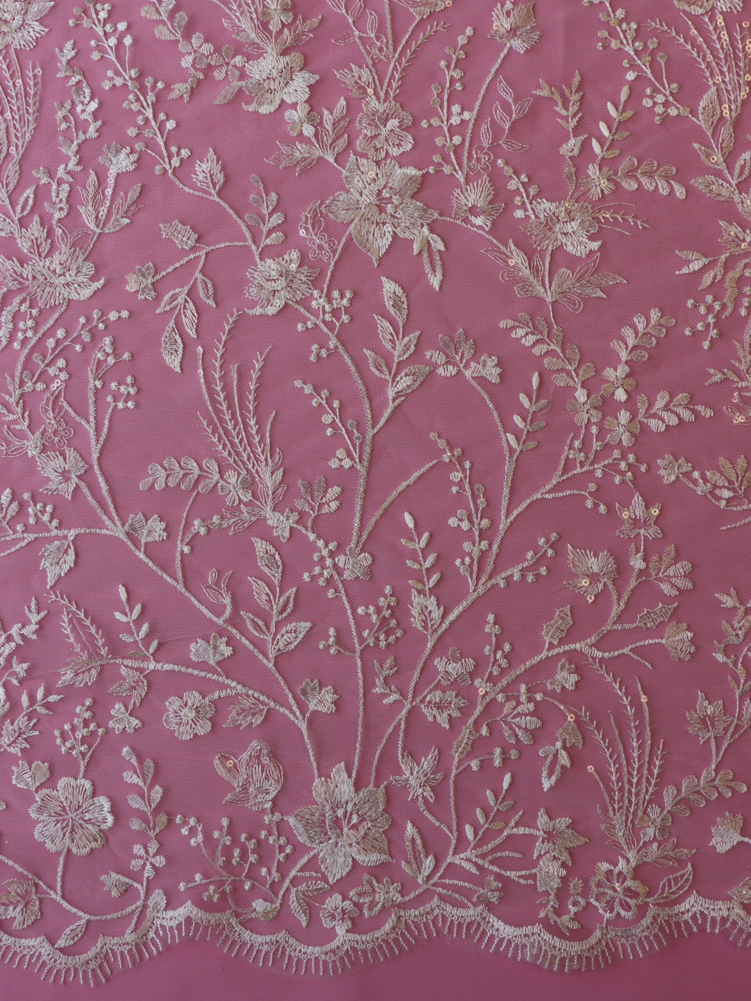 The base is an ivory tulle that has been delightfully embroidered and then decorated with a light dusting of subtle sequins.