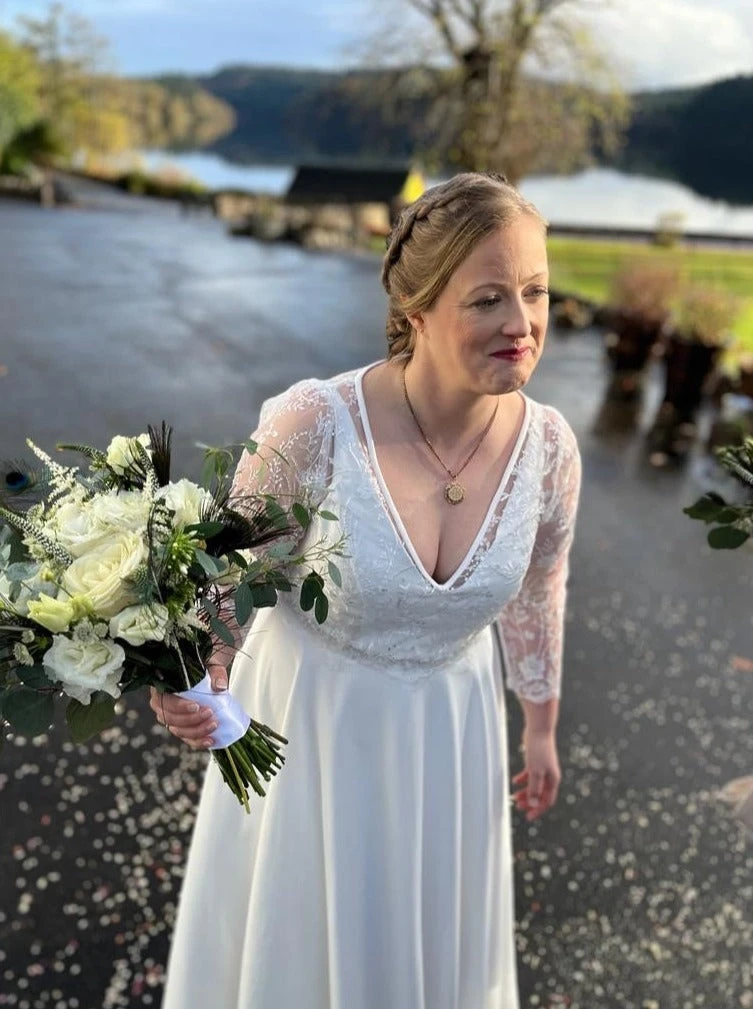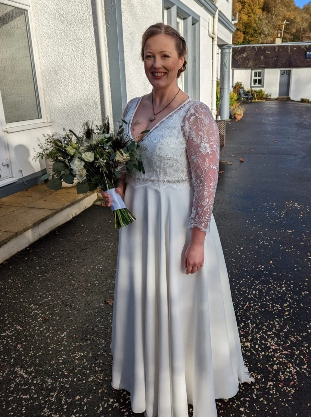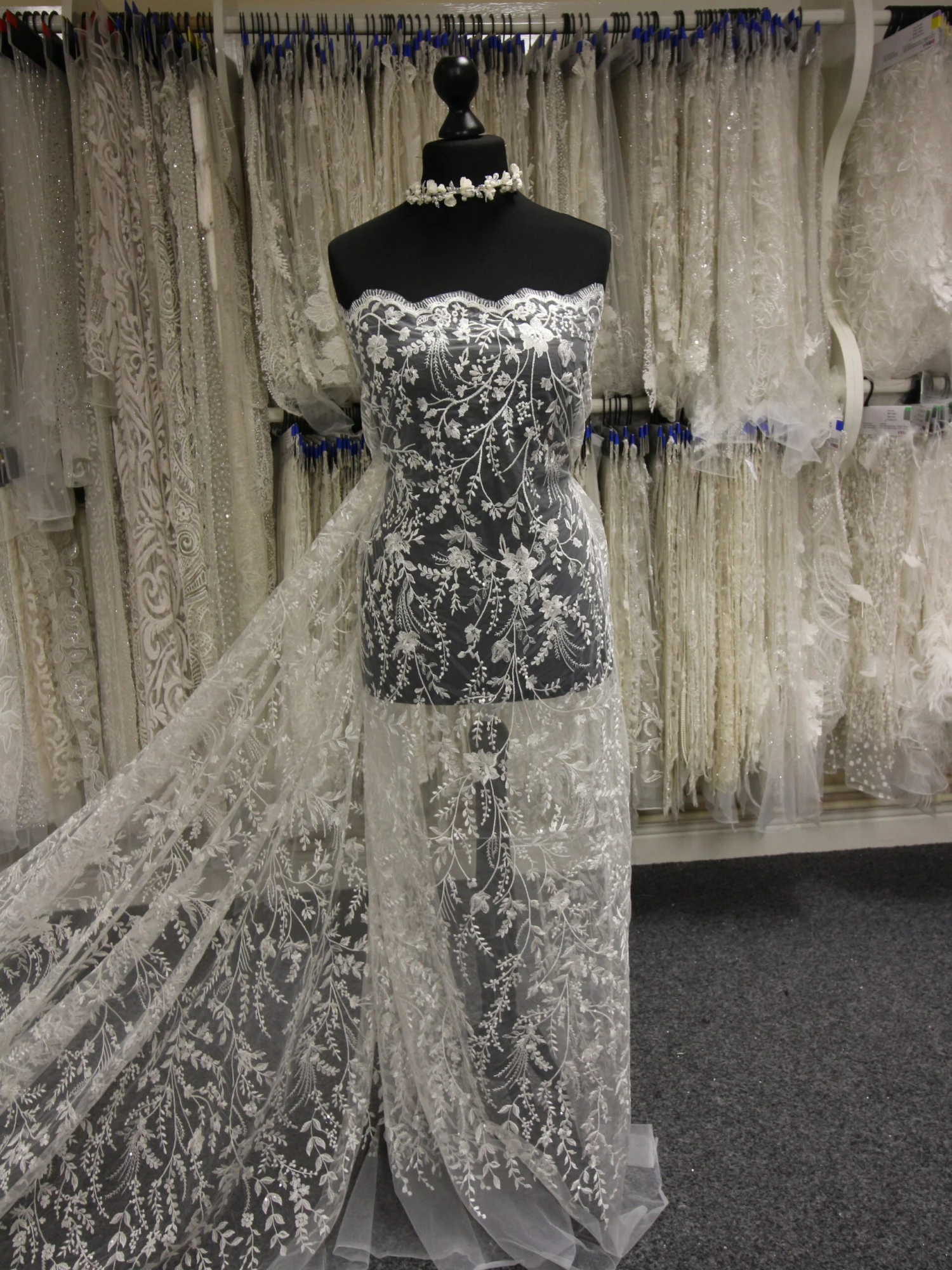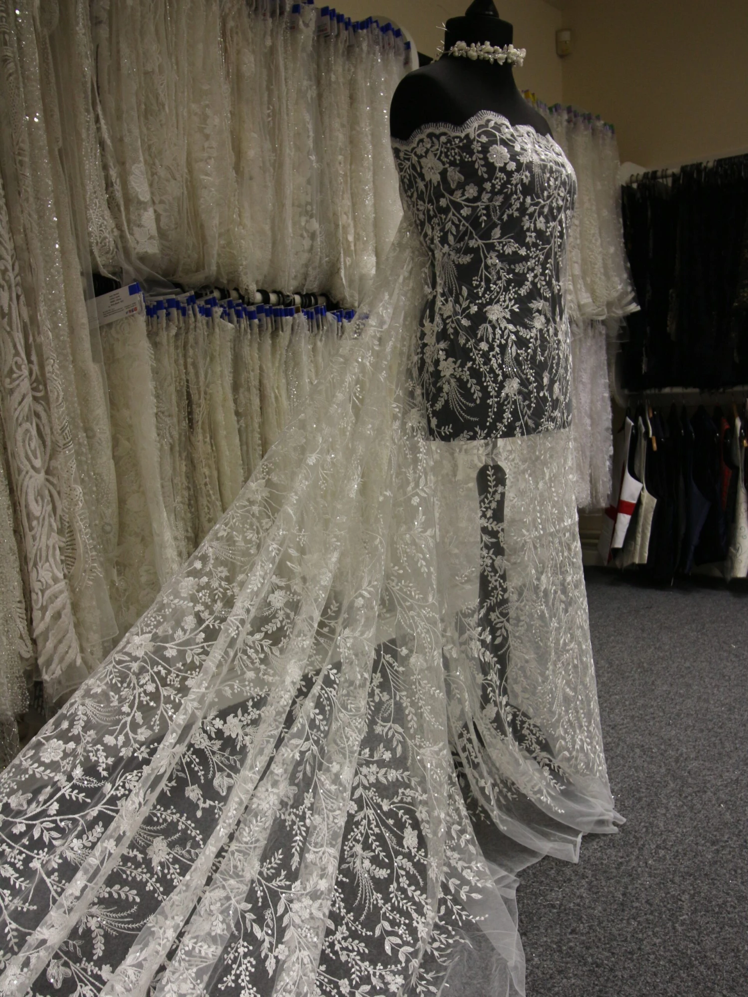 The base is an ivory tulle that has been delightfully embroidered and then decorated with a light dusting of subtle sequins.