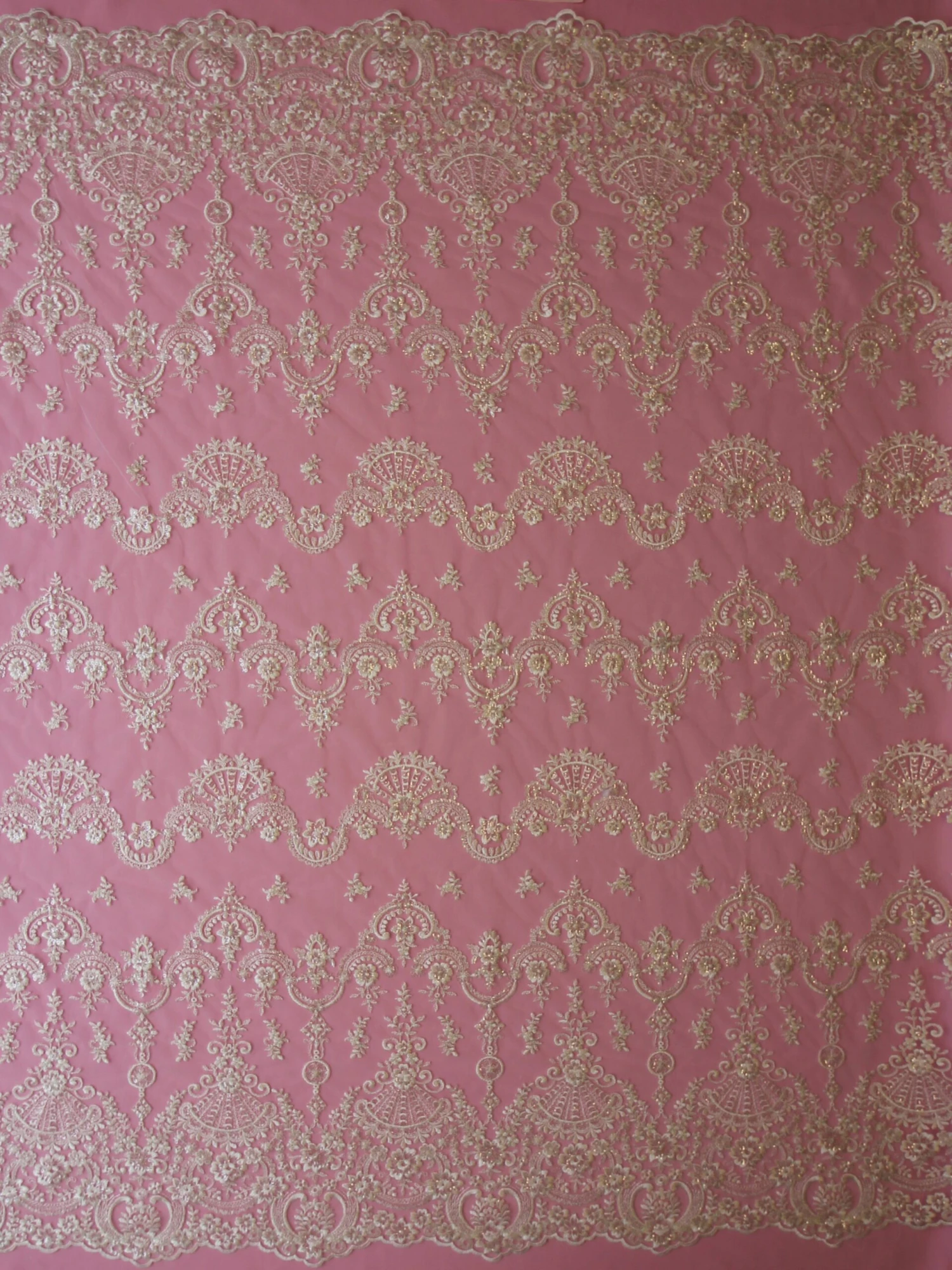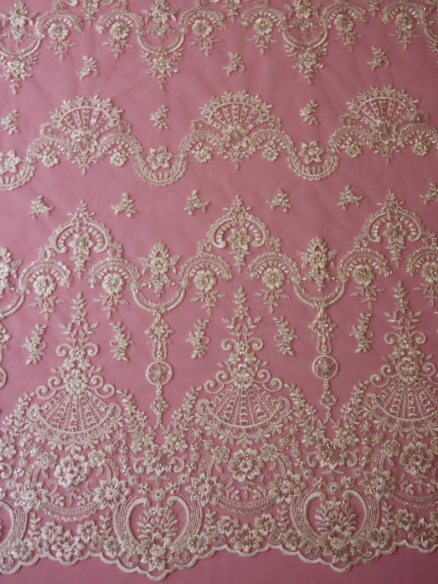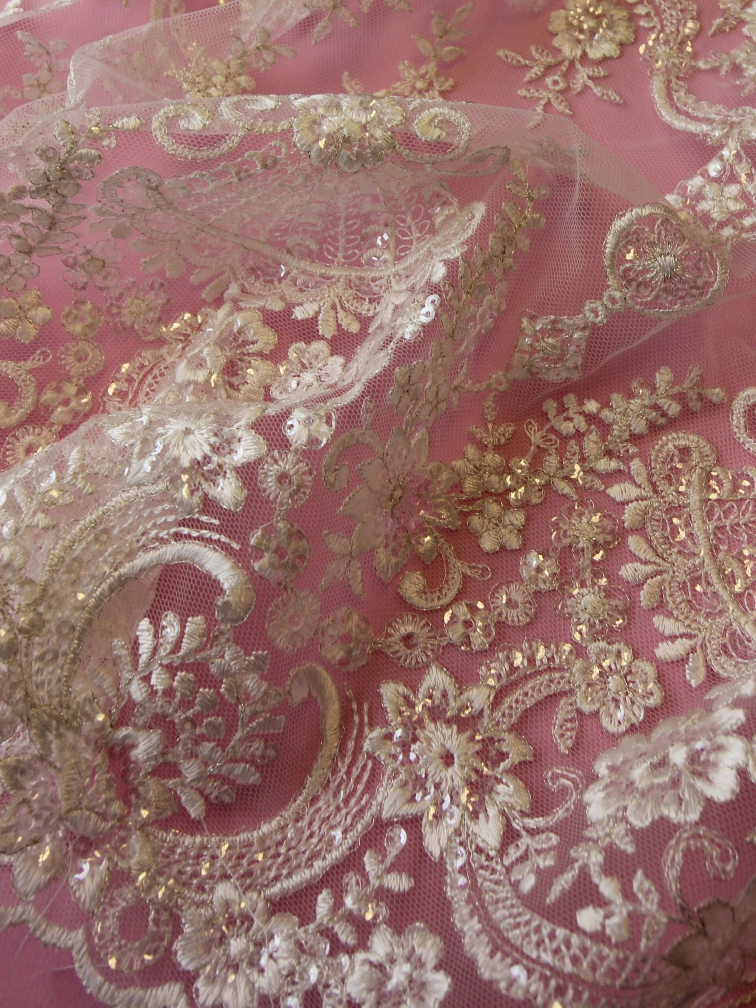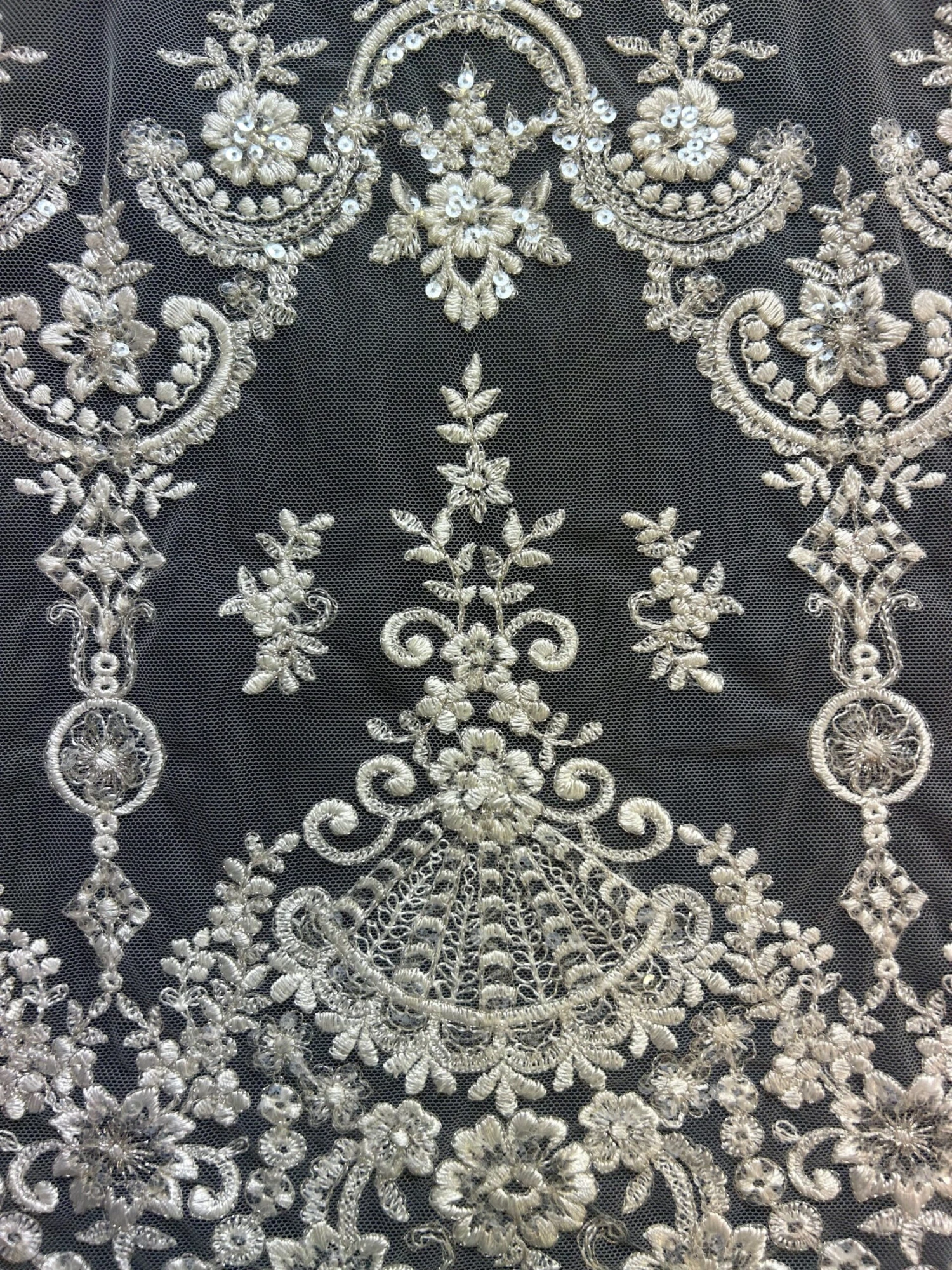 Our designer has embroidered a lightweight, soft tulle with a dense ivory thread to form floral garlands and baroque style motifs. The detail has been embellished with champagne colour filigree thread and clear, colourless sequins.