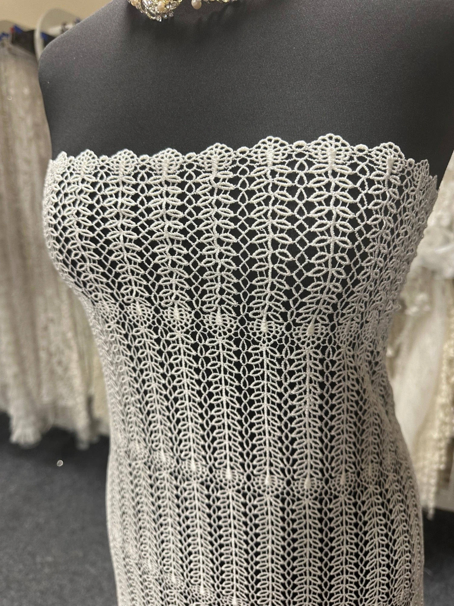 A rather delicate design, the overwhelming aesthetic of this lace is not floral. As a Guipure it has an open interconnecting weave. This is a pretty and delicate lace with a small repeat so would suit flower girl or Christening gowns in addition to bridal wear. Available from stock without minimum so you only order as much or as little as you like. We also ship worldwide.