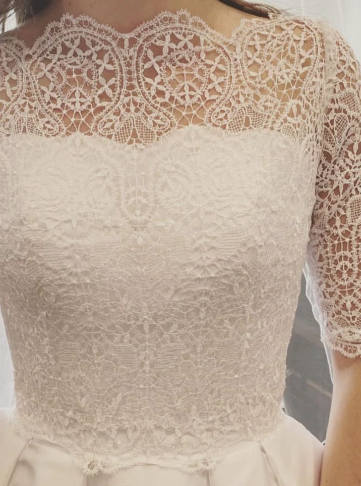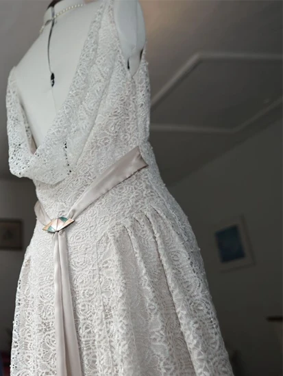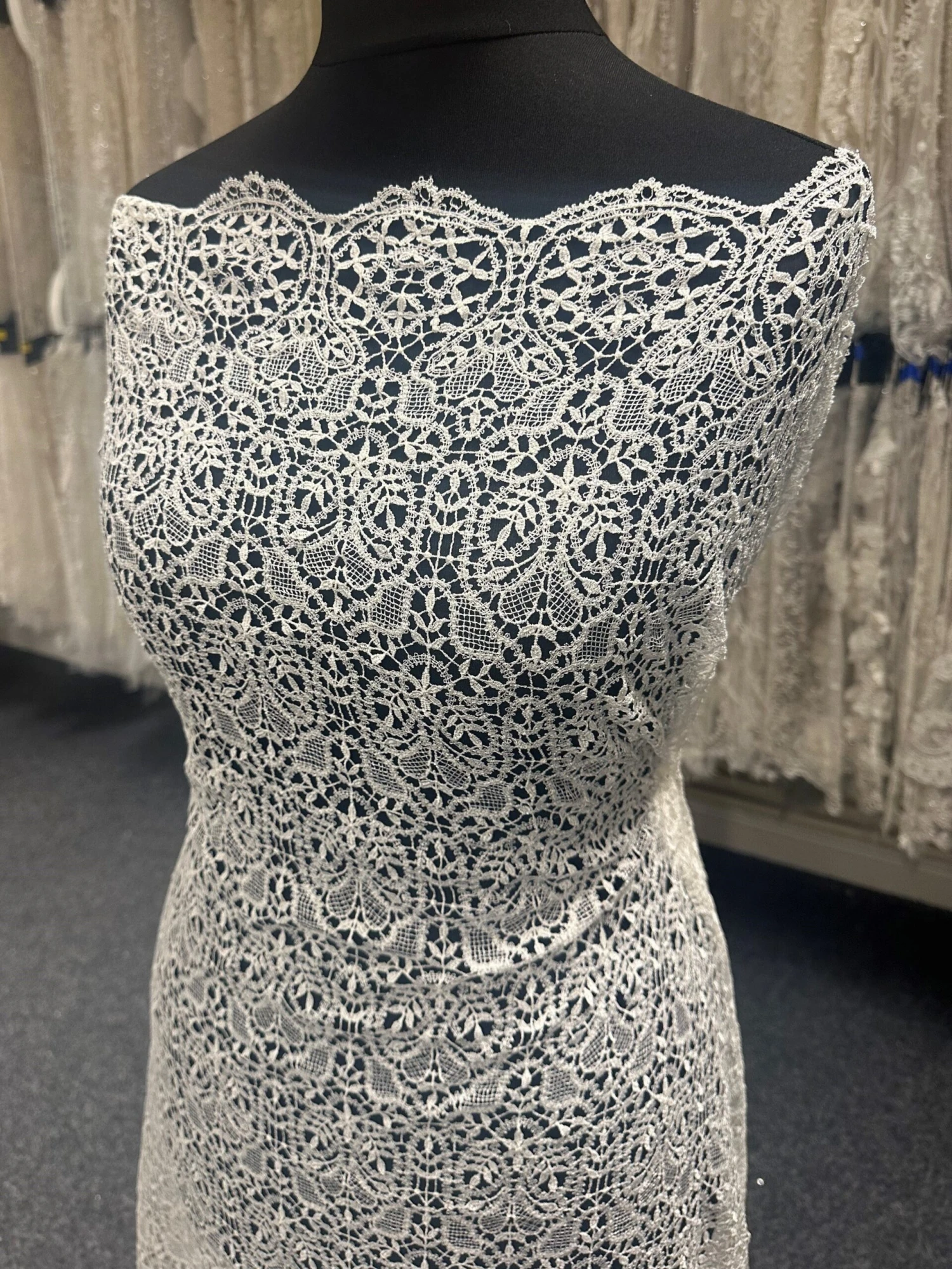 Isabella is a Guipure lace with an art deco theme. This beautiful pattern incorporates flower buds and leaves which are interspersed by small basket weave. Both edges are identically scalloped with a circular pattern of flowers completing the design.
