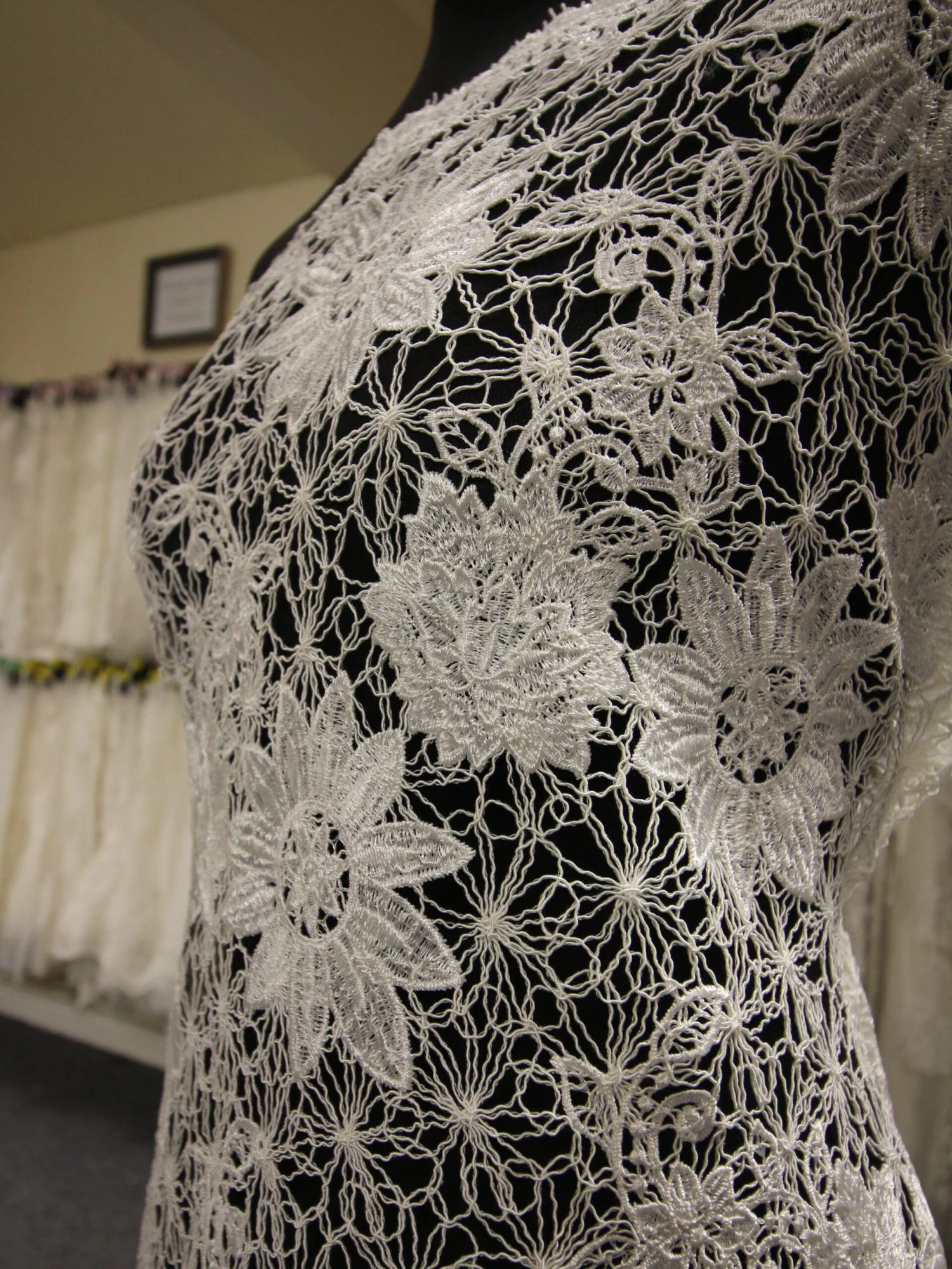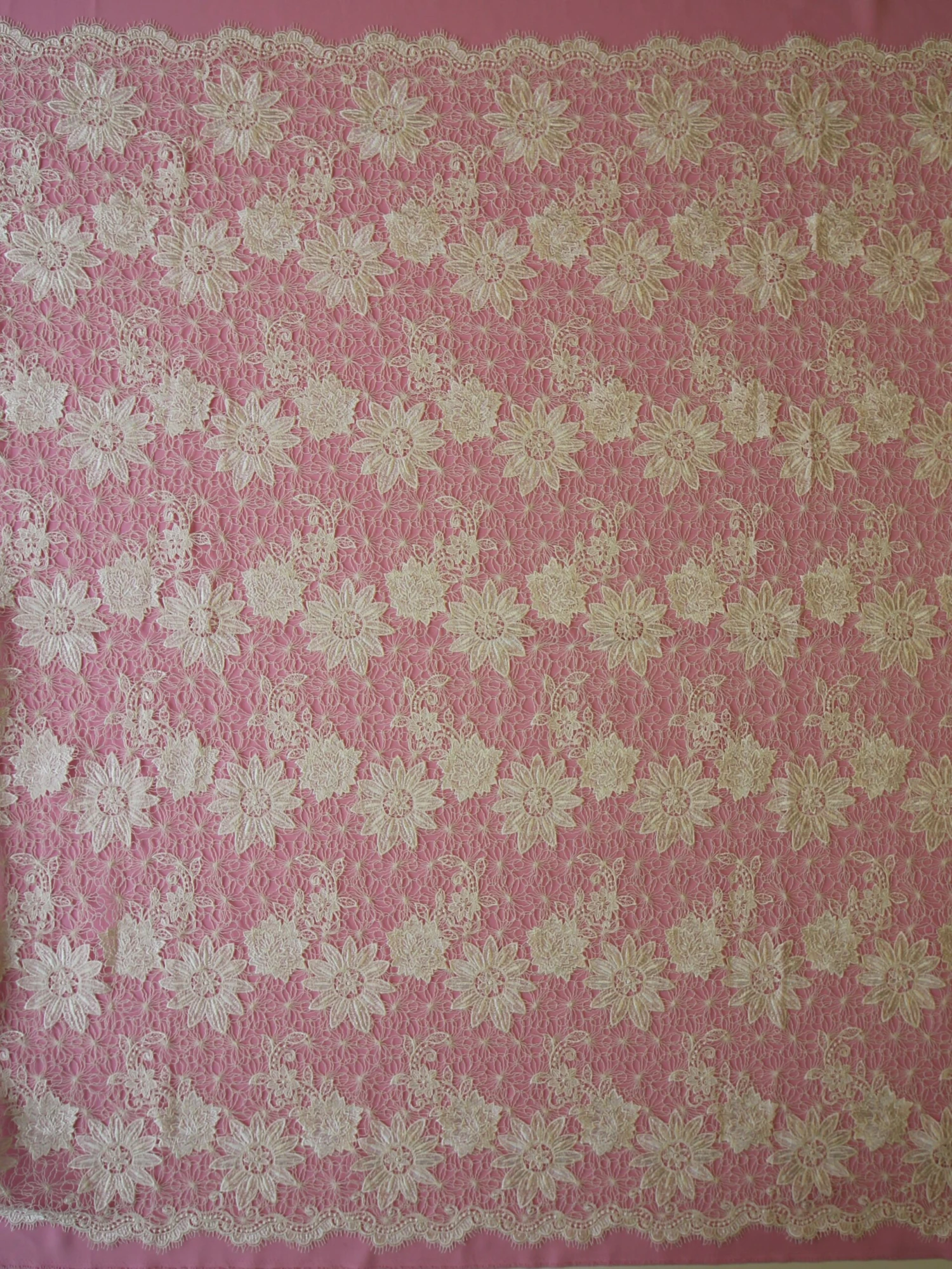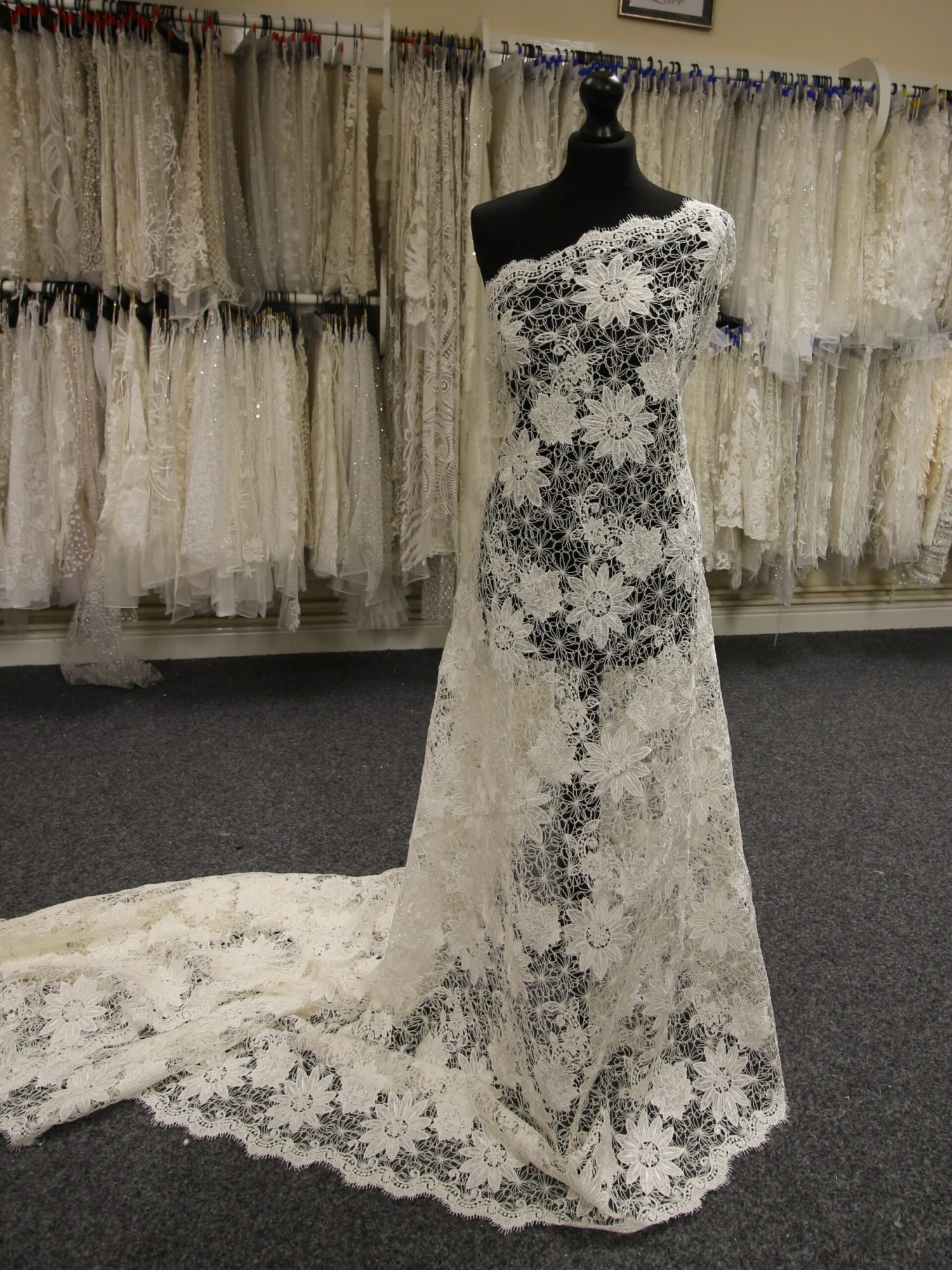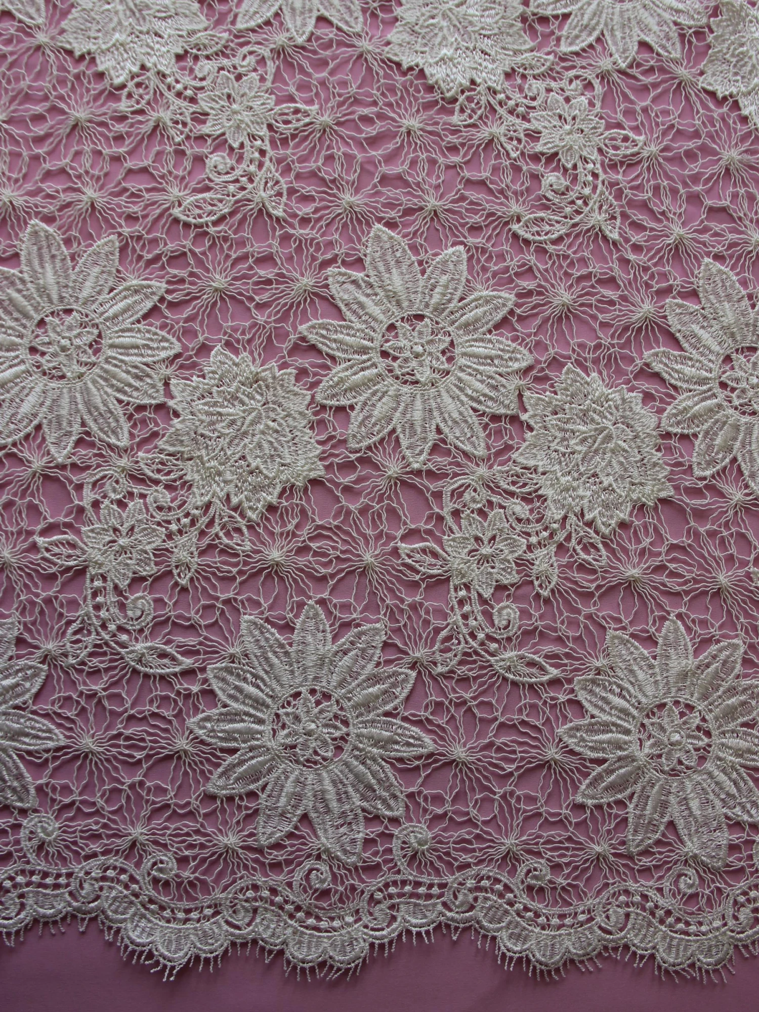 Lola is a glamorous rich ivory Guipure lace. Measuring 132 cm (52″) in width, both edges have a gently scalloped edge, with feminine fringing.
