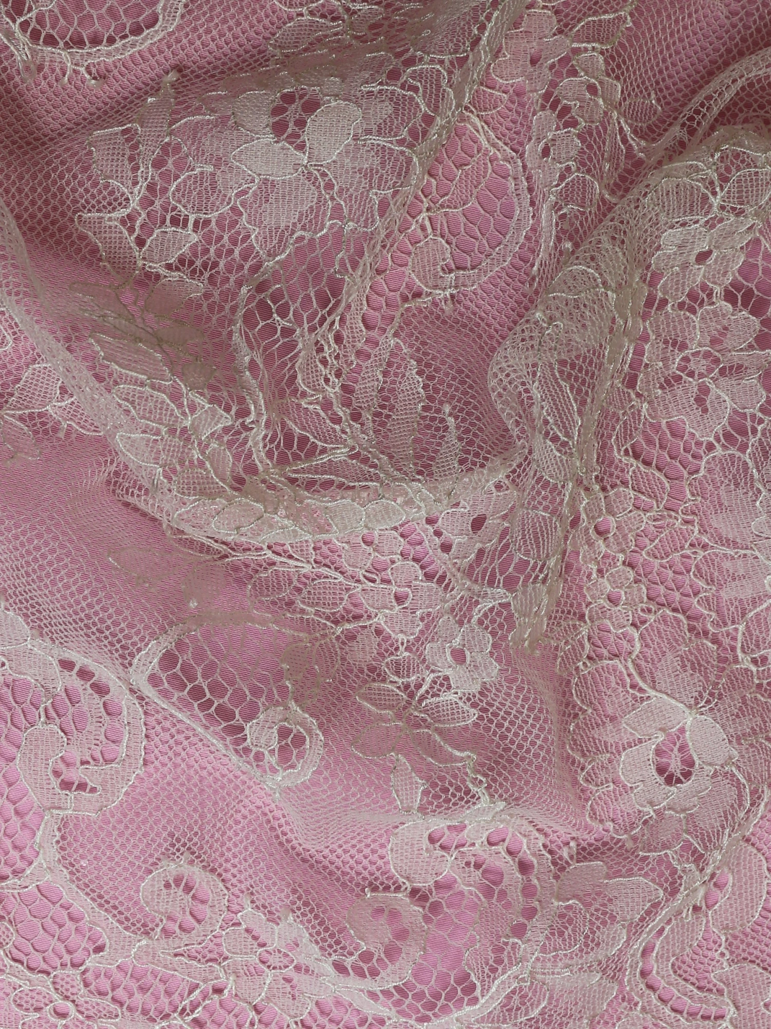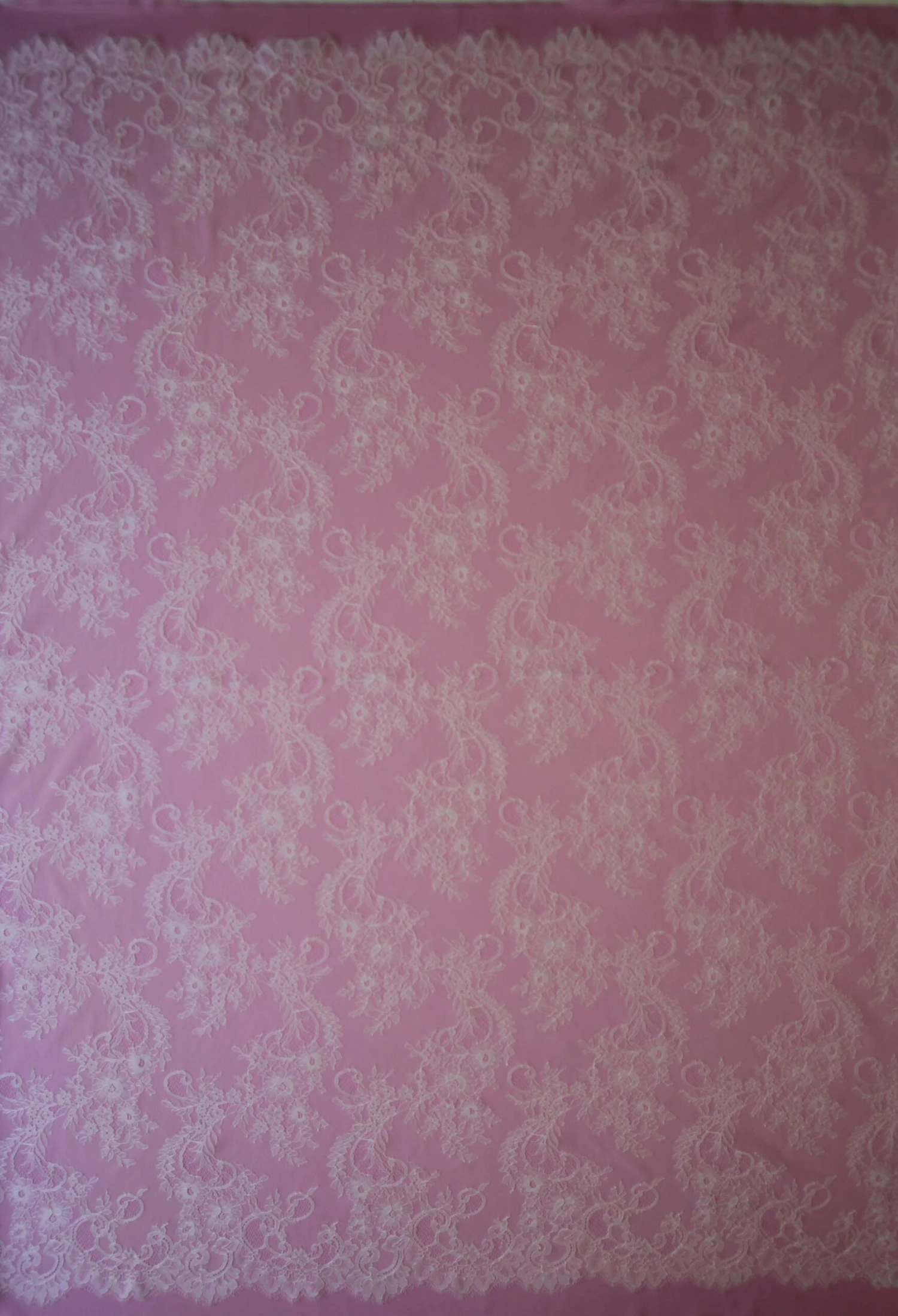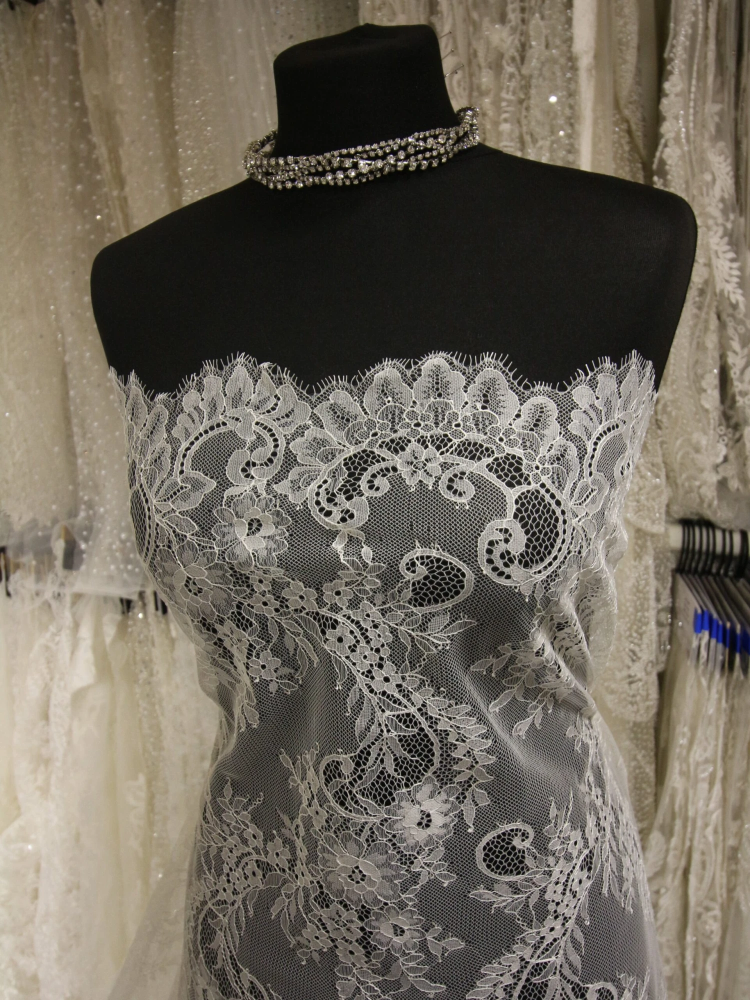 Freya is an extremely feminine floaty lace, that has floral bouquets running through out the body which are embellished with a light cording . A variety of different sizes of weaves are used for the background. The lace measures 142 cm (56″) wide and is available in ivory.