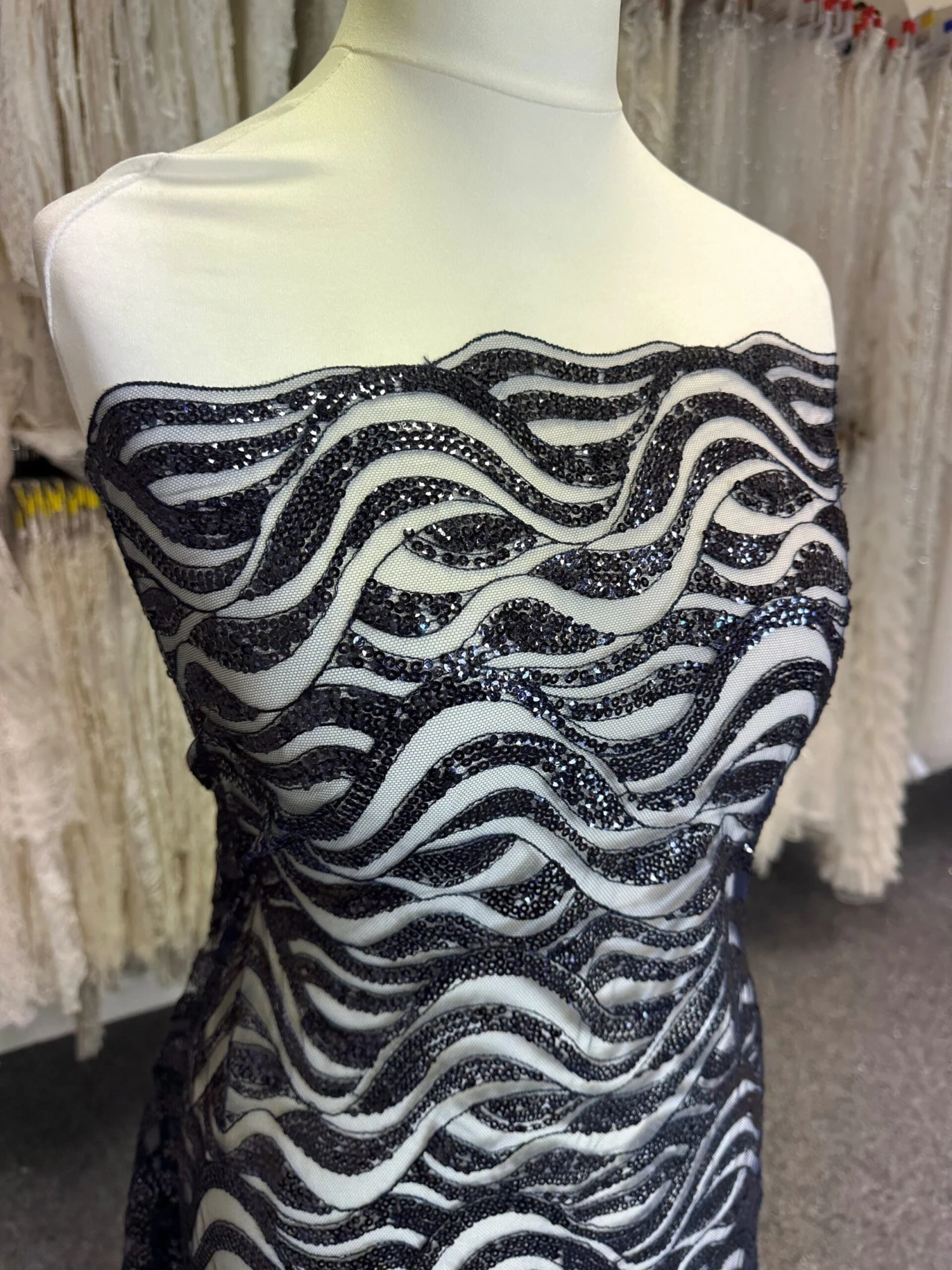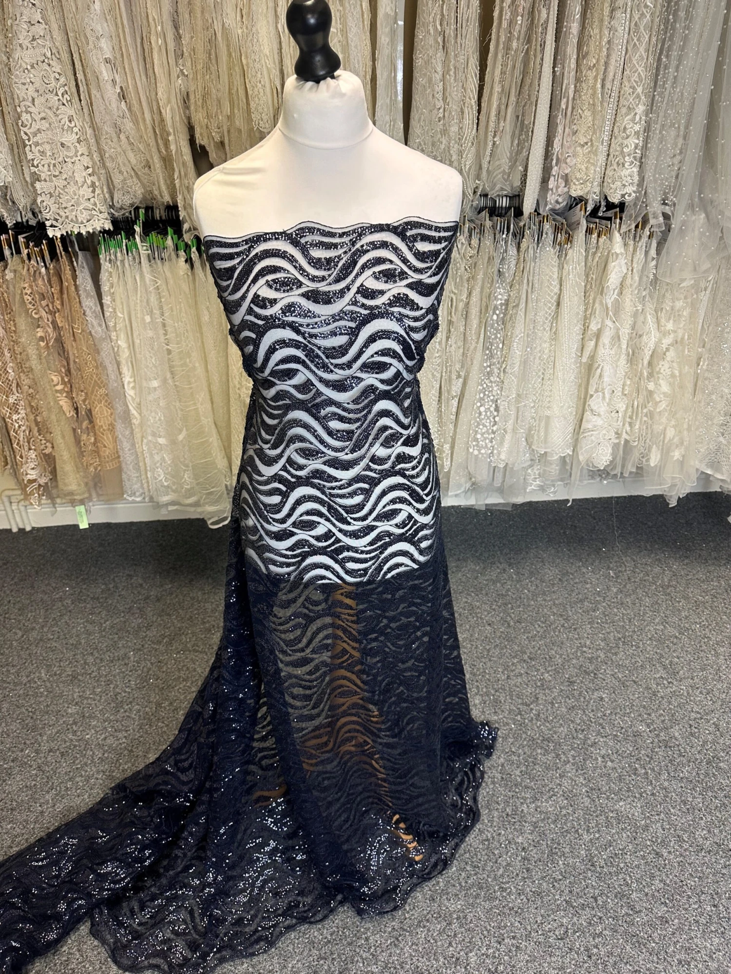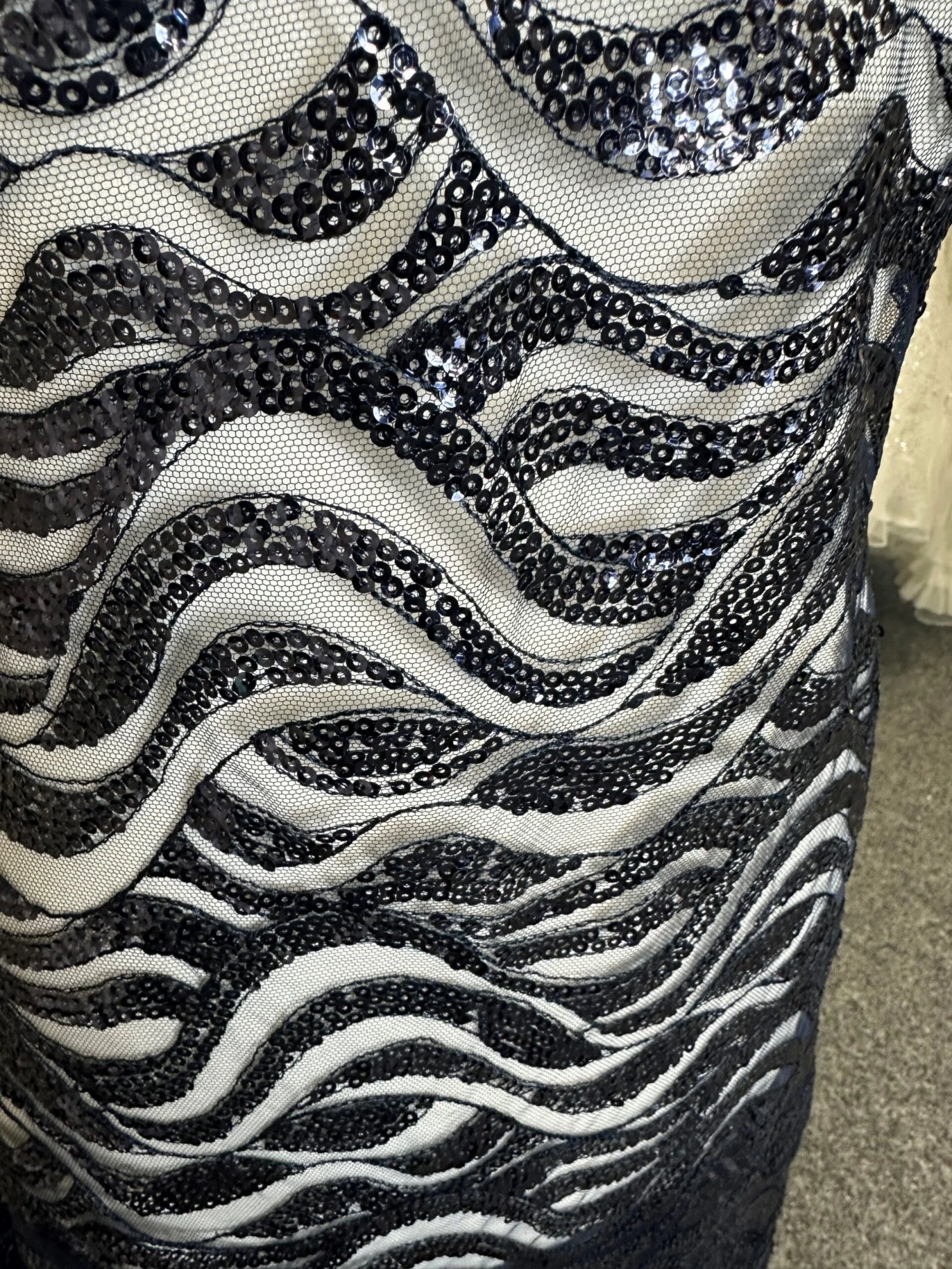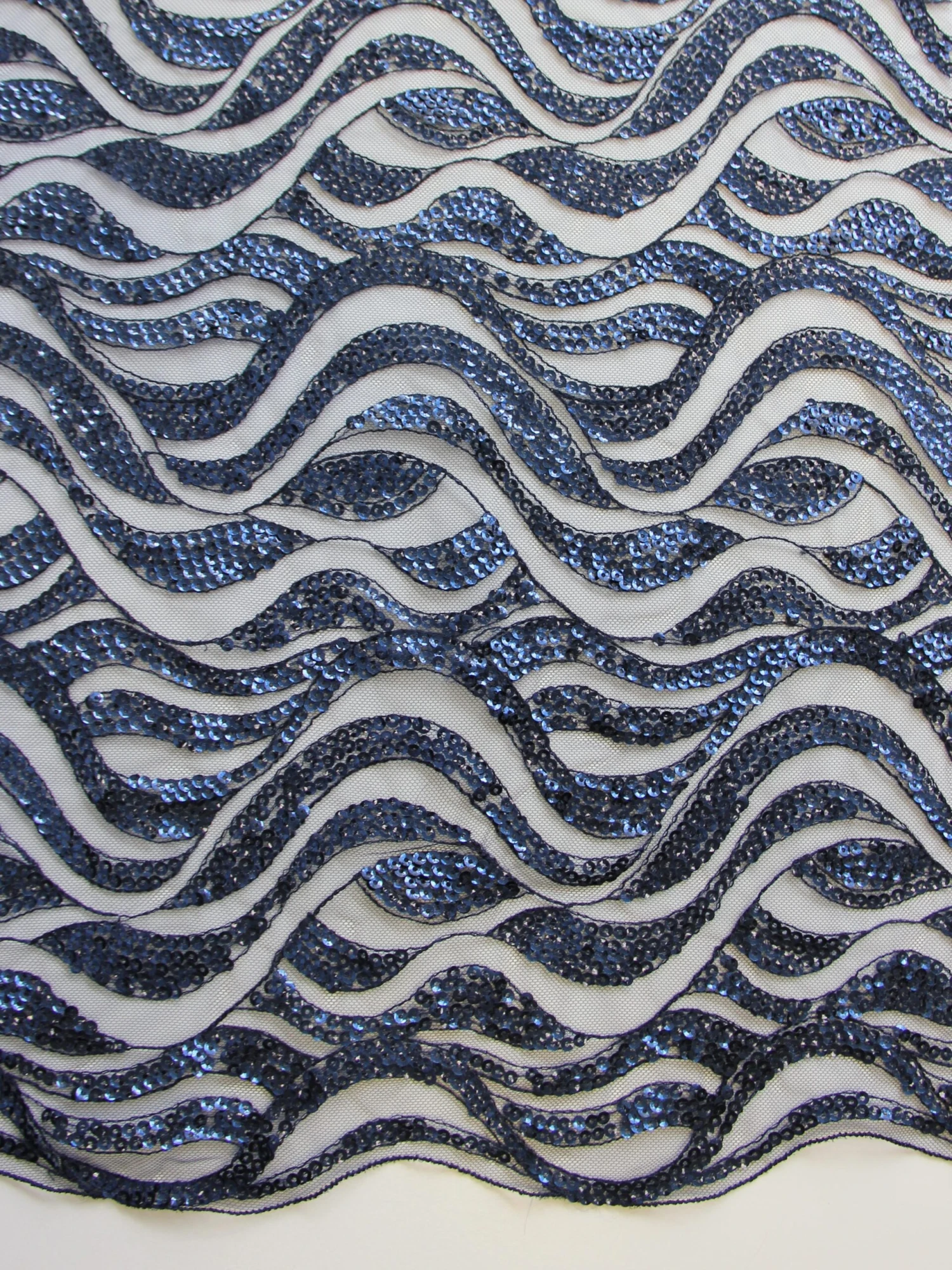 A shimmering navy sequined lace on a navy tulle background that is perfect for evening wear or mother of the bride, which measures 132 cm (52″) from edge to edge.