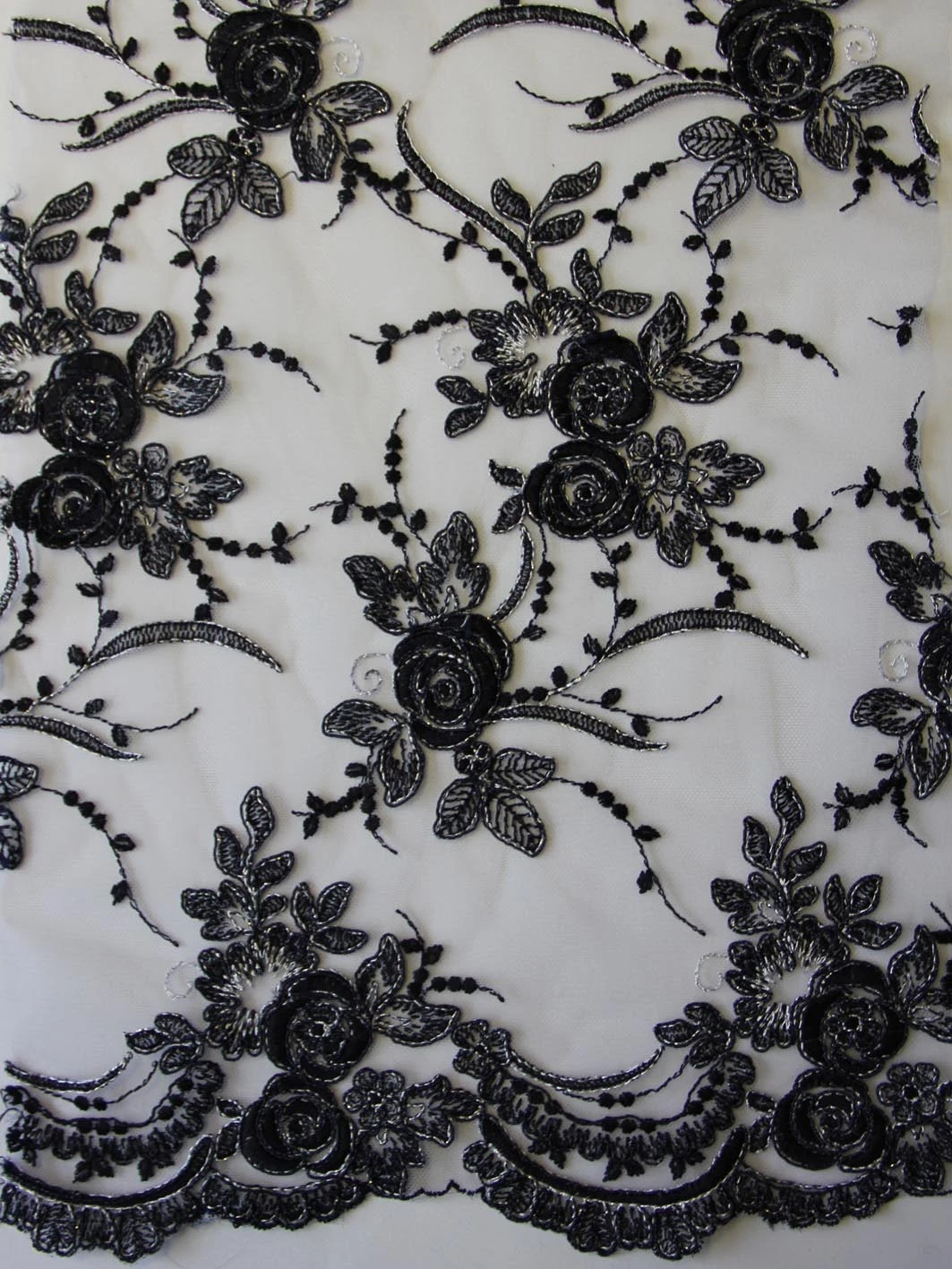 A Navy Blue corded border lace on a fine tulle ground that measures 132cm (52″) wide.