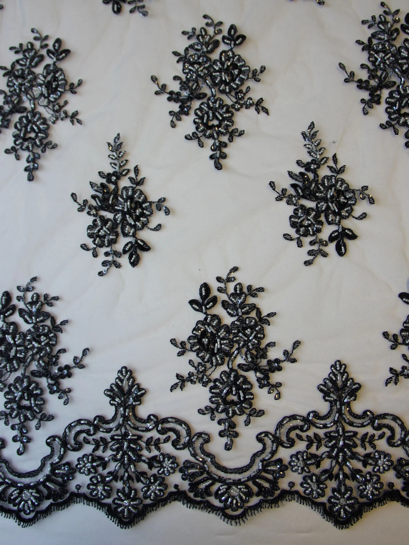 This is a Navy Blue lace with beaded and corded embellishment on a fine tulle ground, measuring 132 cm (52″) wide. Three flower motifs alternative with 2 two flowered motifs. The corded flowers are enhanced by beads and sequins on an embroidered ground, whilst a silver filigree thread is used to highlight the flowers and buds. The identical borders are scalloped edged, the depth of which is 15 cm (6″) . The border consists of two, 5 flower scalloped designs, which are corded. The flowers are heavily embellished with tubular beads and once again a silver filigree thread to beautiful effect.