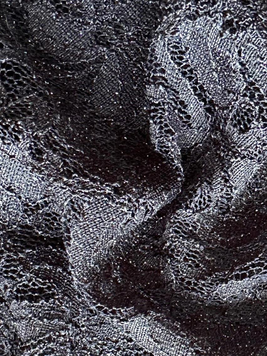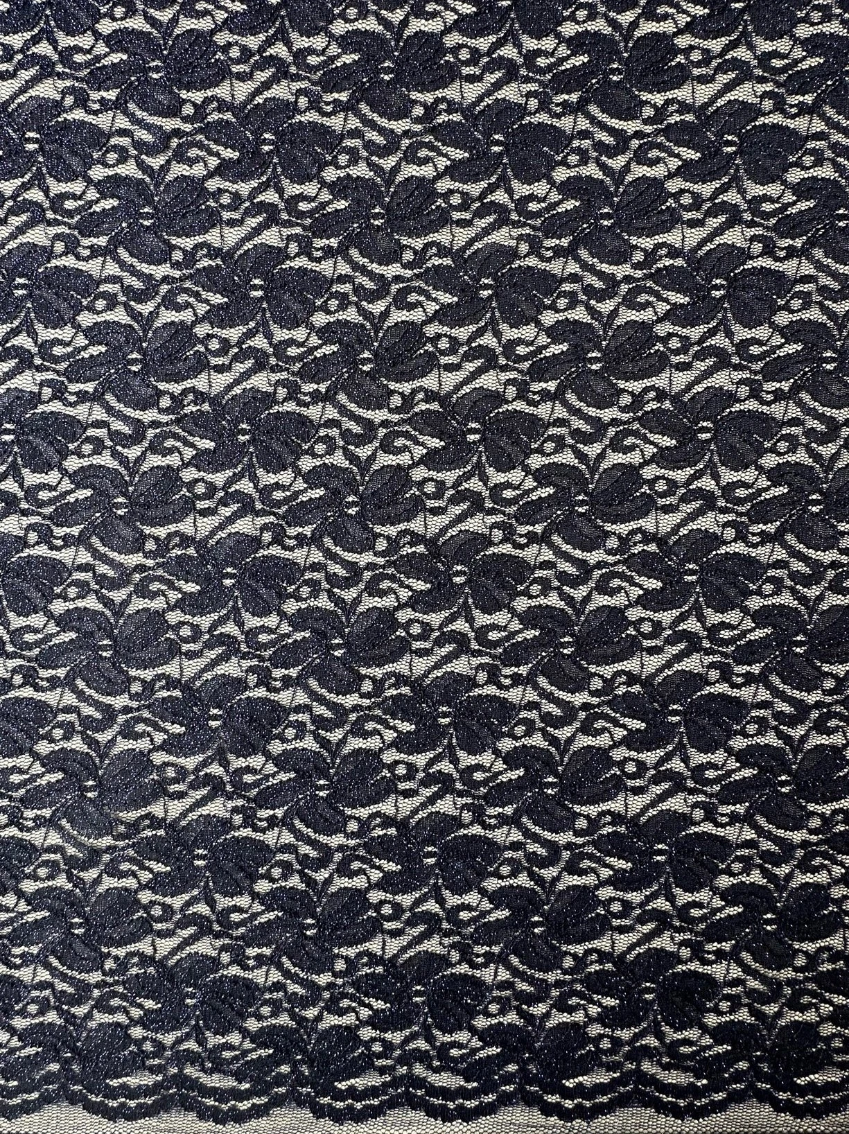 Vindication is a glitter lace with stretch that is designed to offer superior flexibility and durability. The fabric measures 145 cm (53″) wide and features an opulent floral pattern with matching scalloped edges. You can see this lace here in navy blue but it is also available in a range of other colors.