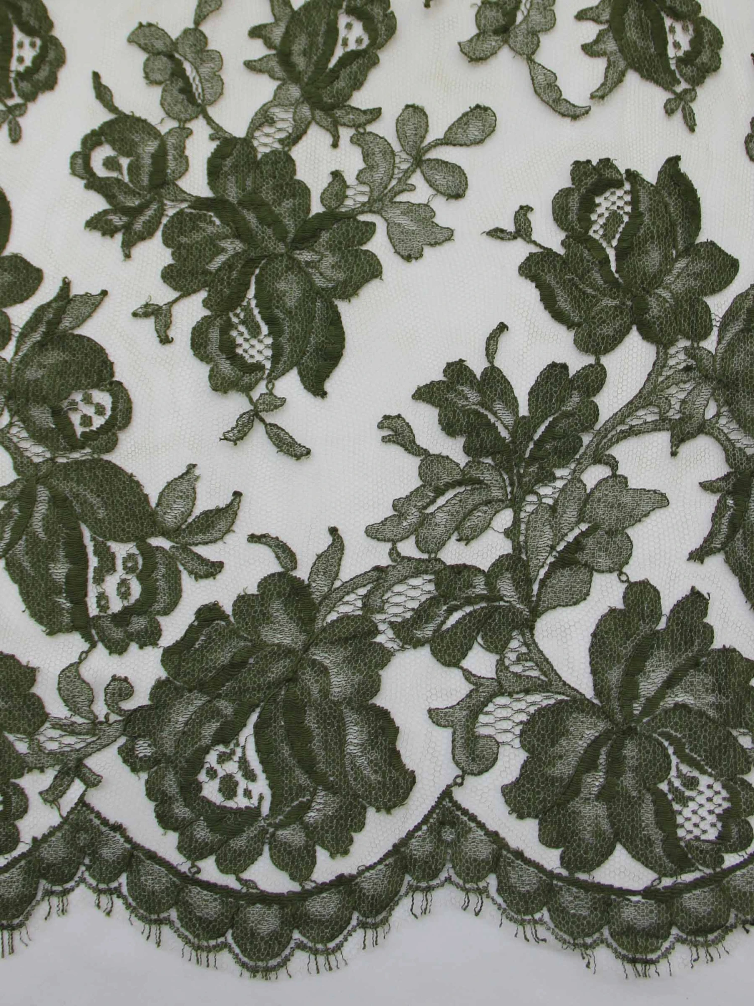 Harper is a glamorous French Chantilly Lace measuring 92 cm wide and is available here in olive green.