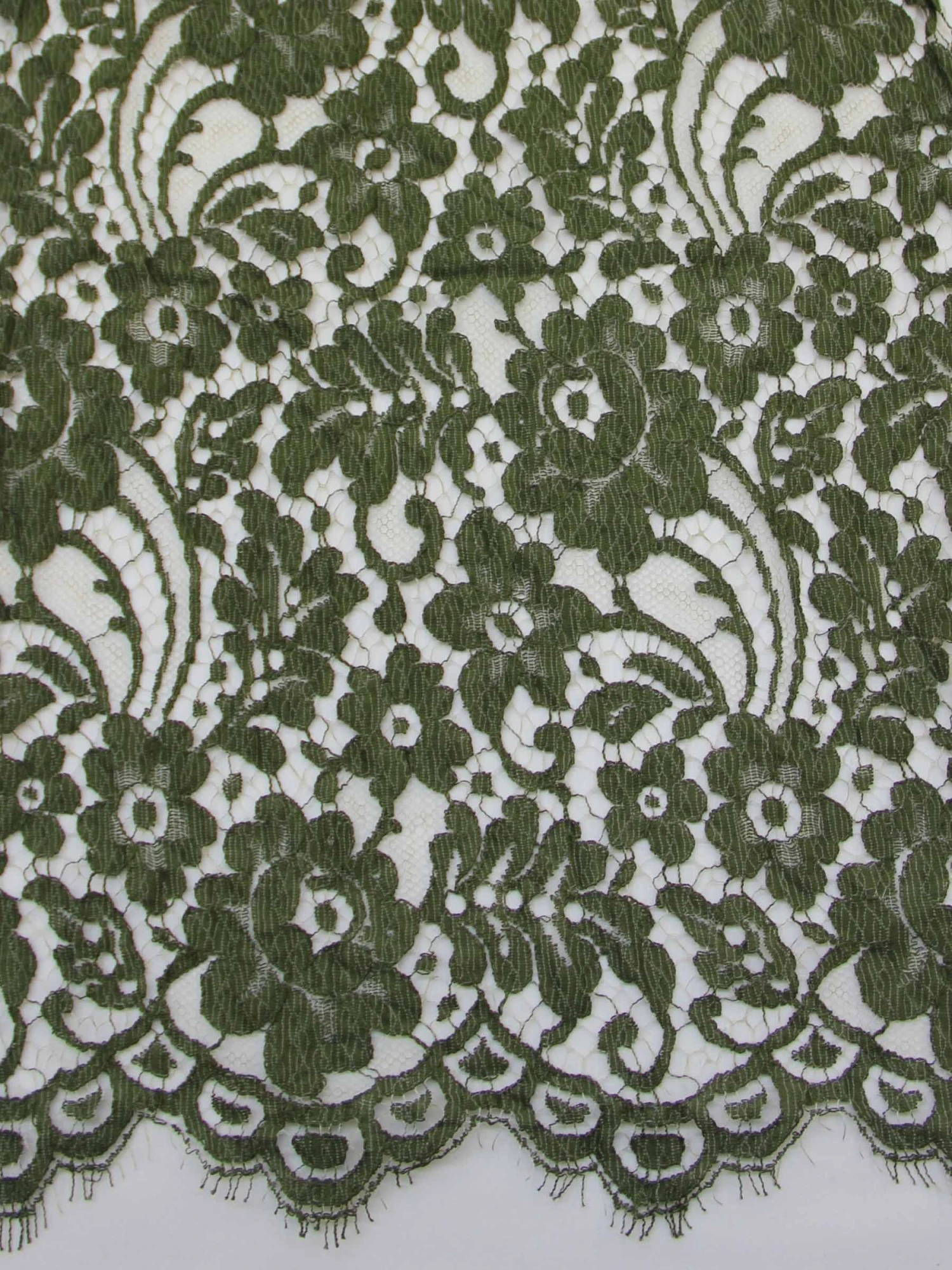 This beautiful olive green lace originates from the Chantilly area in Northern France and measures 90 cm wide. Both borders are scalloped and fringed.