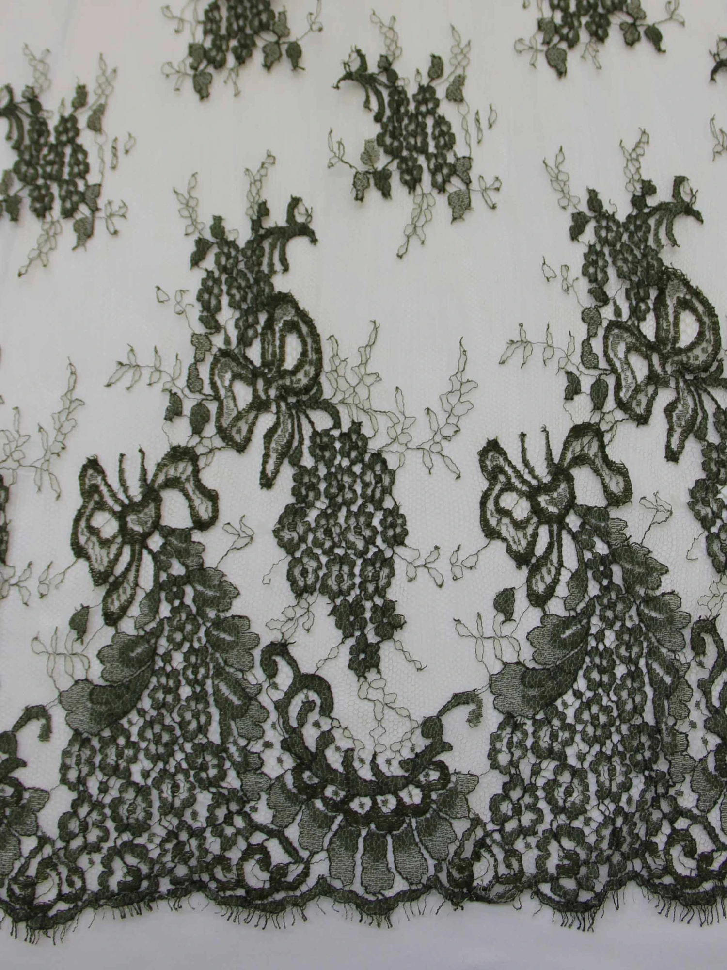 Lillian is a very classic looking French Chantilly Lace Fabric in olive green. It measures 92 cm (36″) wide and has matching scallop edged and fringed borders.