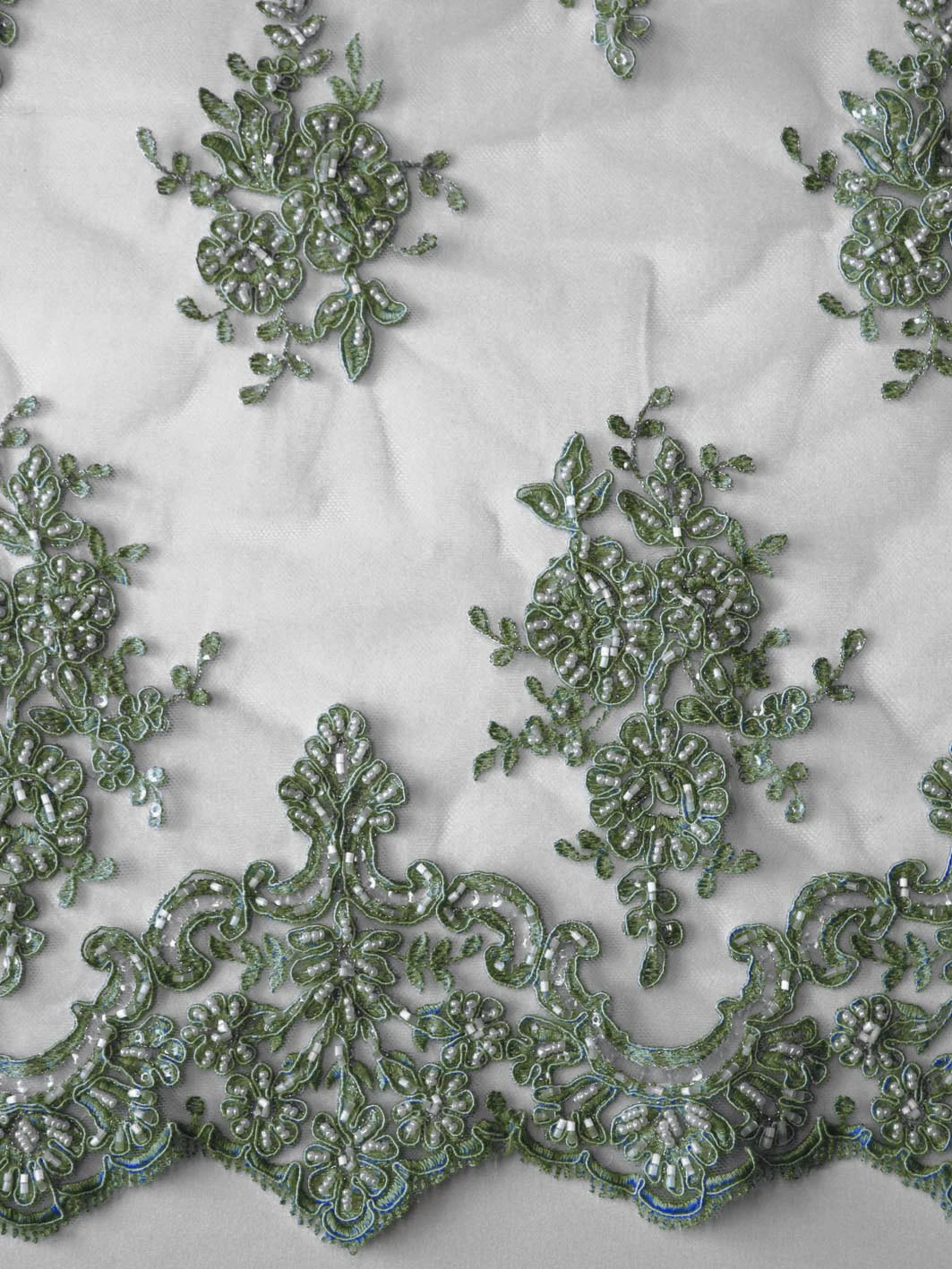 Sophia in Olive Green is a beaded and corded border lace on a fine tulle ground, measuring 132 cm (52″) wide. Three flower motifs alternative with 2 two flowered motifs. The corded flowers are enhanced by beads and sequins on an embroidered ground, whilst a silver filigree thread is used to highlight the flowers and buds. The identical borders are scalloped edged, the depth of which is 15 cm (6″) . The border consists of two, 5 flower scalloped designs, which are corded. The flowers are heavily embellished with tubular beads and once again a silver filigree thread to beautiful effect. Sophia is a tasteful, simple design, which has become a best seller.