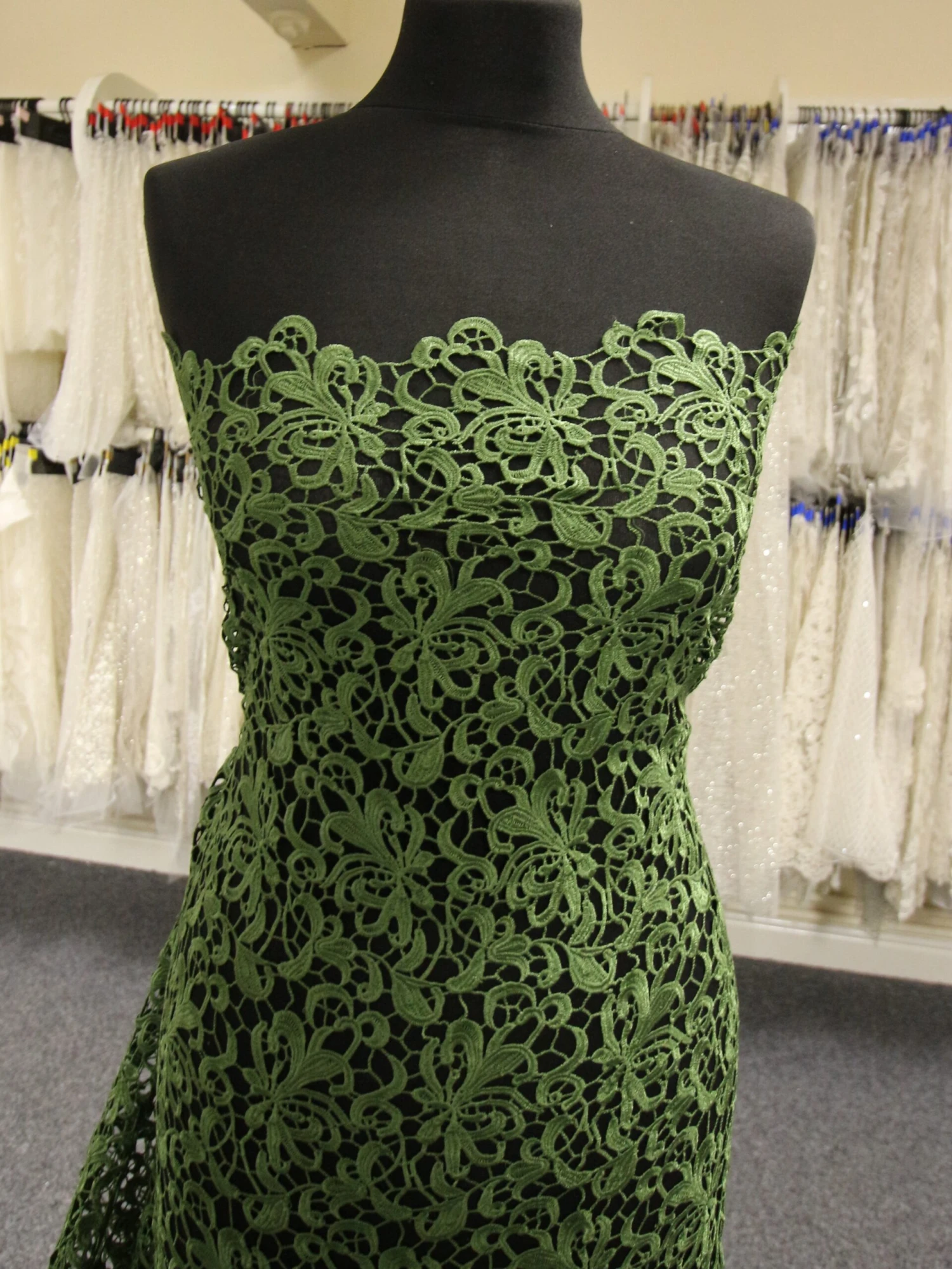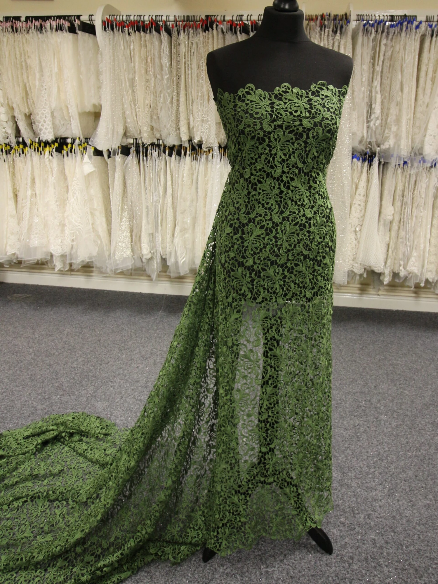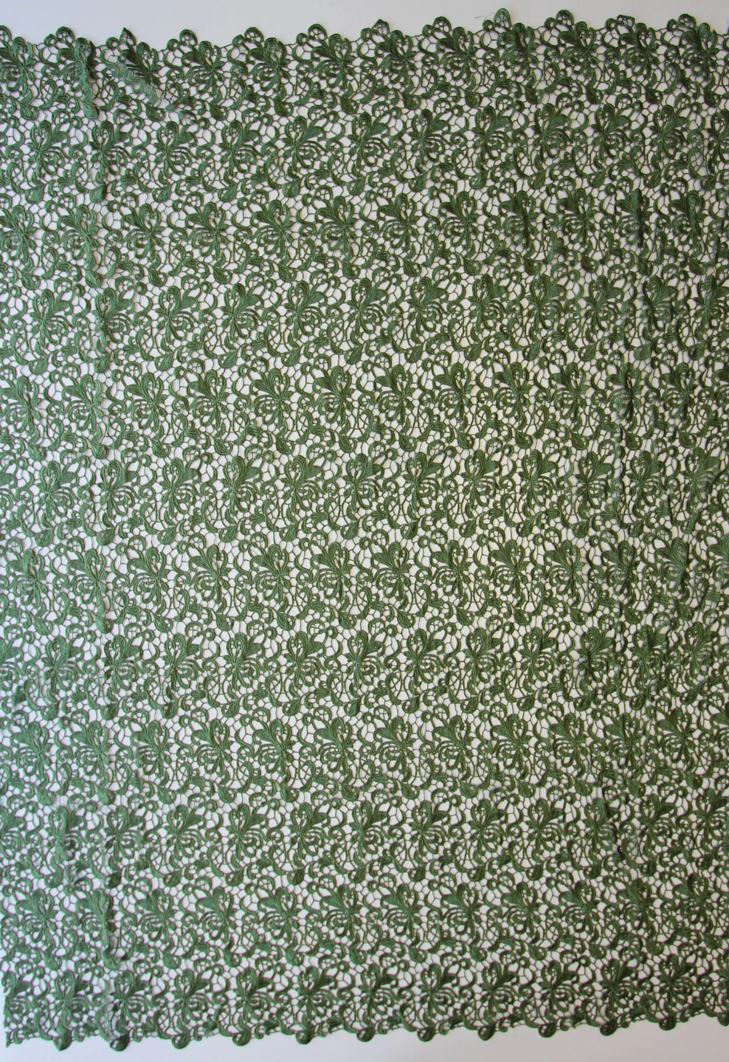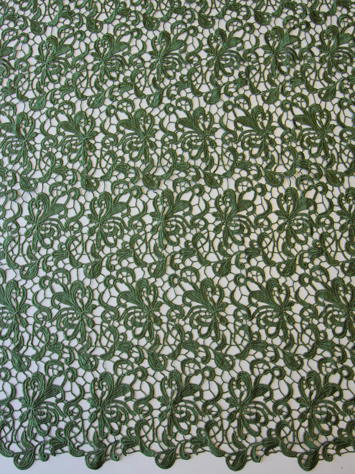 An elegant guipure lace in olive green and which is available in a range of other colours. This lace measures 130 cm (51″) across the width.