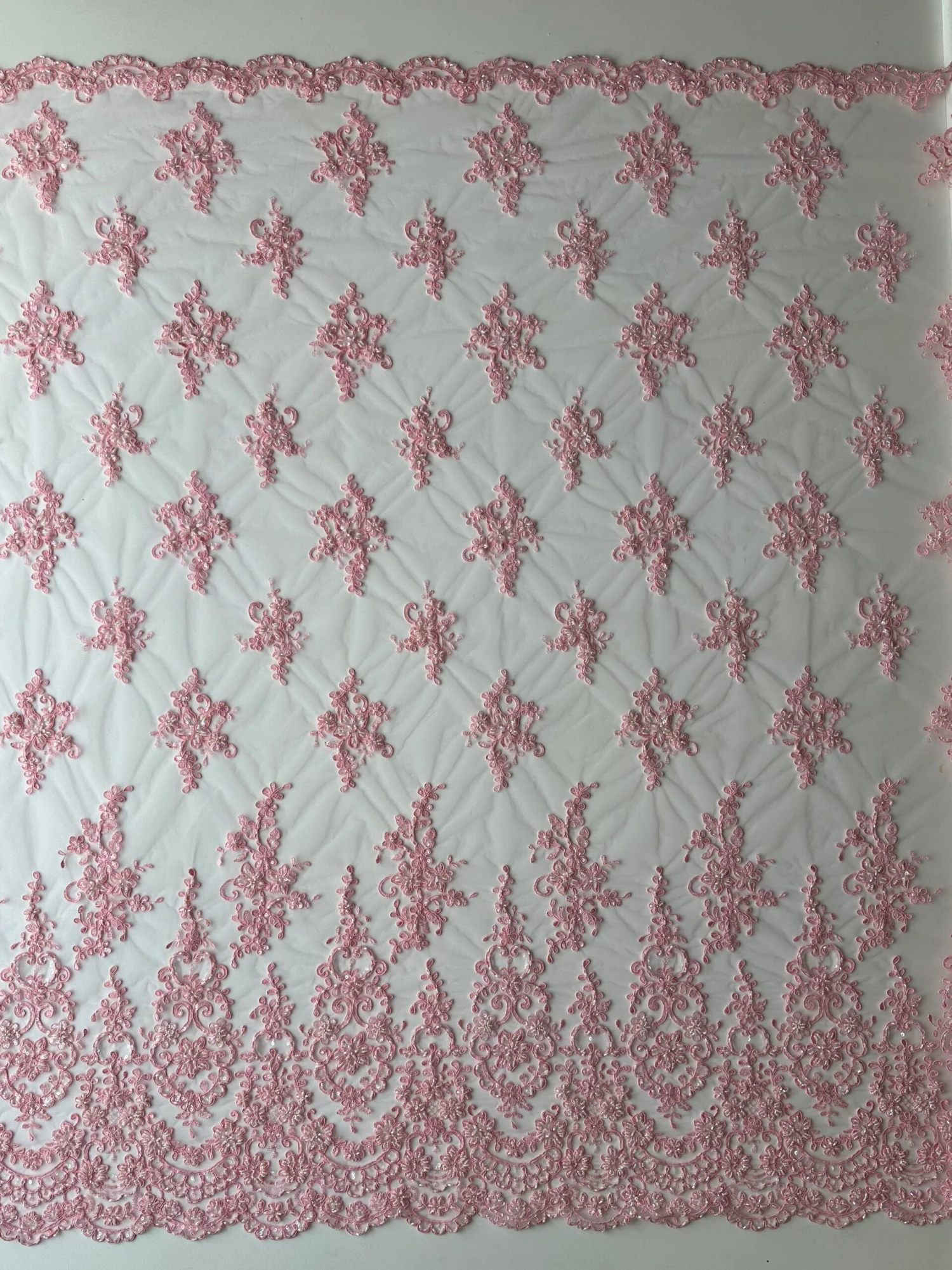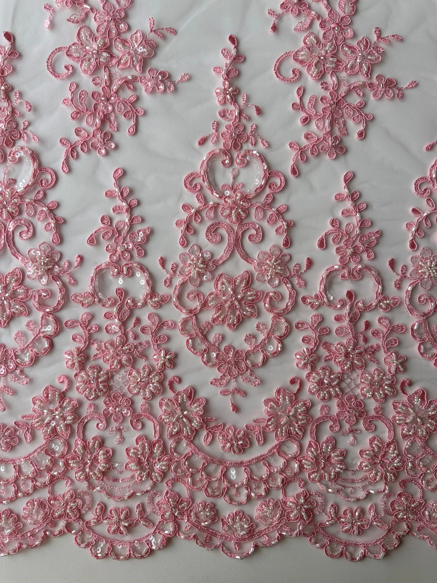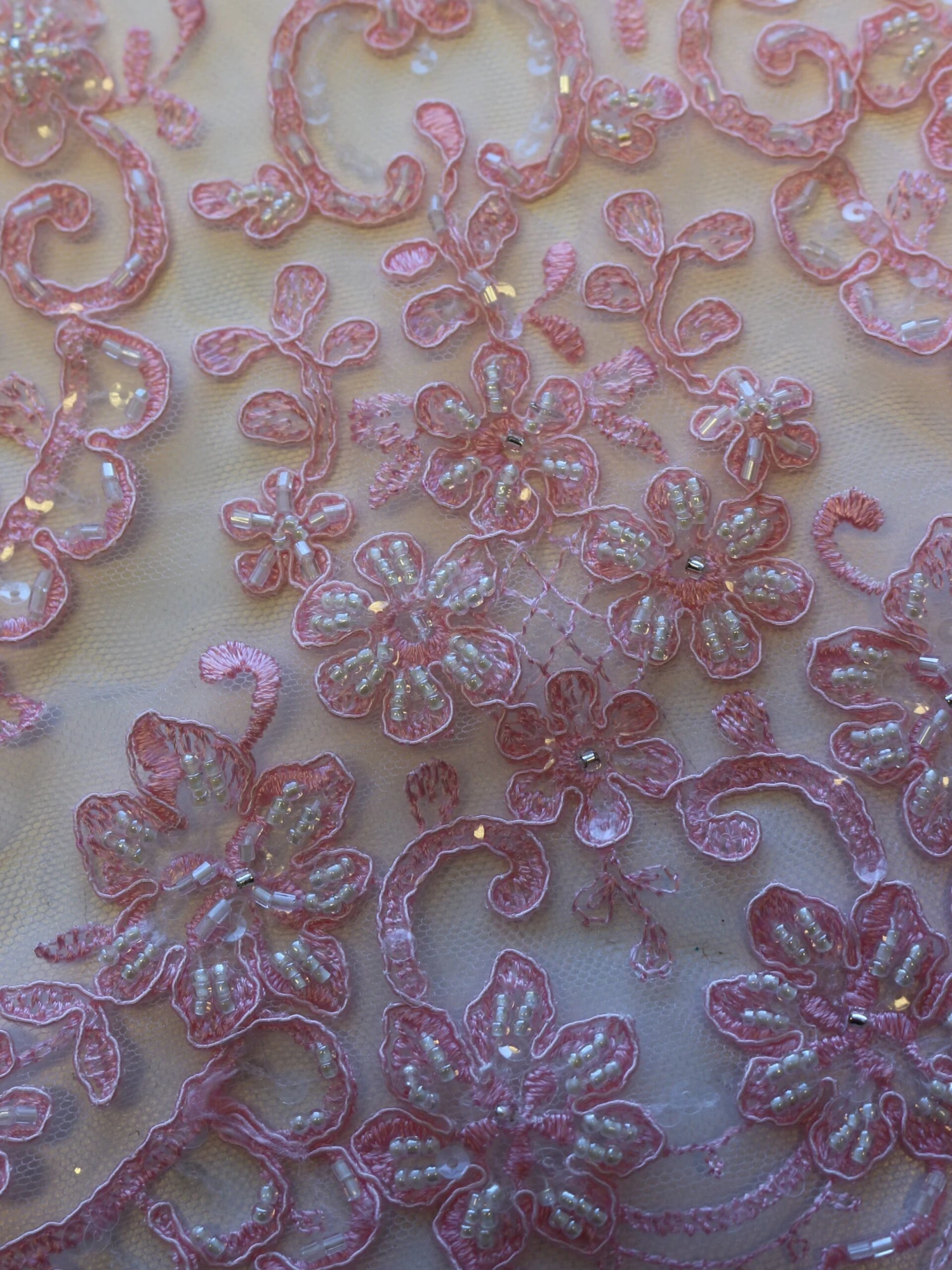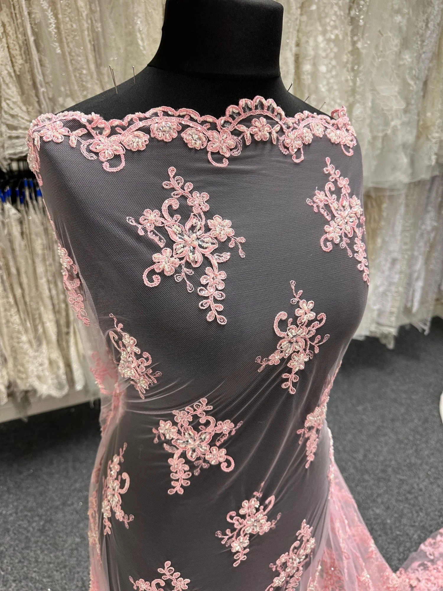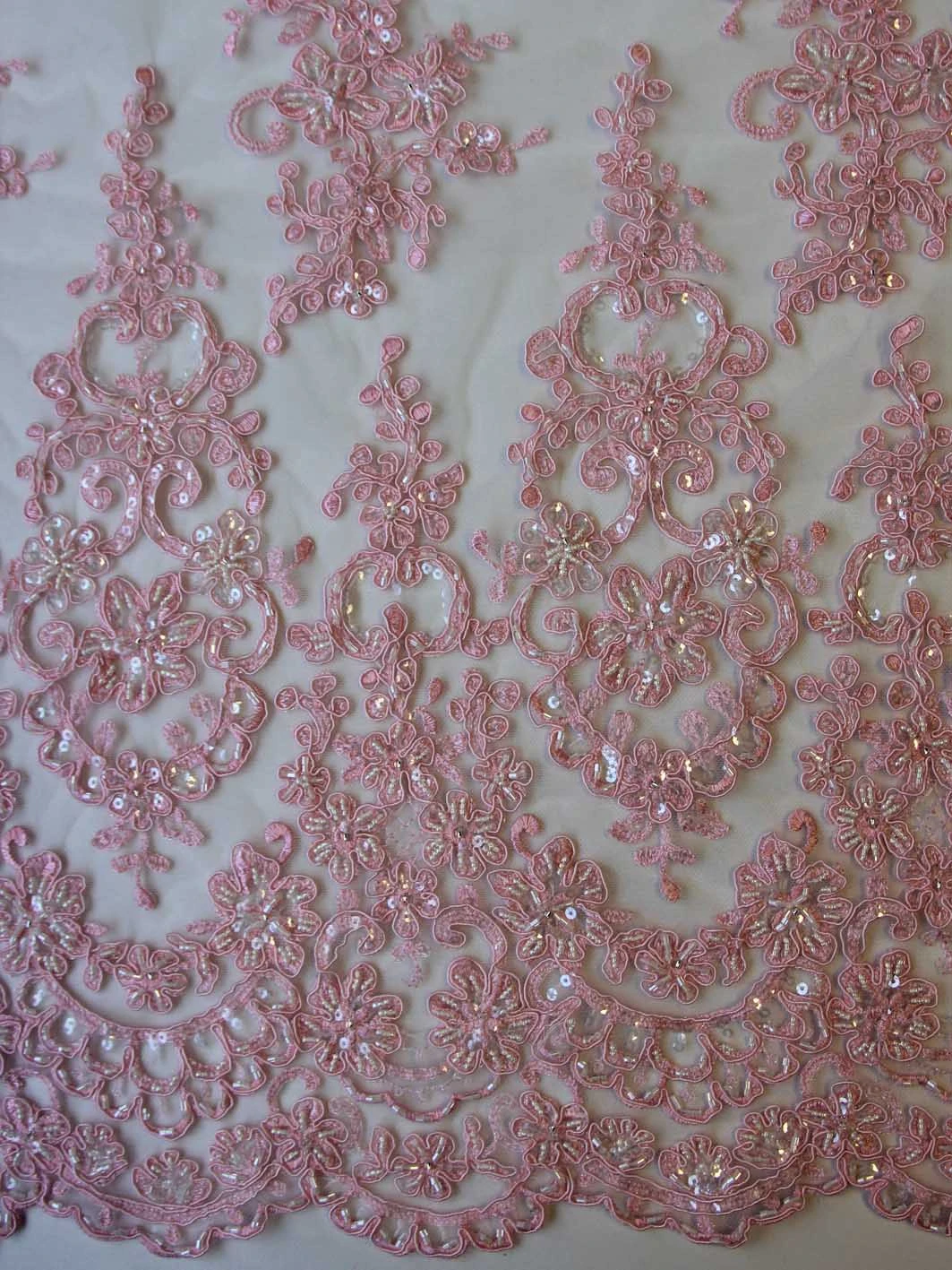 A pale pink Lace in the same base design as Alexandra Bridal Lace . It is a heavily beaded and corded Border Lace on a fine tulle ground. The floral motifs are finely corded with sequins, beads and diamantes.