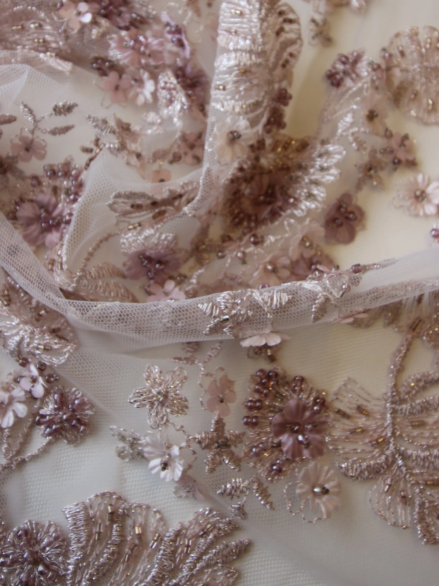 Absolutely breathtaking! This lace is a fusion of beautiful base embroidery featuring an attractive leafy design, beautiful 3D flower detail and gorgeous yet subtle beading. The colors are especially appealing for alternative brides, mother of the bride and any occasion wear.