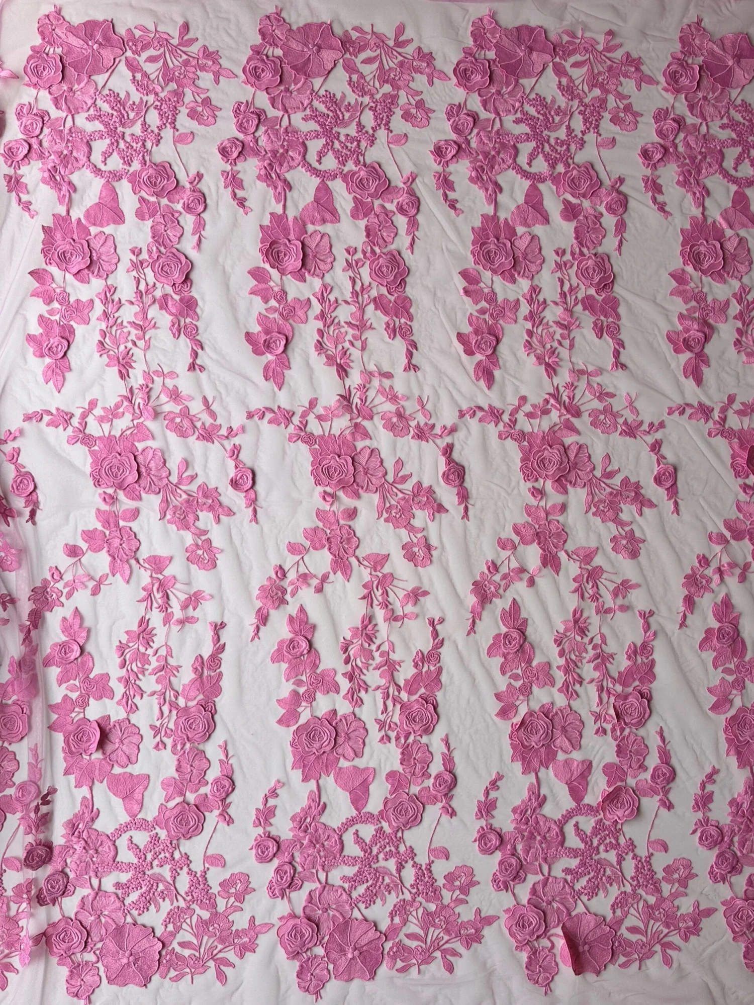 Meghan is a bold and beautiful vivid pink lace that is expressive and harmonious. Travelling up the tulle are bold flower motifs, some of which are 3D appliques, with leaf and smaller floral designs, including buds, flourishing over the tulle base. The pattern repeats on 33 cm (13″).