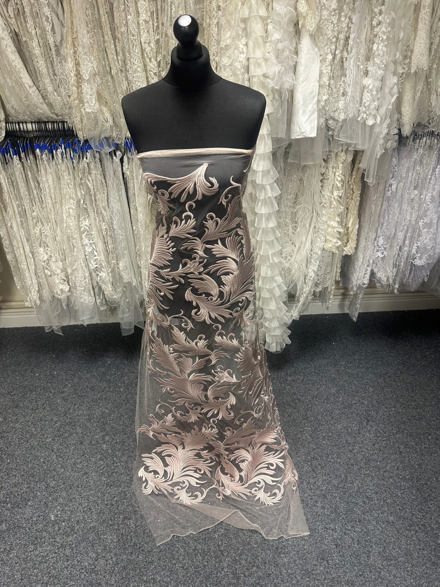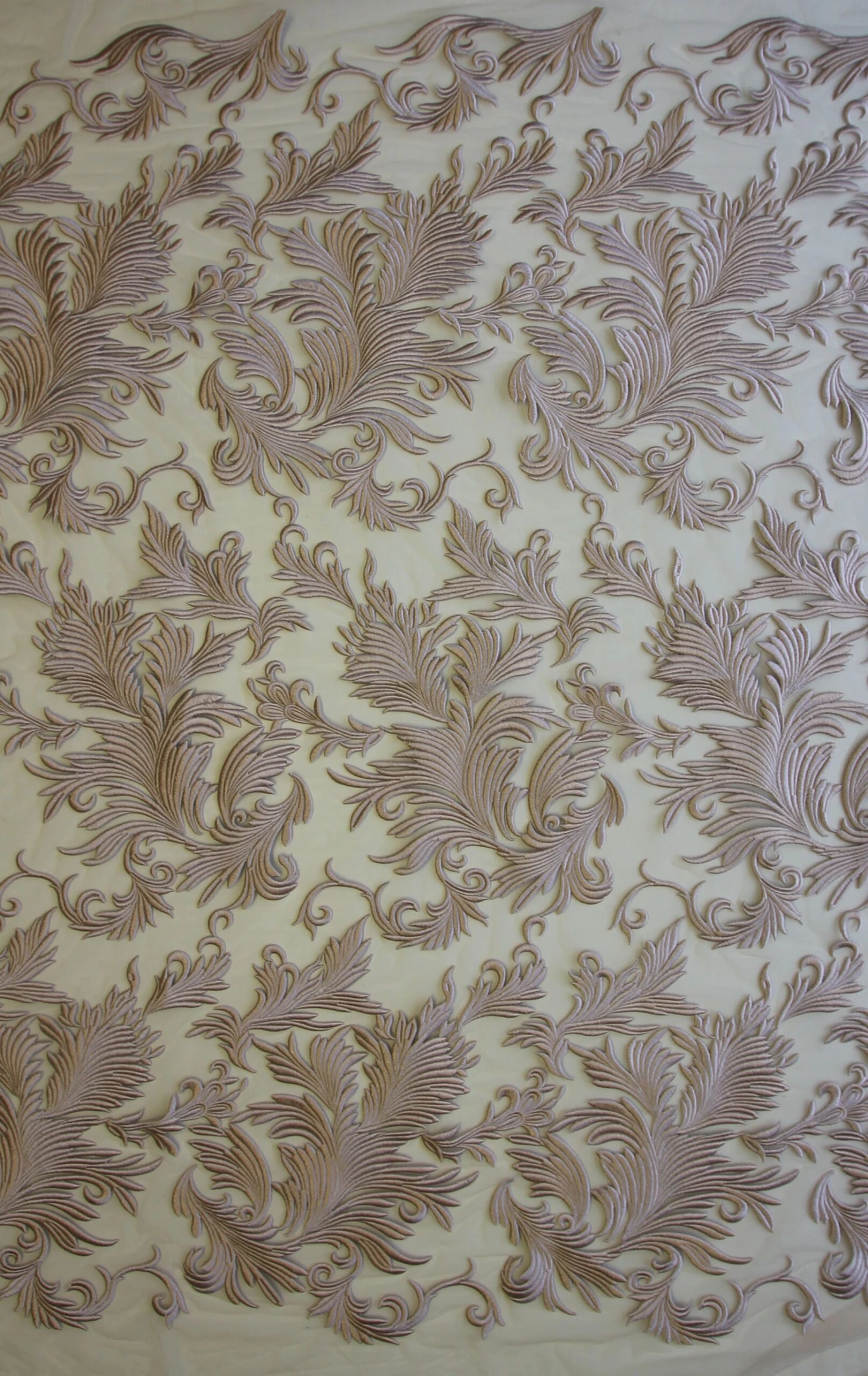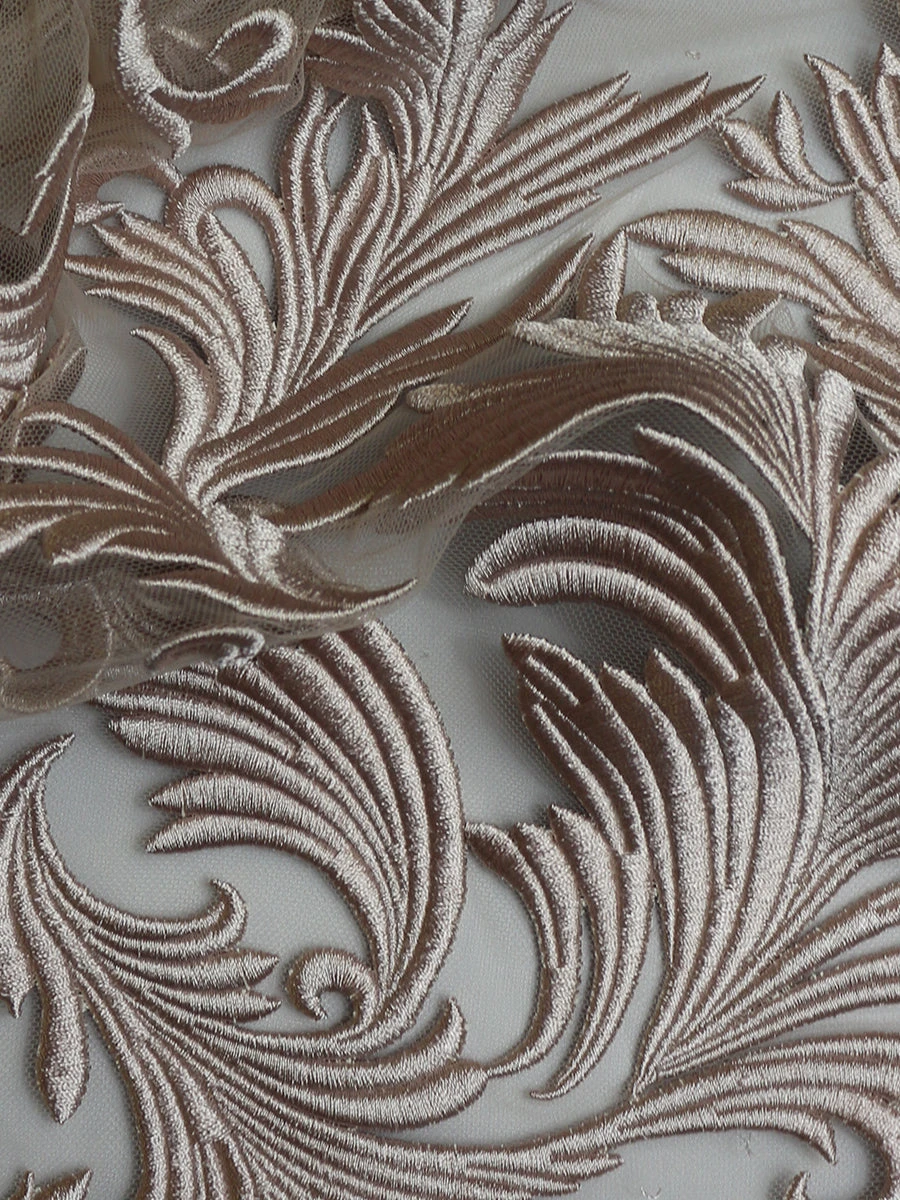 A striking large leaf like design dominates this dusky pink embroidered lace called Autumn. With dense embroidery adding definition to the motifs, this lace has a stiffer and heavier handle than most. On a rose tulle base, the silky threads of the embroidered motifs are resplendent in the light. This lace measures 138 cm (54″) wide. Order your free sample today.