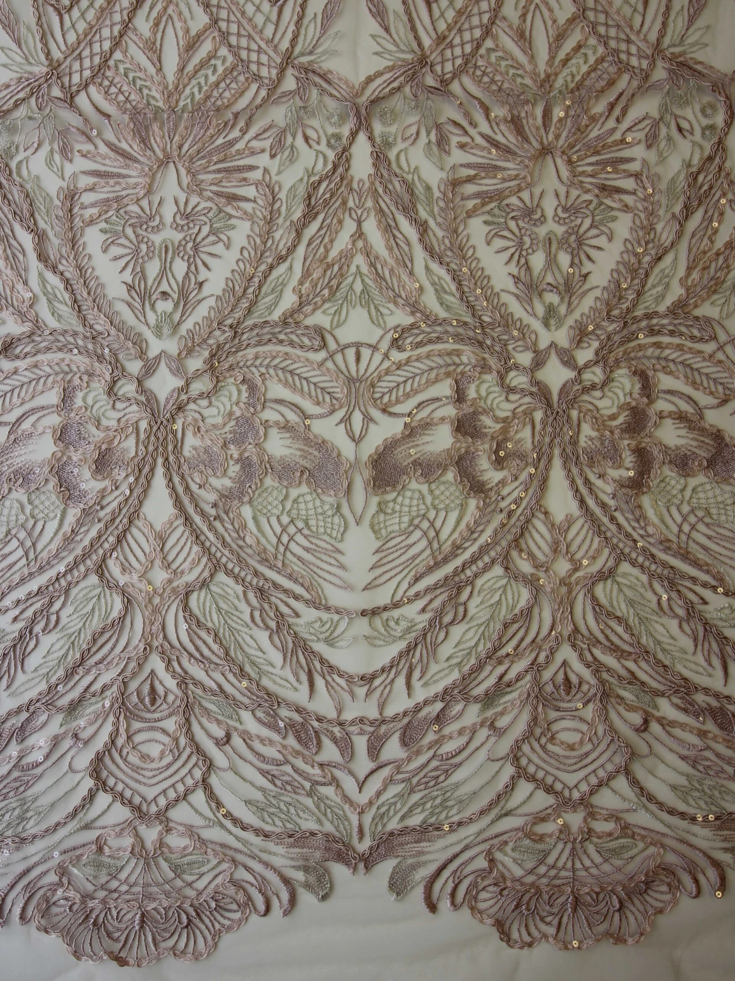 An extremely attractive pink embroidery lace with silver detailing that measures 132 cm (52″). The base is a blush tulle that has a dramatic pattern that repeats on 32 cm (13″). The embroidery has been embellished with cording and clear colourless sequins to great effect.