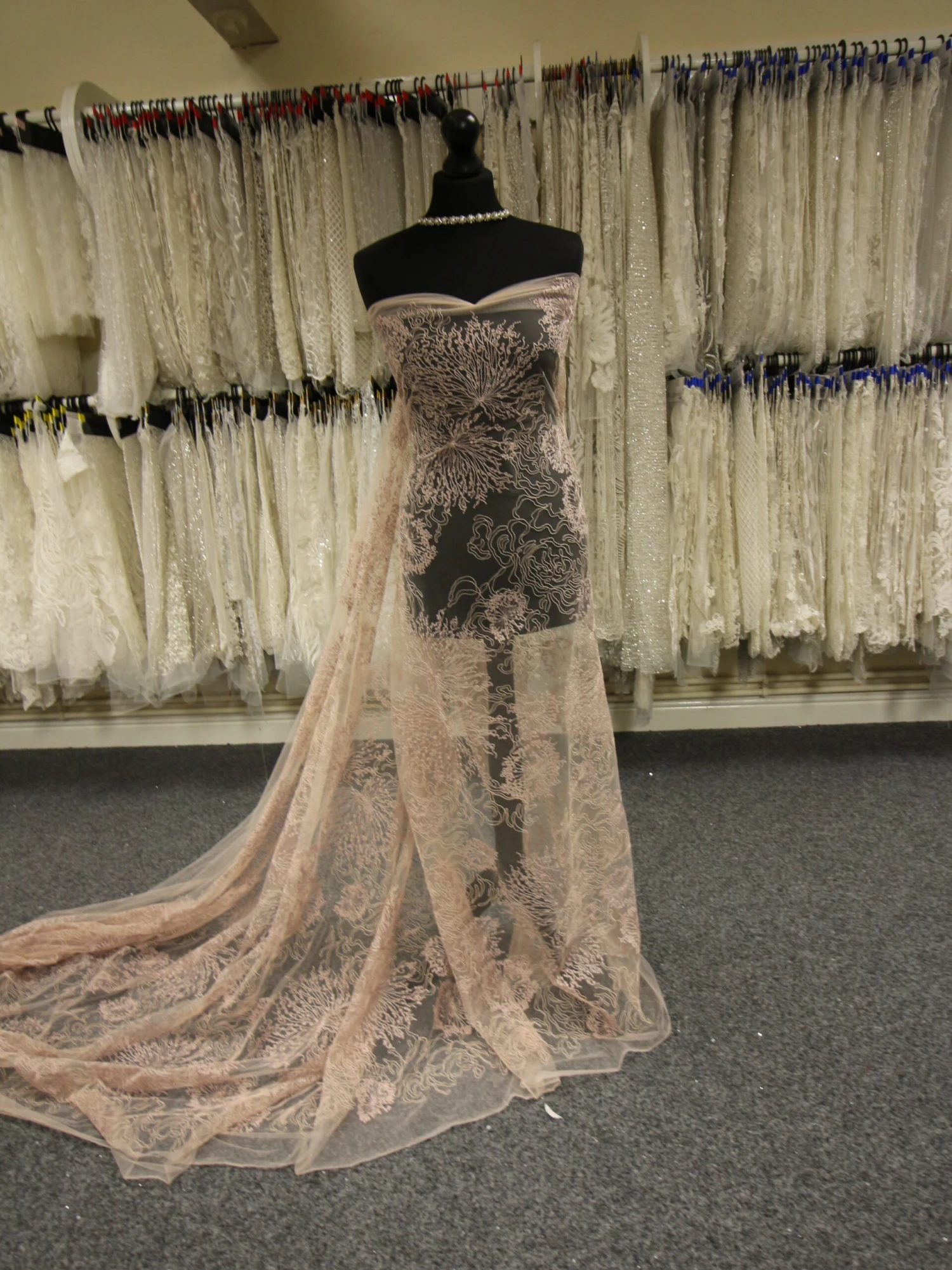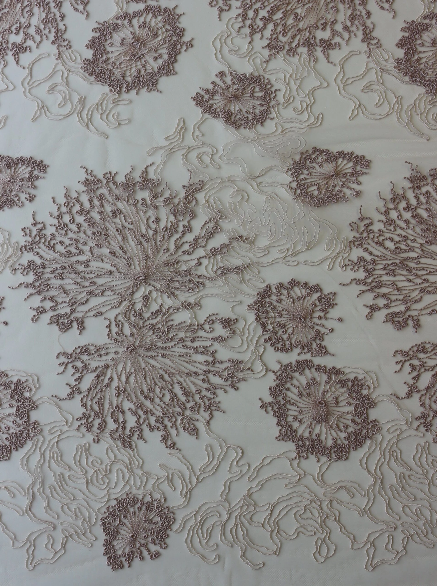 A decadent and glamorous dusky pink lace that measures 132 cm (52″) wide.