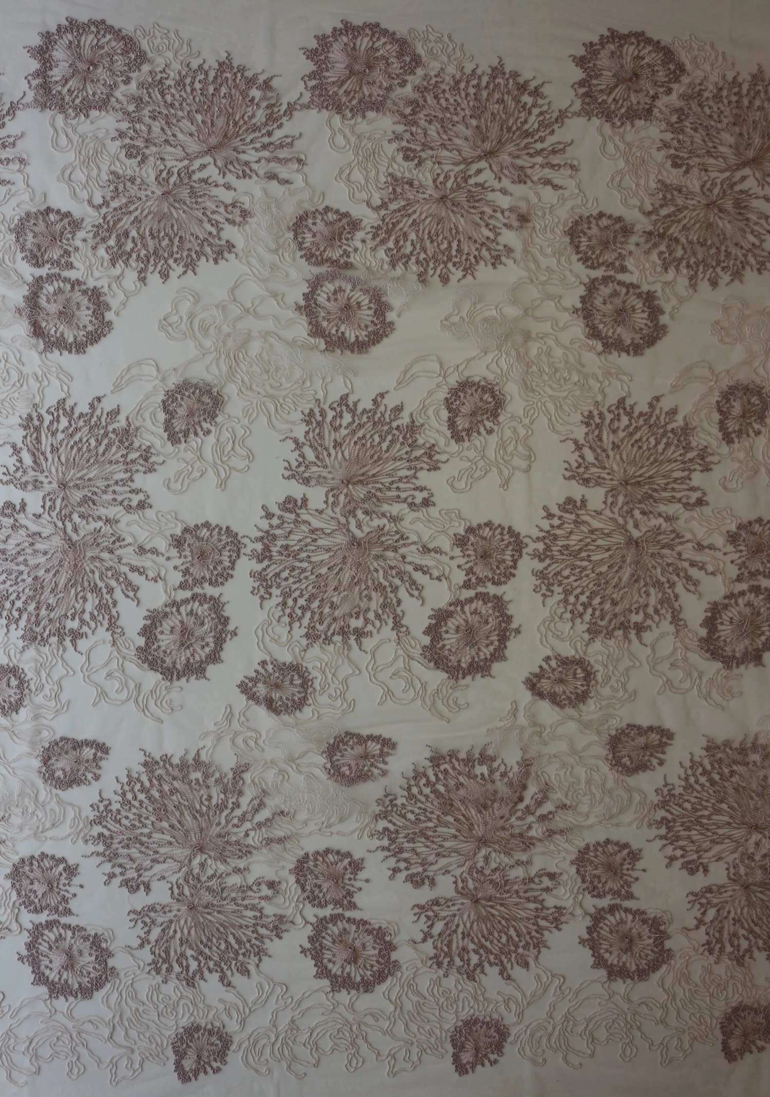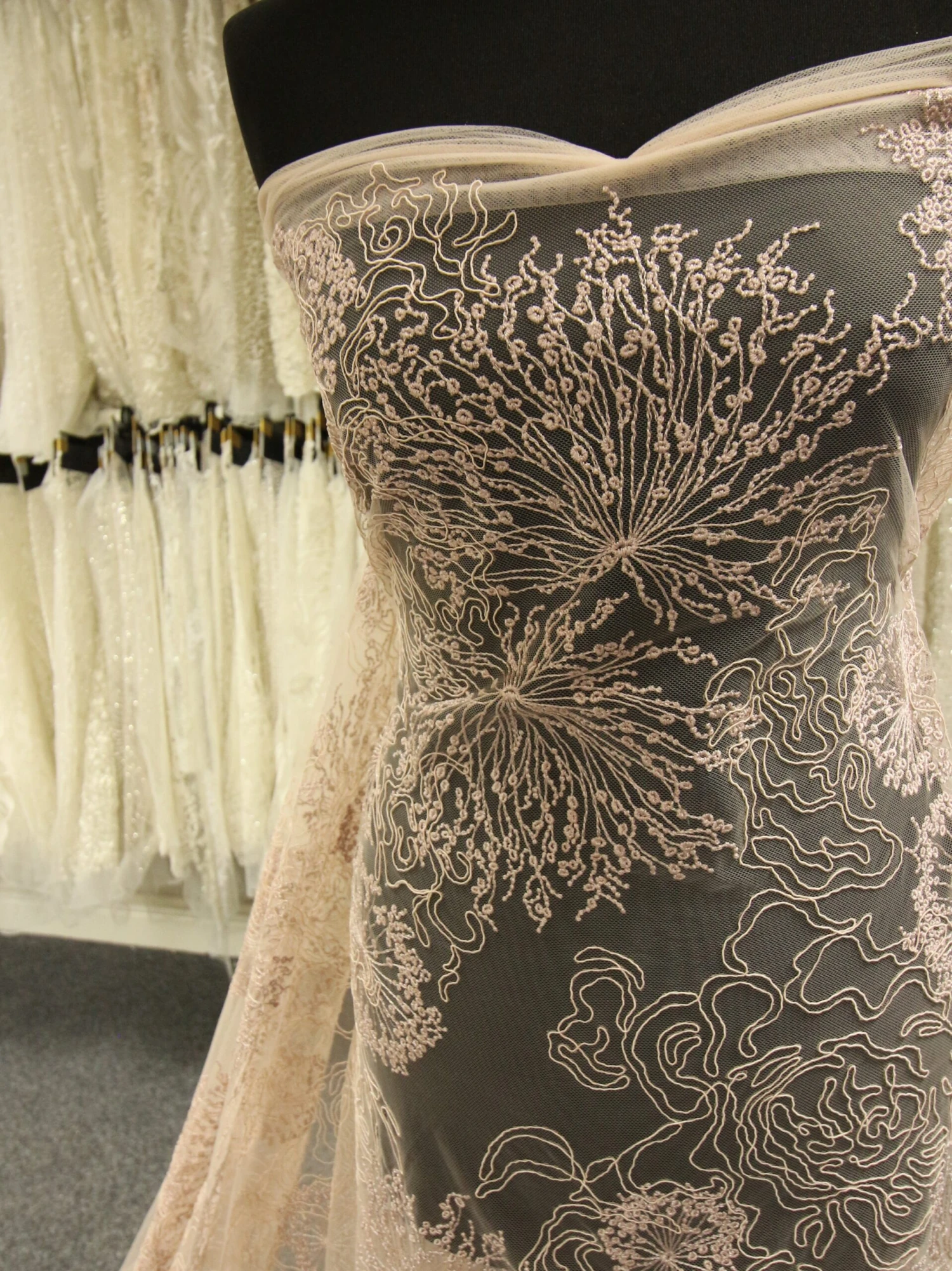 This is an embroidered tulle base that has been beautifully decorated with embroidery and cording to produce and elegant and highly feminine design.
