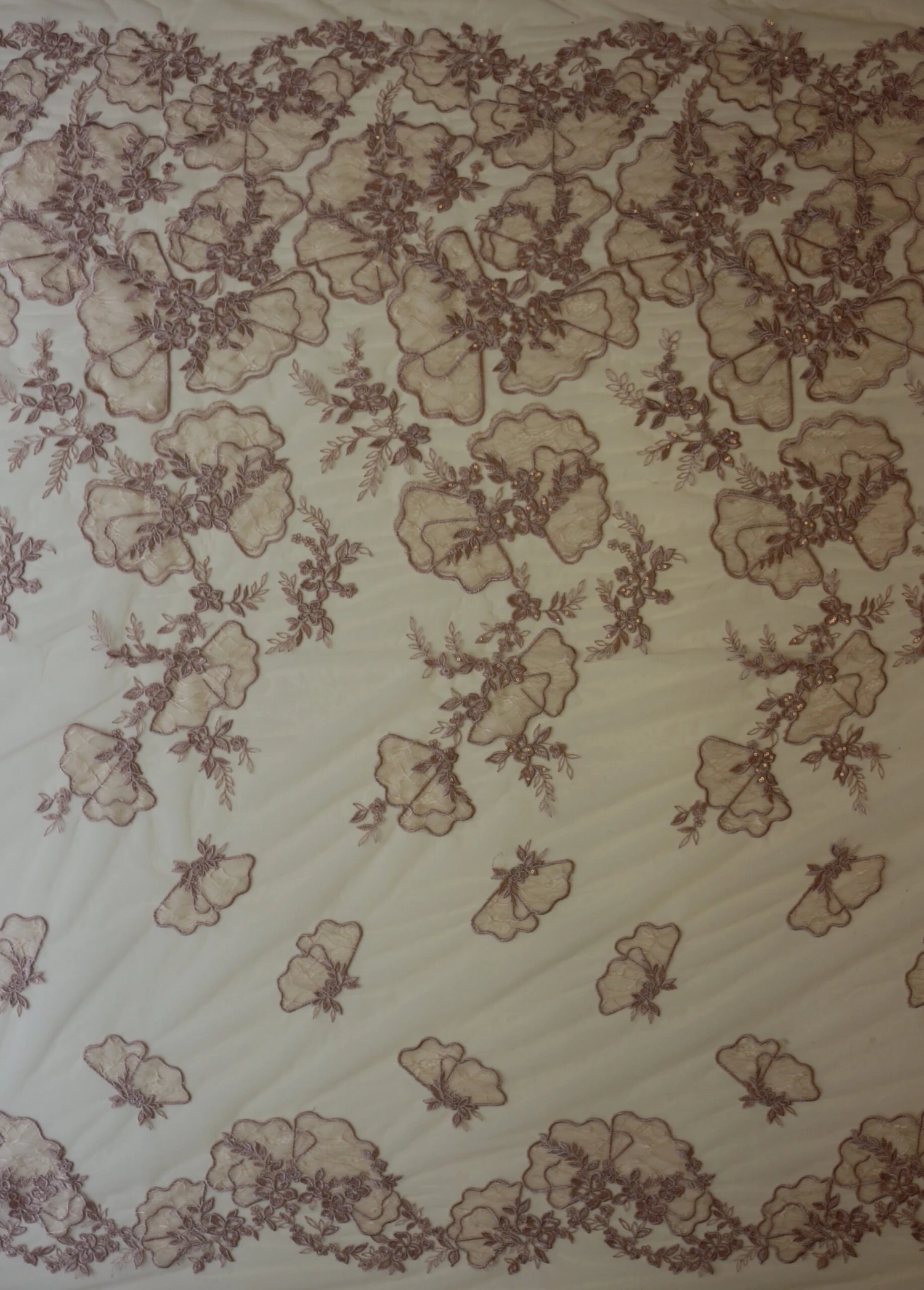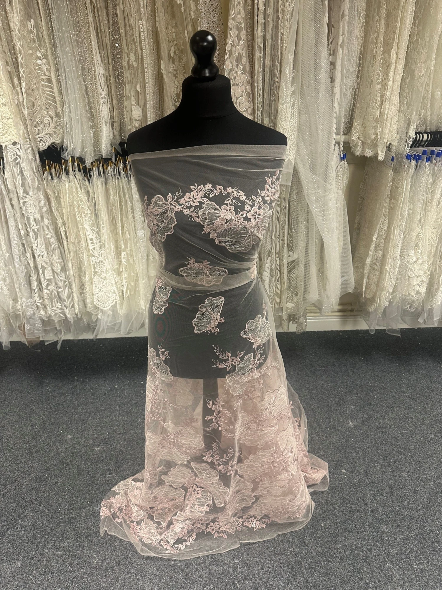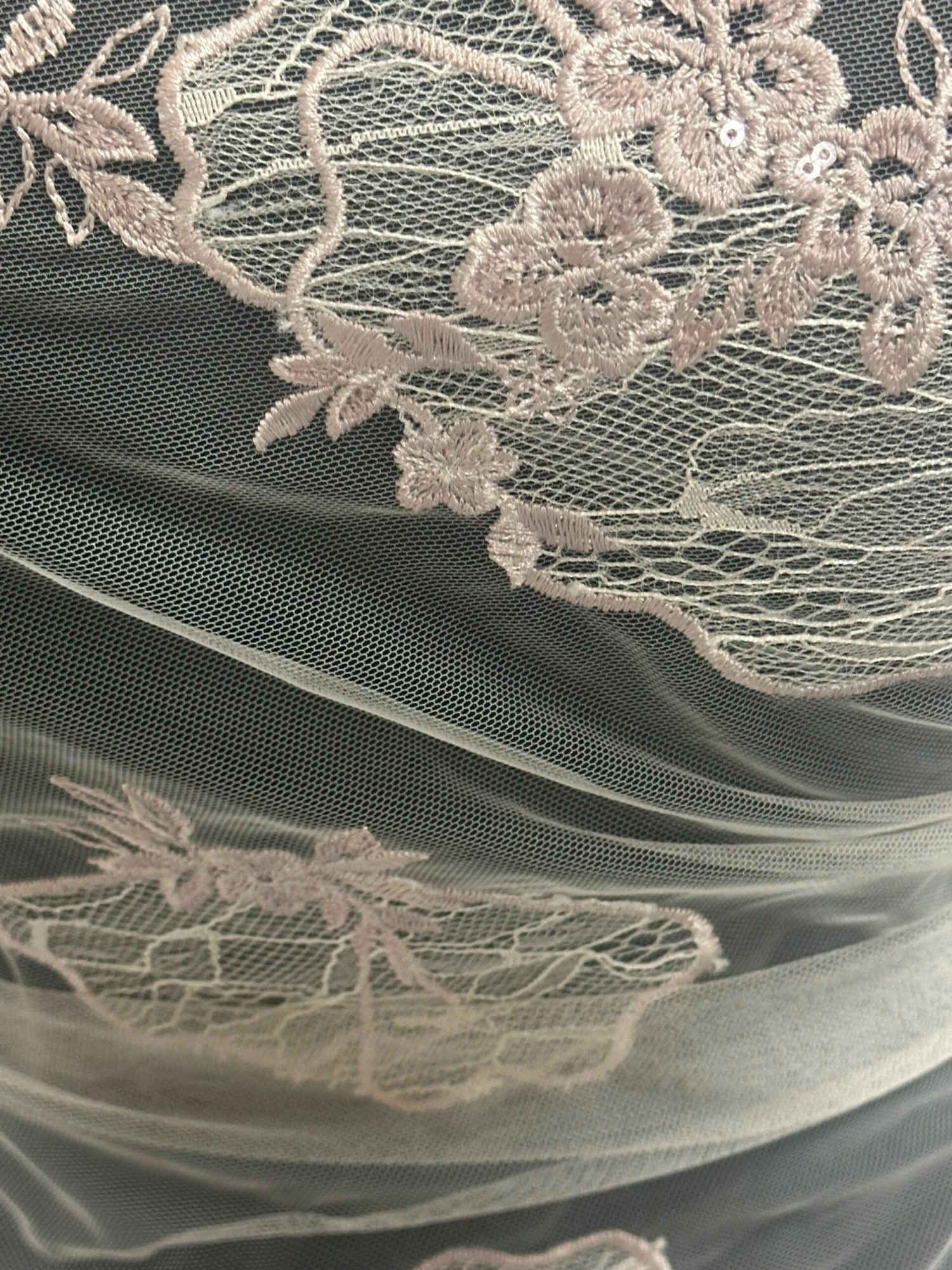 An elegant pastel pink embroidered tulle base, that has sequin detail and a variety of different flowers. Both Borders are different.
