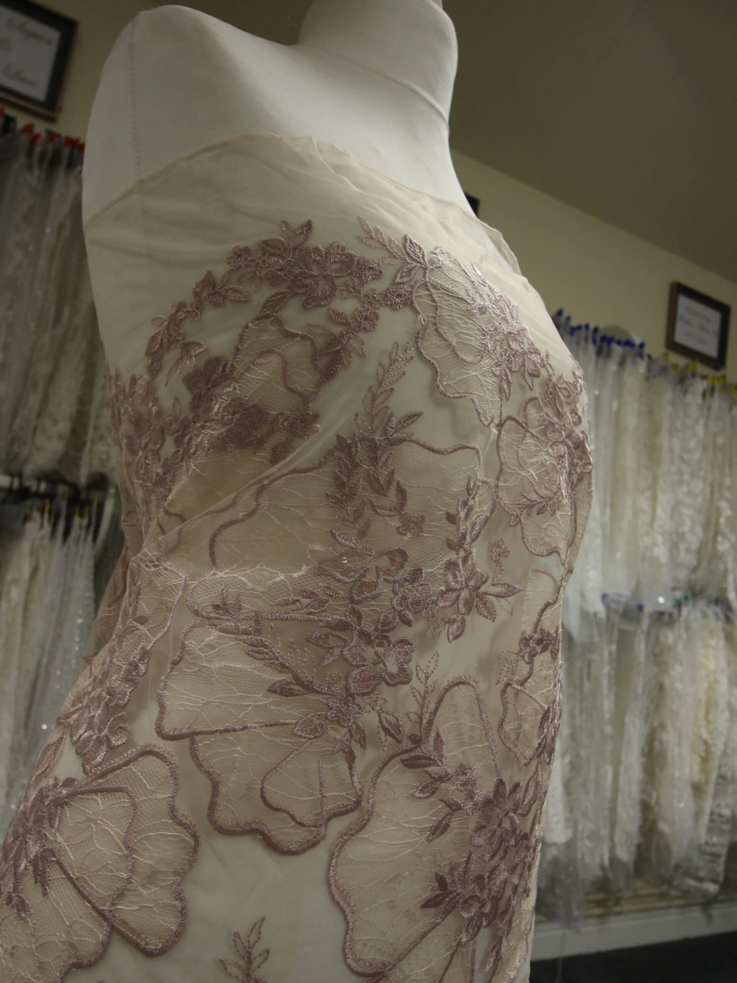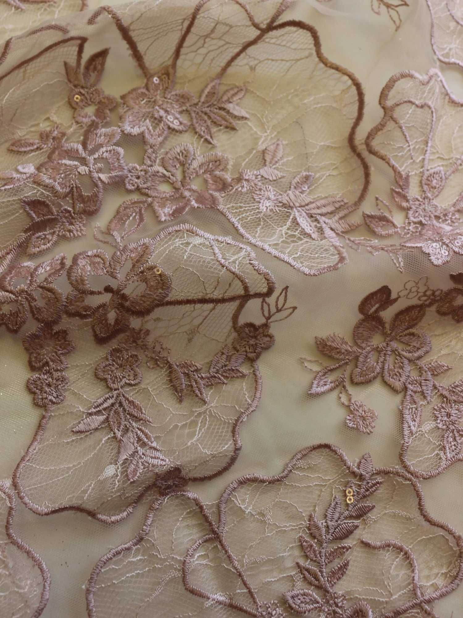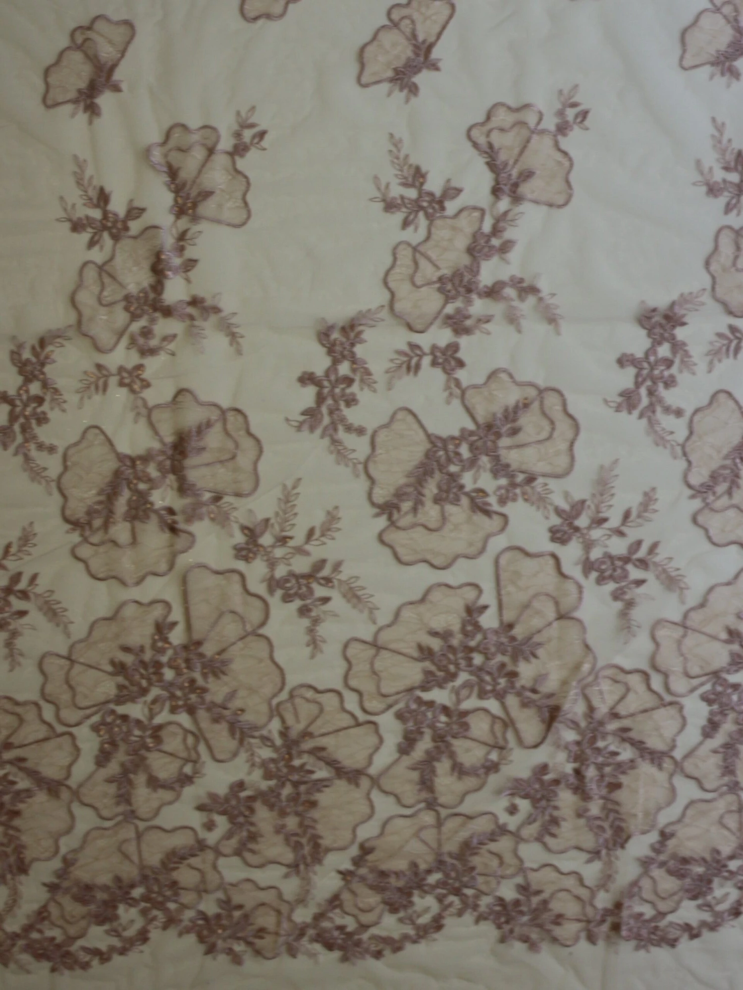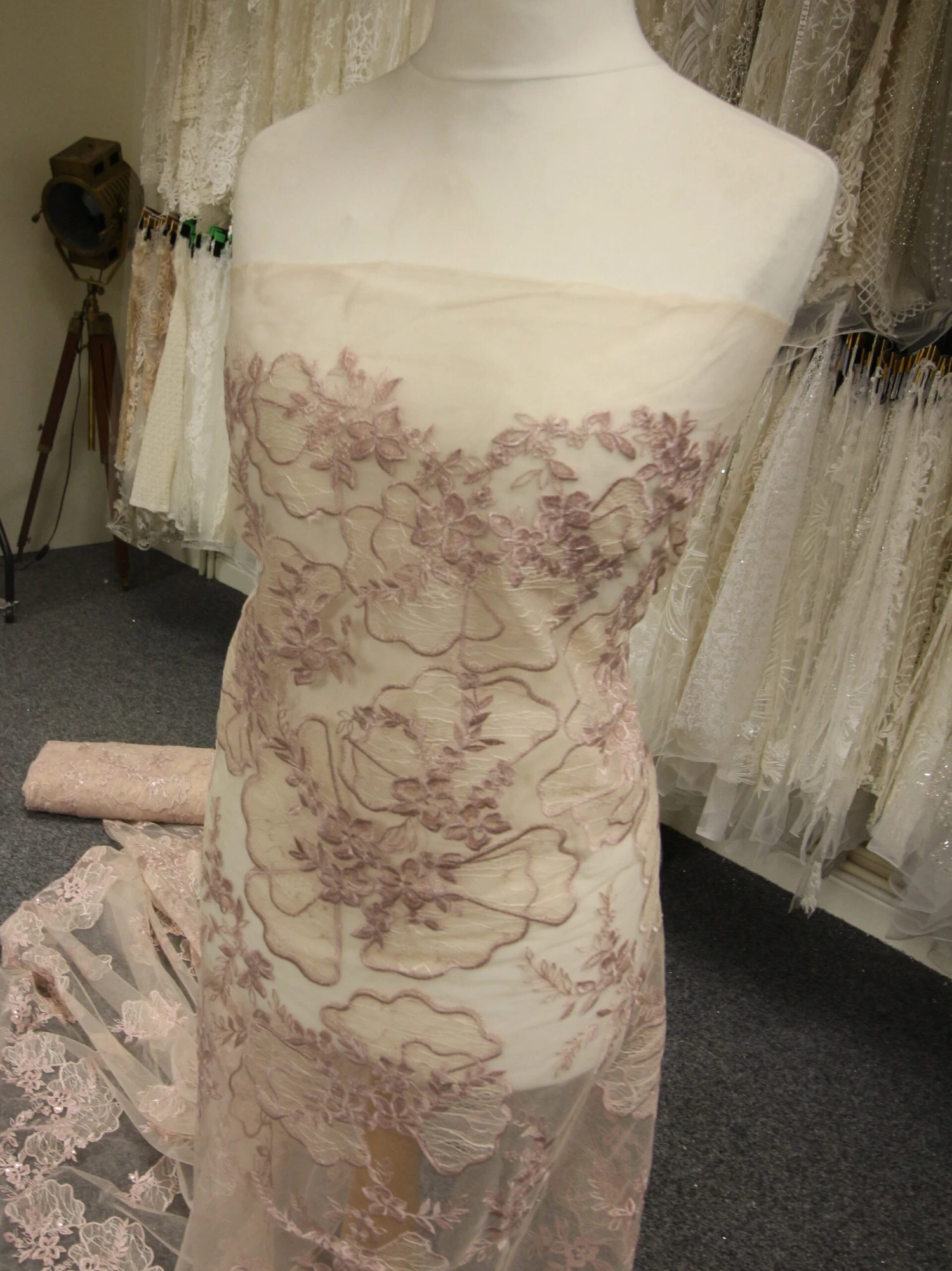 An elegant pastel pink embroidered tulle base, that has sequin detail and a variety of different flowers. Both Borders are different.