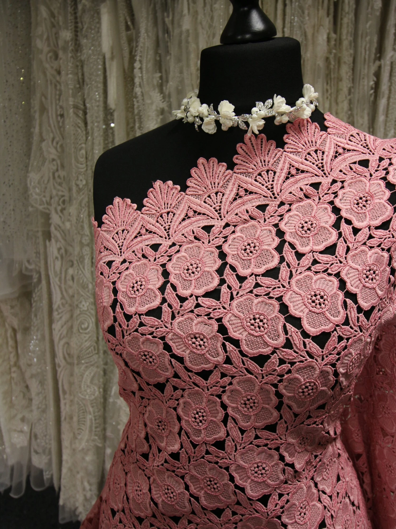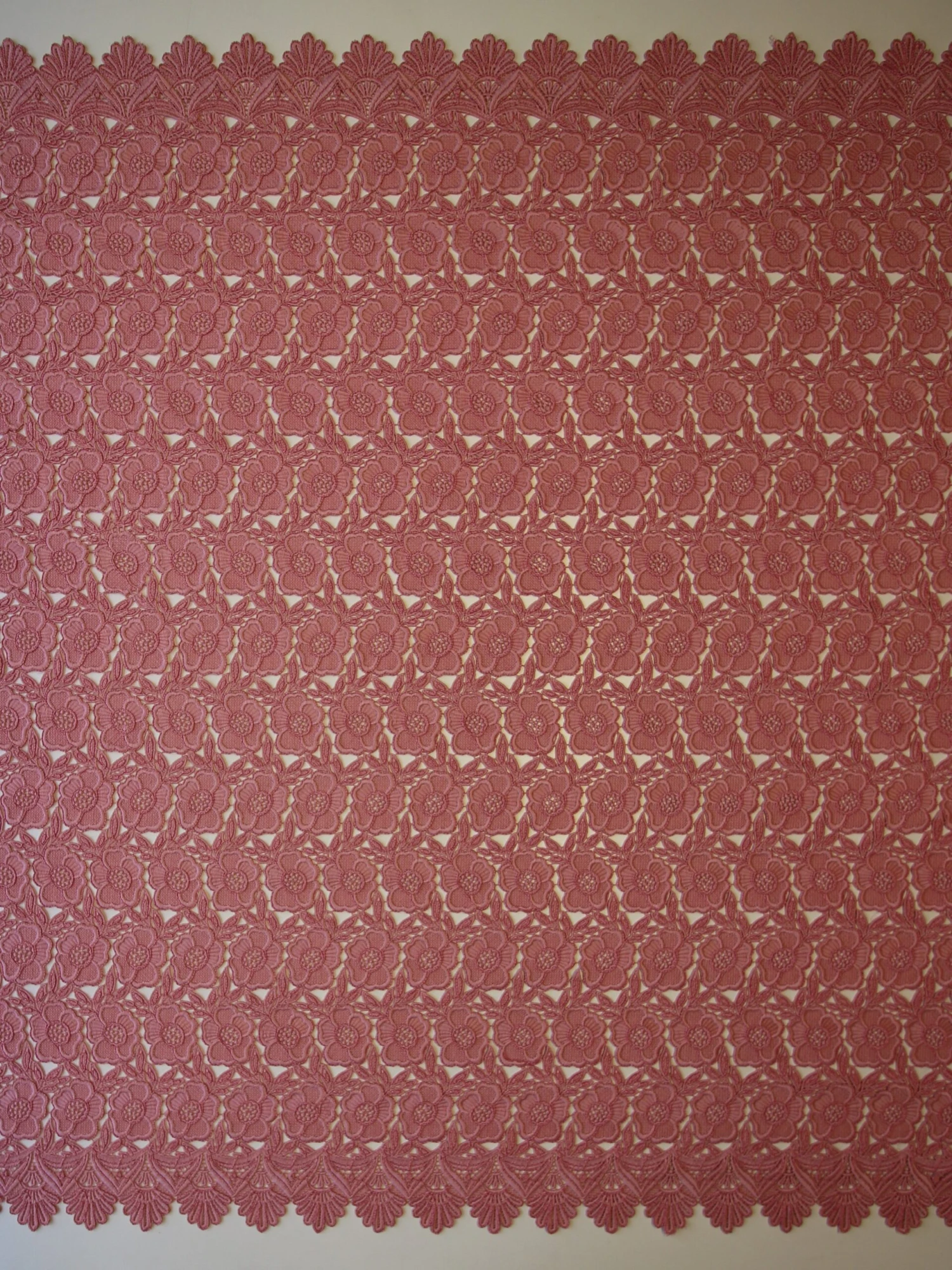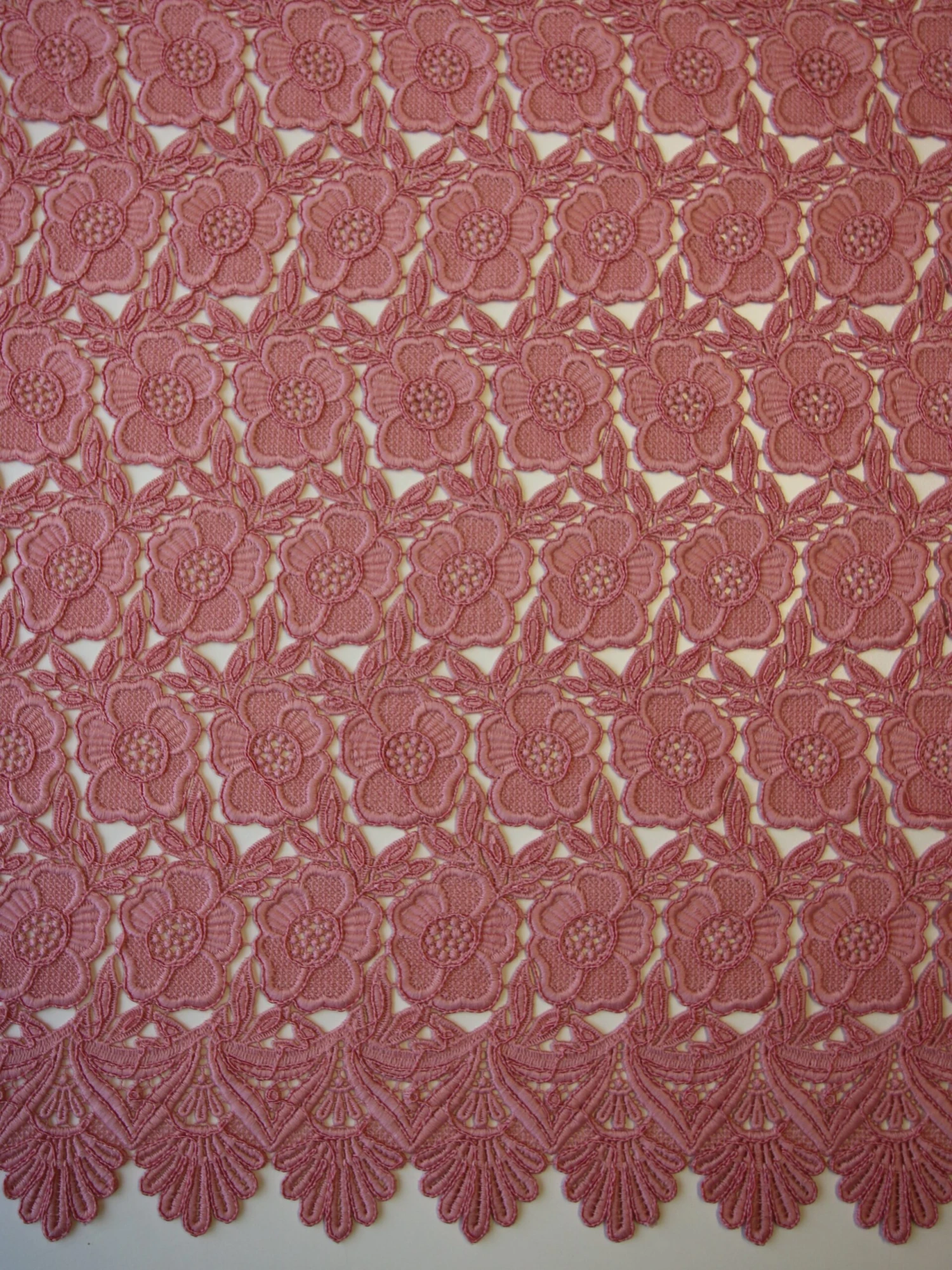 Pretty in pink this is a delightful Guipure lace that features interconnecting flowers, framed by leaves.