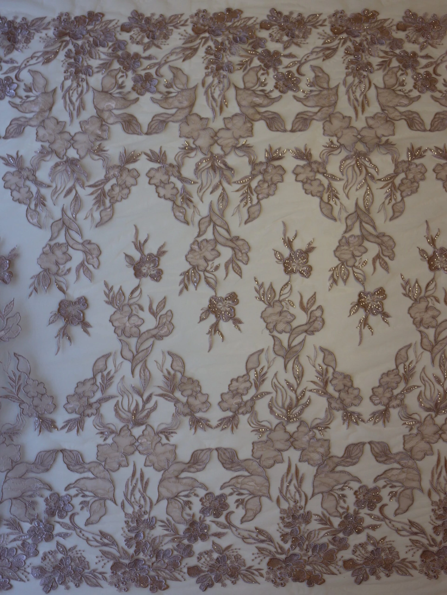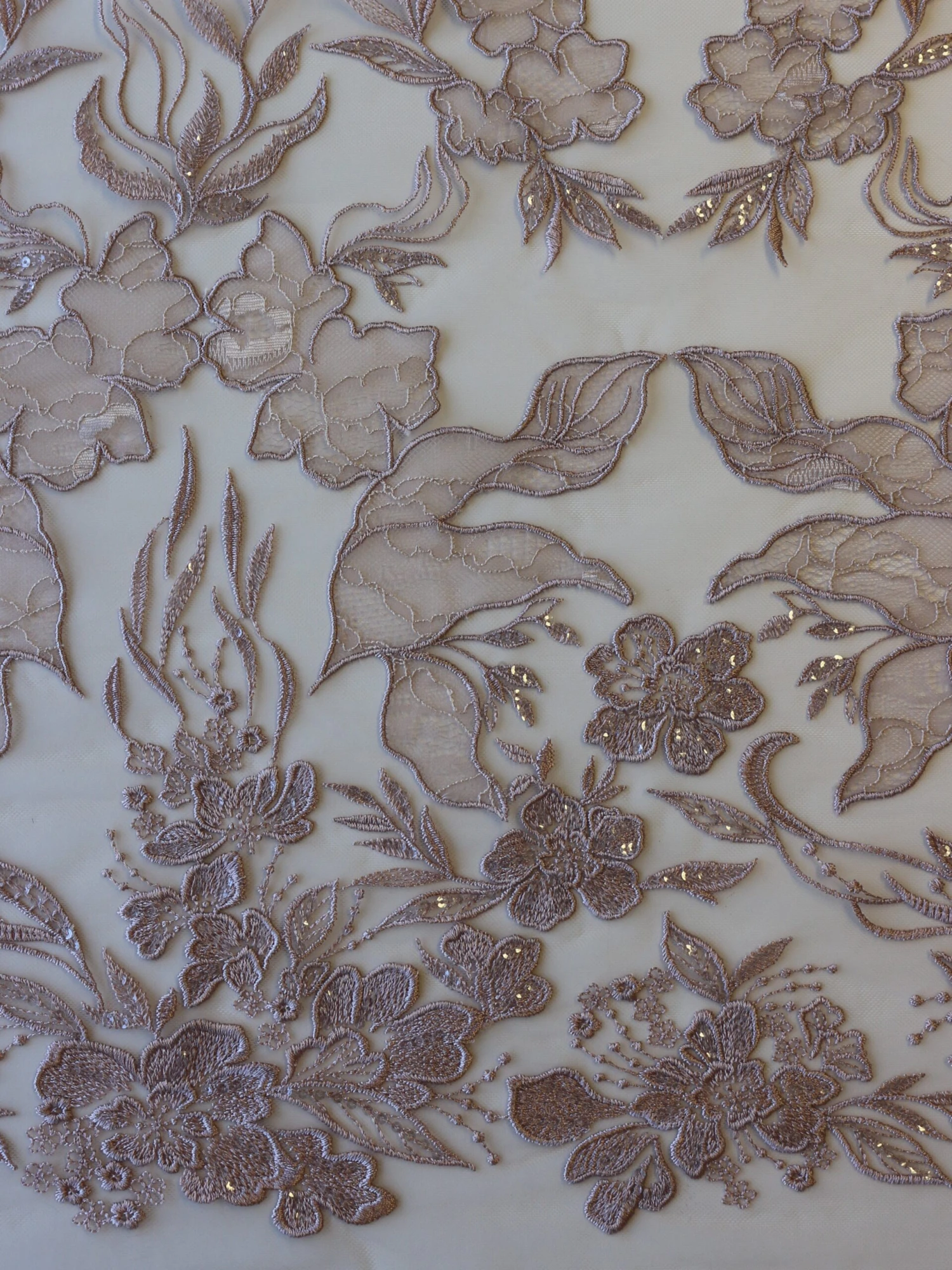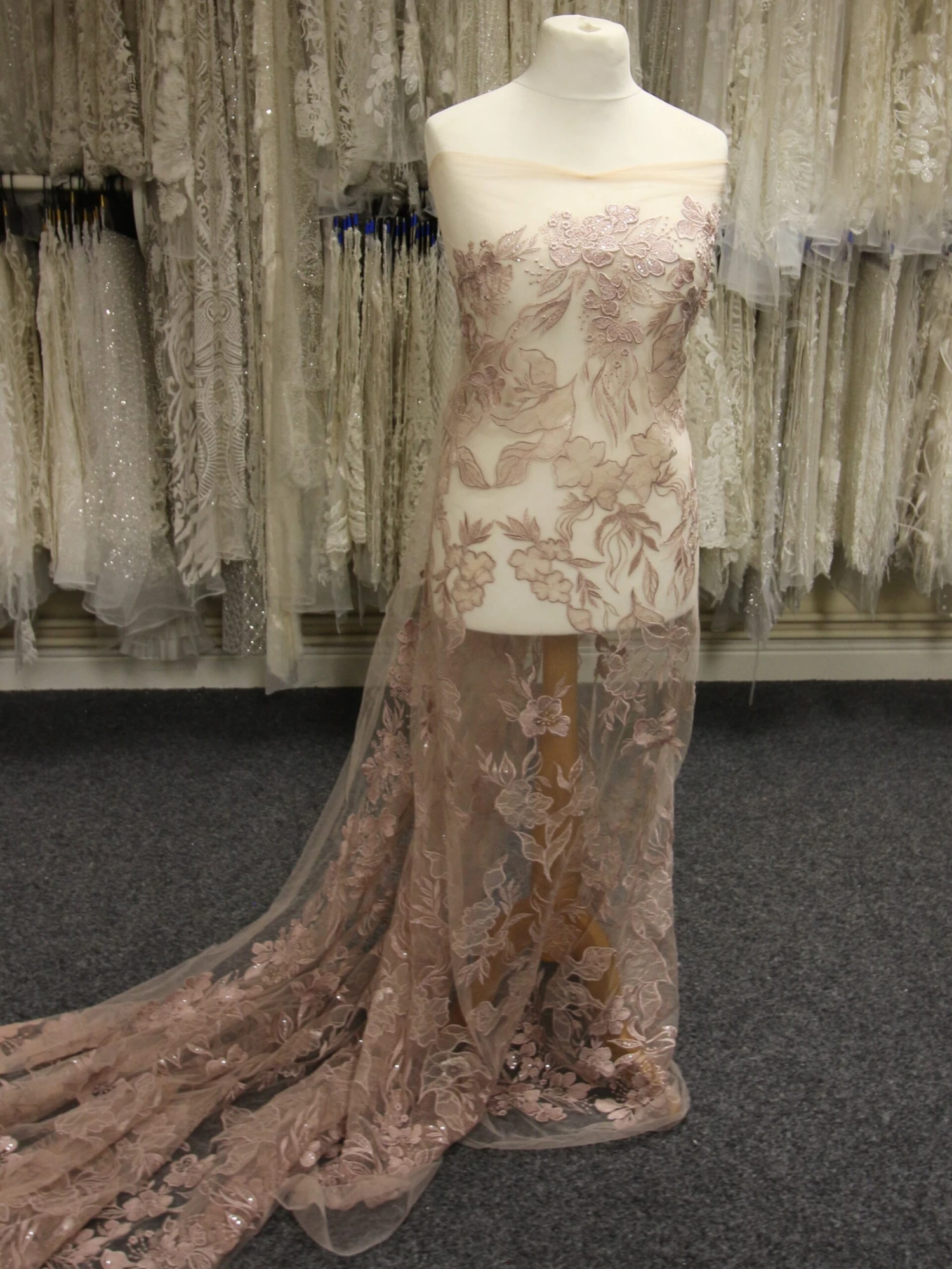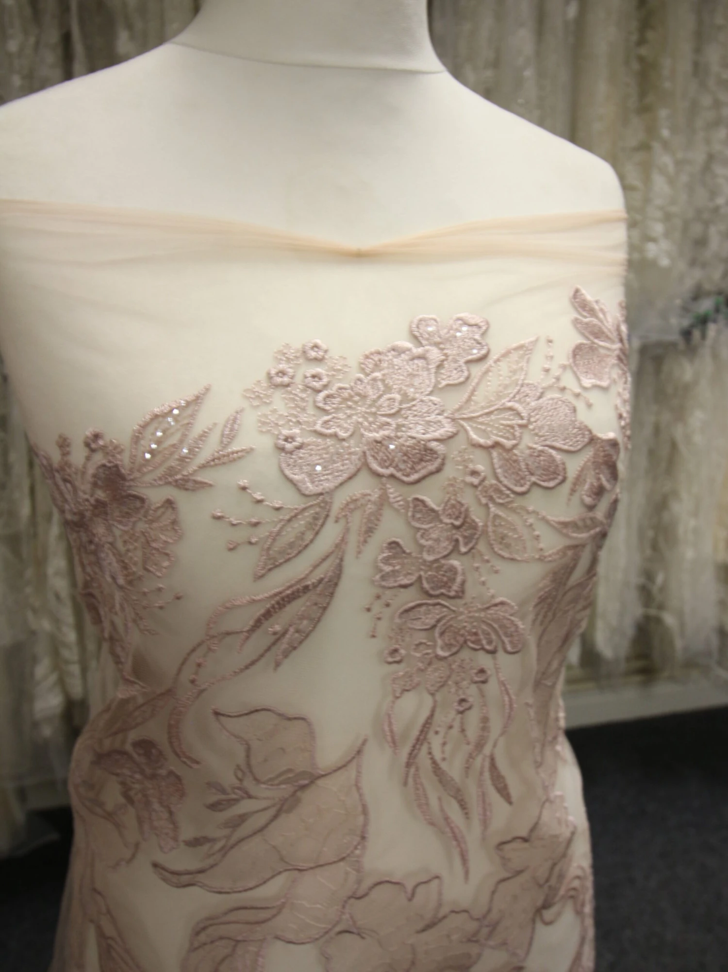 A dusky pink embroidered tulle base that measures 132 cm (52″) wide and which features a feminine floral design, with matching edges.