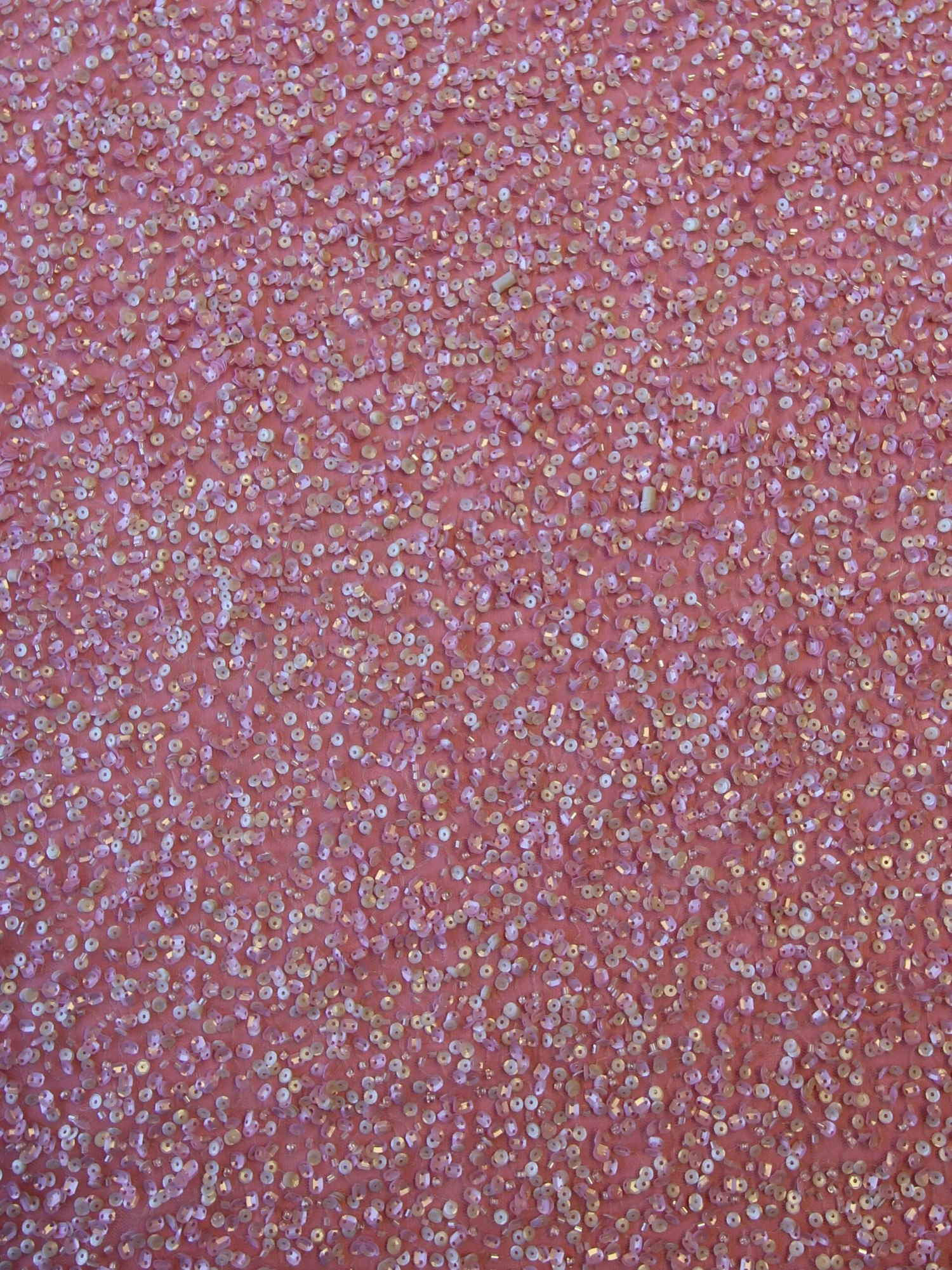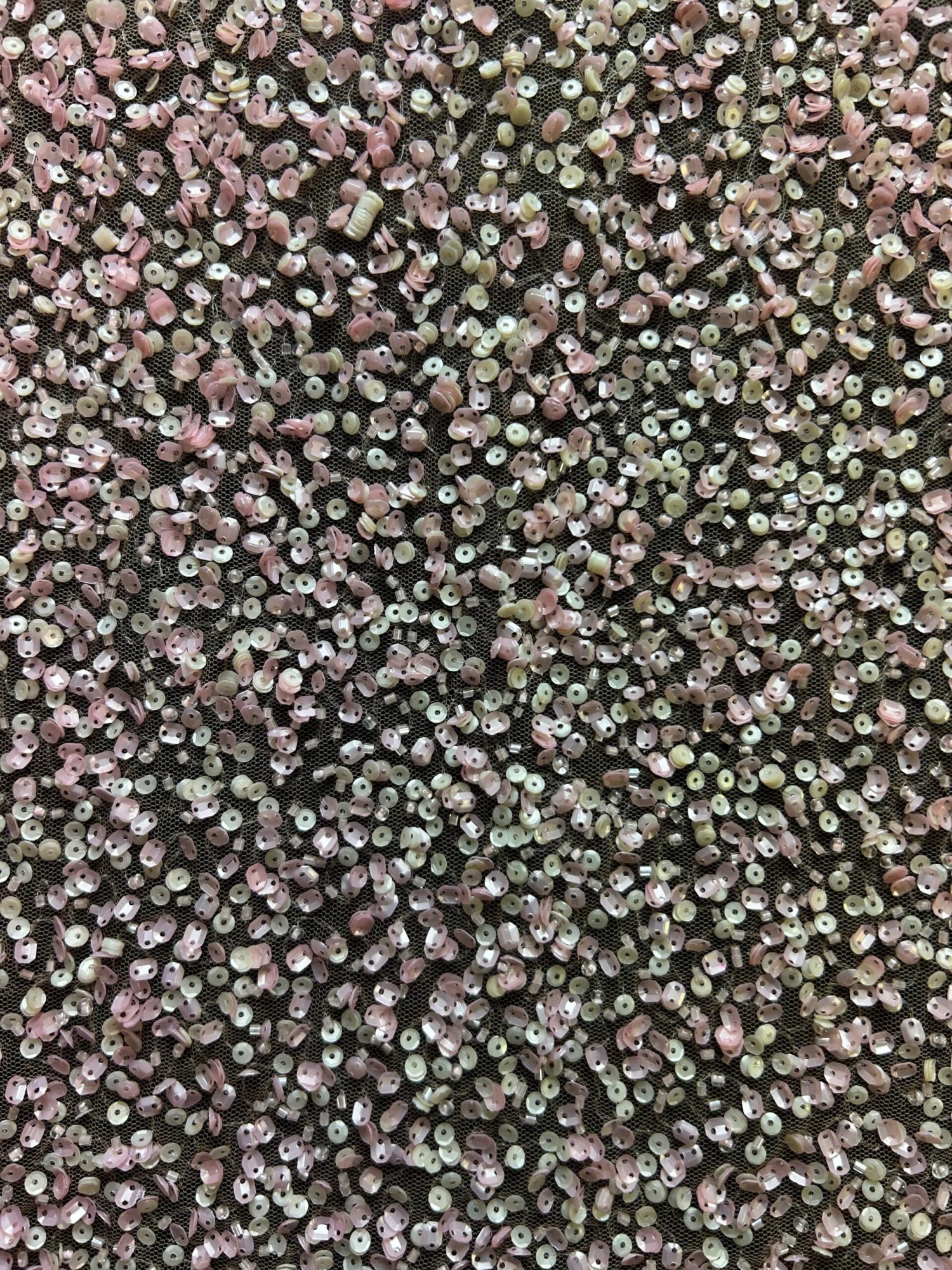 A striking sequined and beaded tulle in pale pink, measuring 126 cm (50″) wide. The Tulle is a traditional nude color, which has then been embellished with a multitude of different beads and sequins which are different shades of pink.