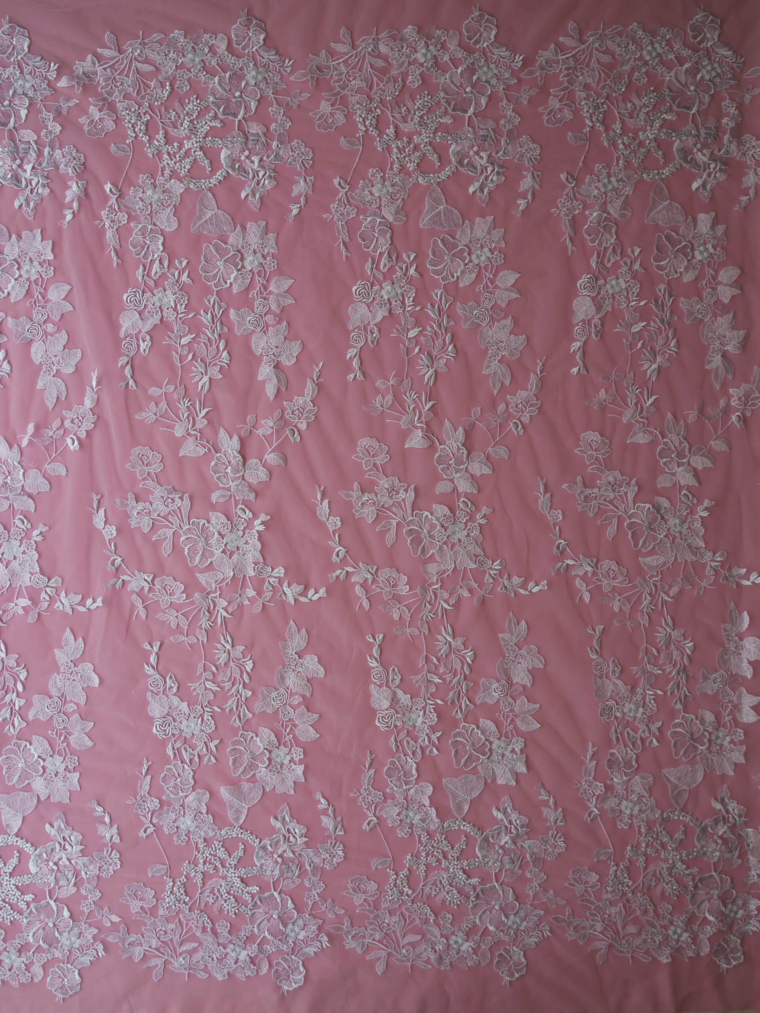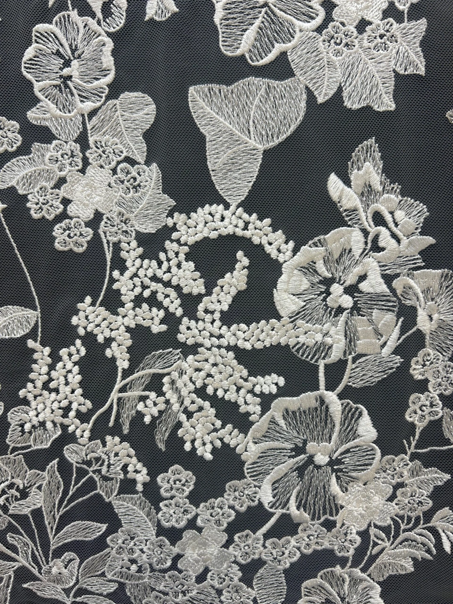 A very pale silver colour, that we have called Platinum is the colour of this embroidery lace. This design is also available in a range of other shades. Both sides of the pattern match one another. This measures 132 cm (52″) wide.Â