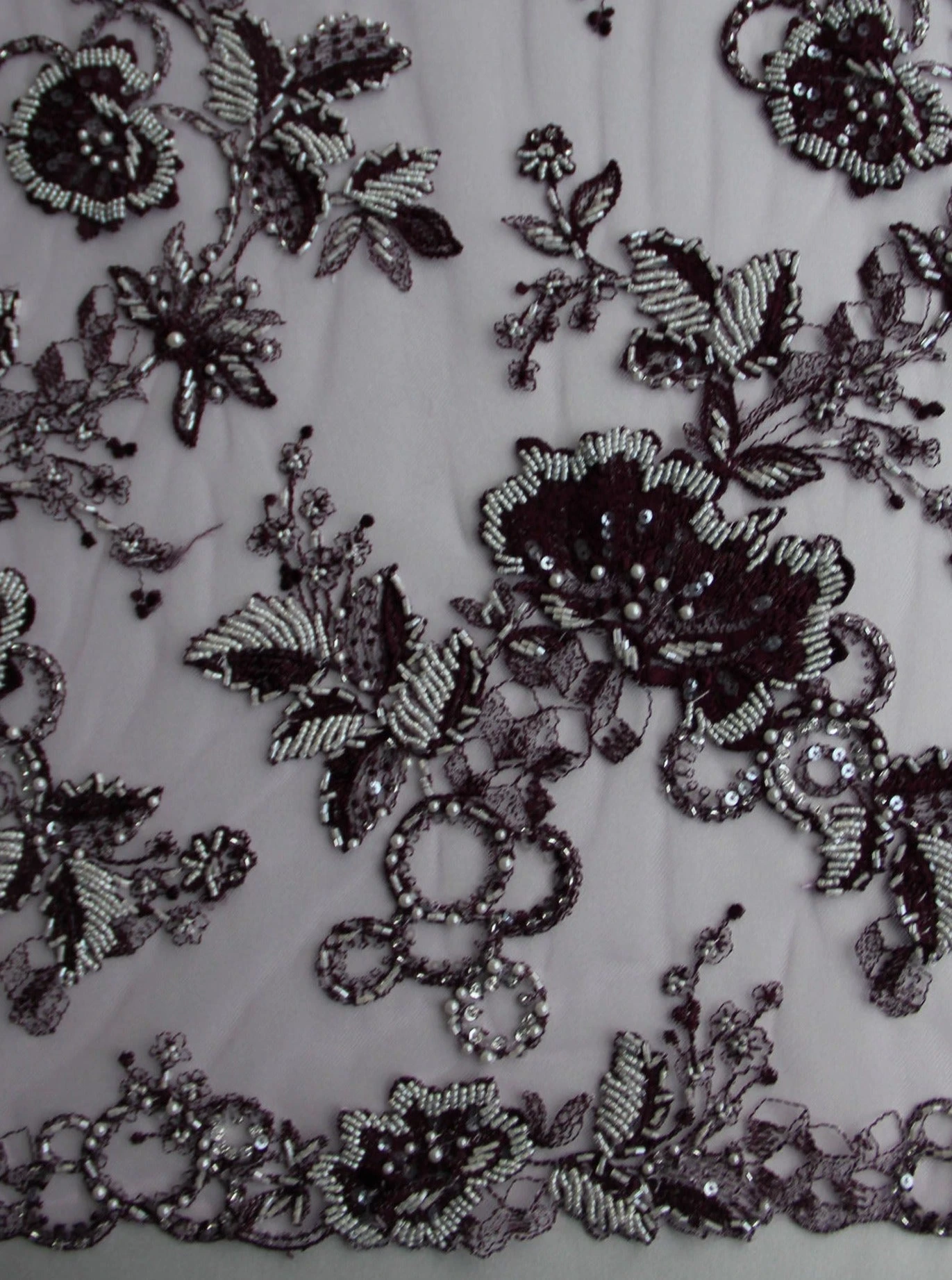 Roberta in plum is an opulent burgundy lace that measures 132 cm (52″) wide, with a distinctly vintage feeling, which is down to the combination of the style of design and the very dark ivory beads that have been used.