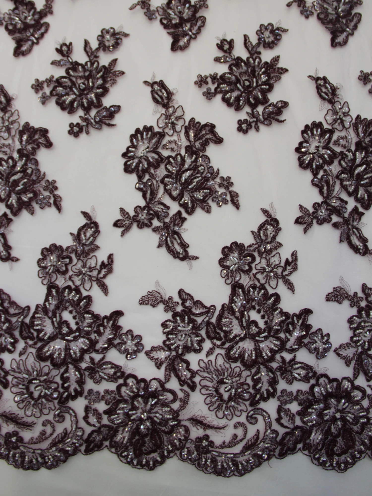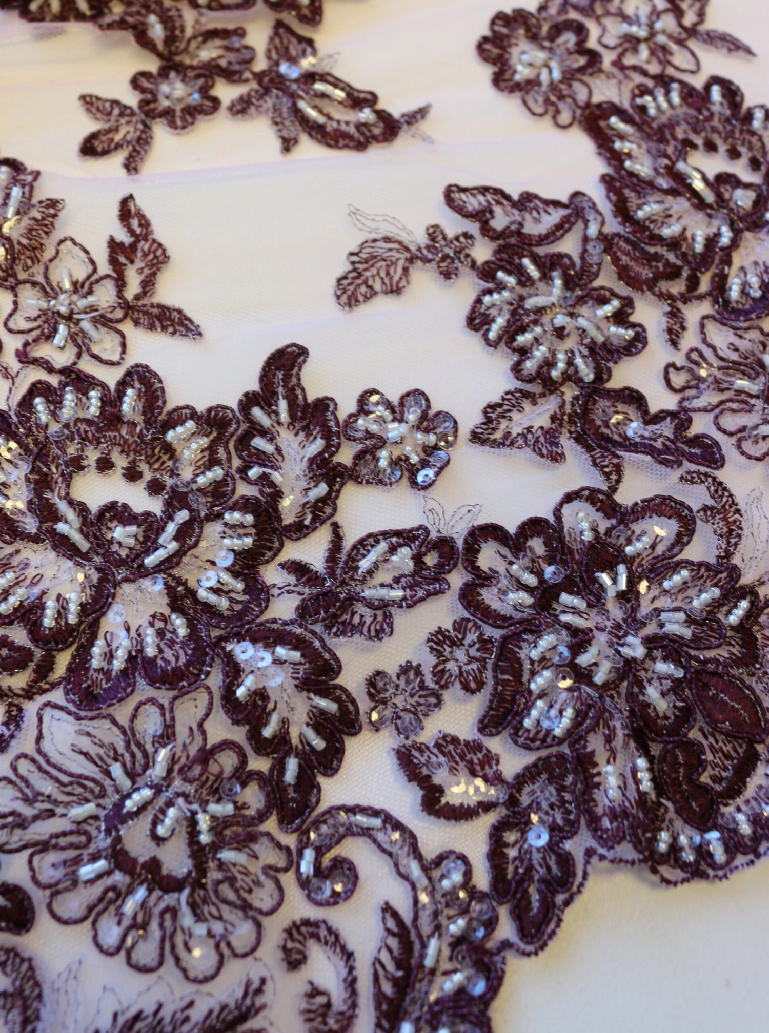 A tasteful and elegant burgundy lace that has three different Floral Motifs in the ground of this extremely elaborate design. The three motifs contain a single flower motif; a 2 flower motif and a 4 flower motif. The flowers are corded and feature an embroidered ground with sequins and beads being used to great effect. A single silver filigree thread is used to edge buds and stems.