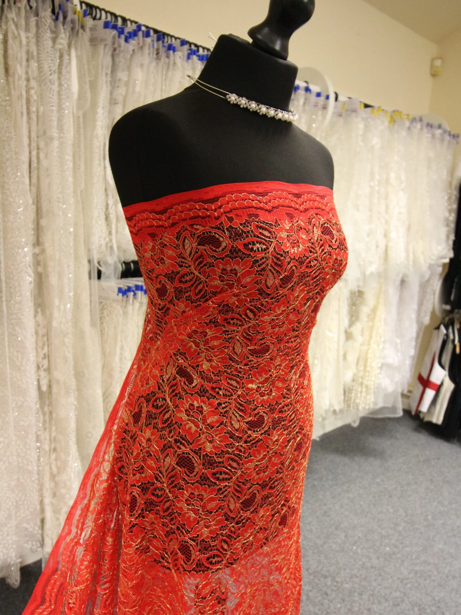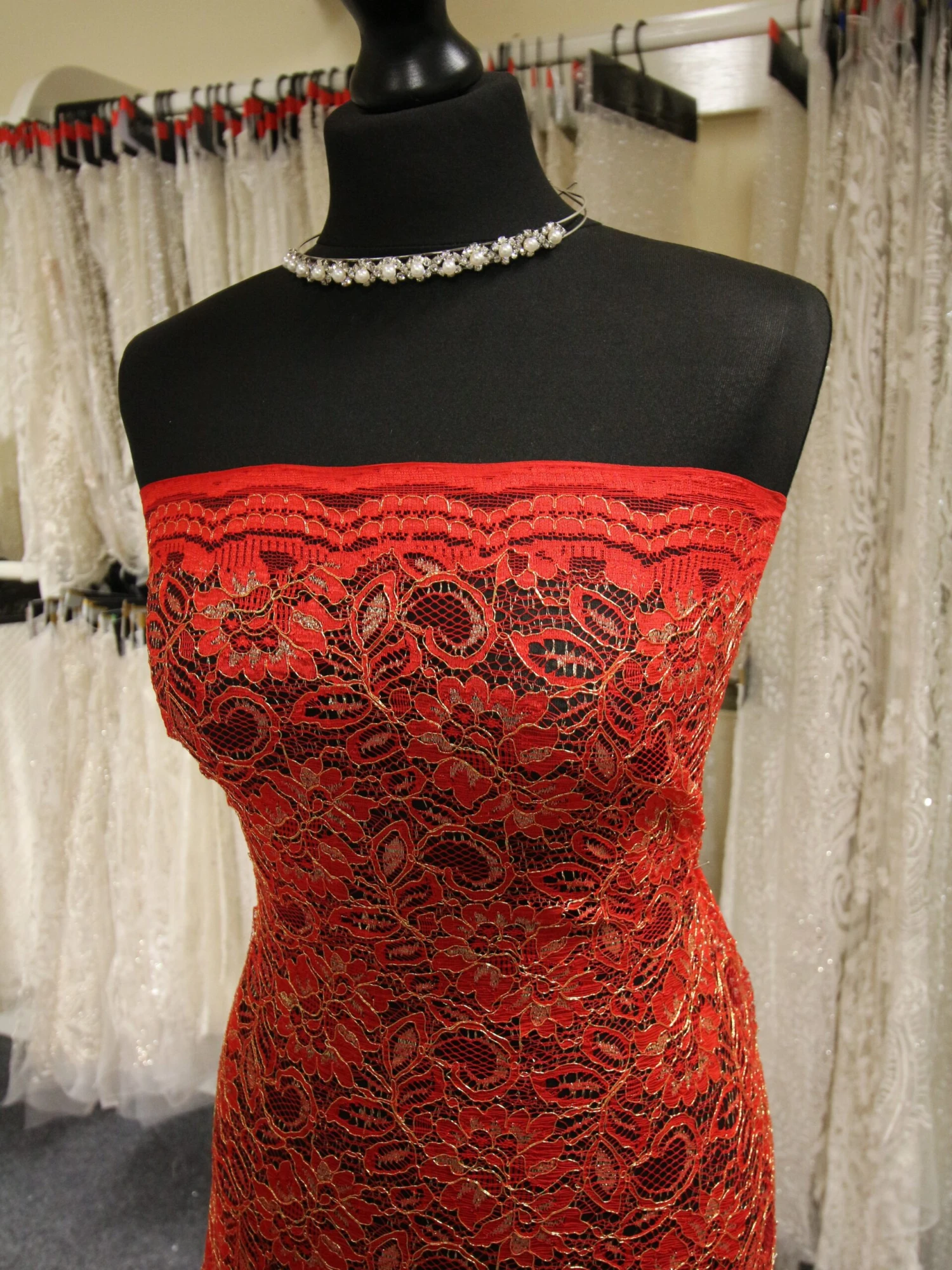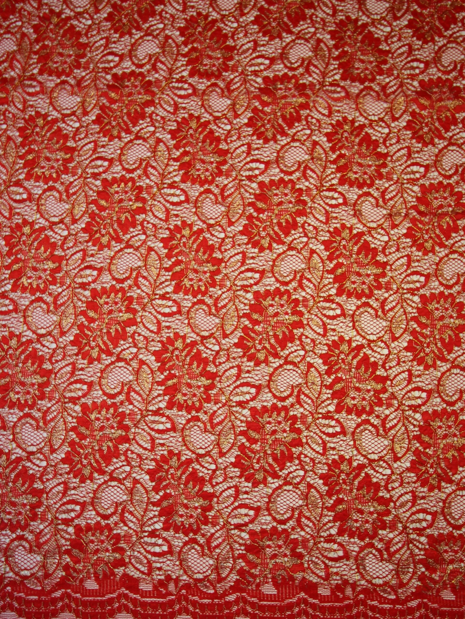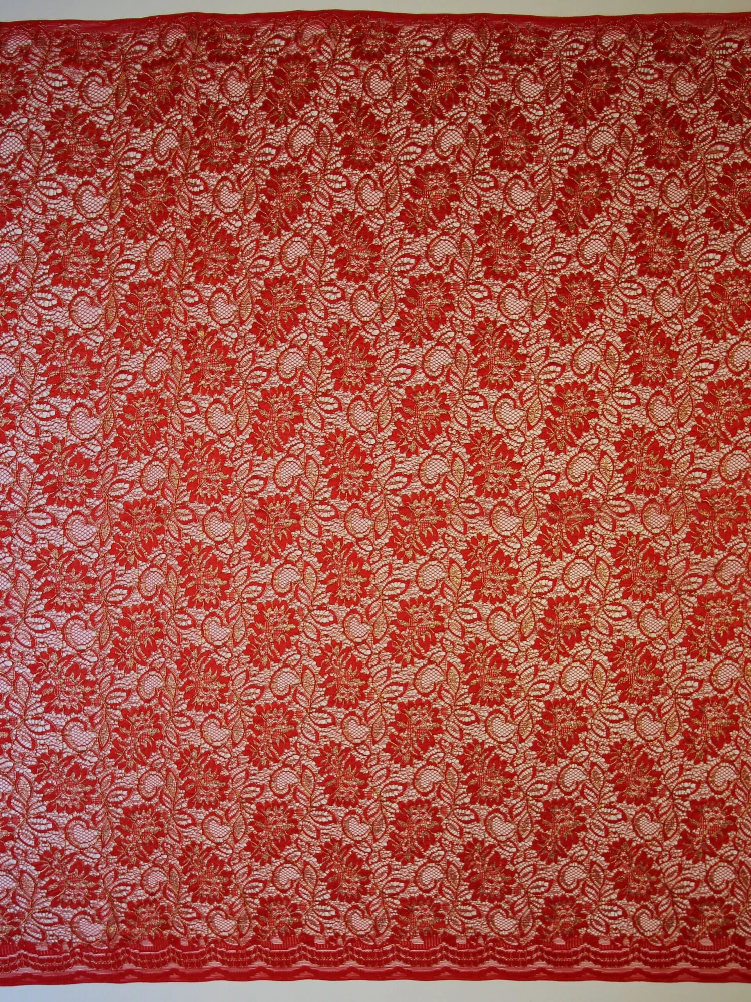 A dazzlingly attractive red and gold lace that measures 105 cm (41.3″) wide.