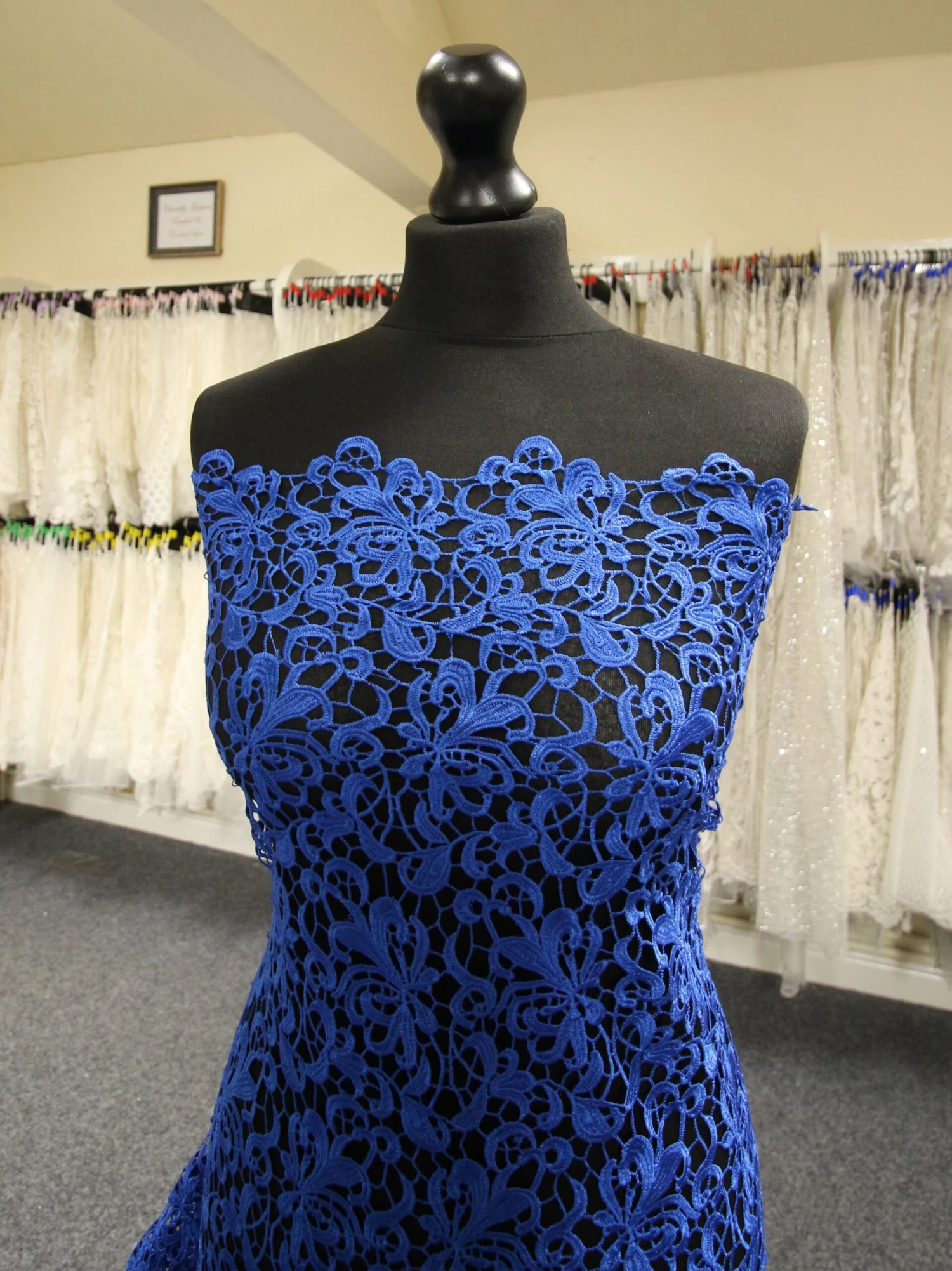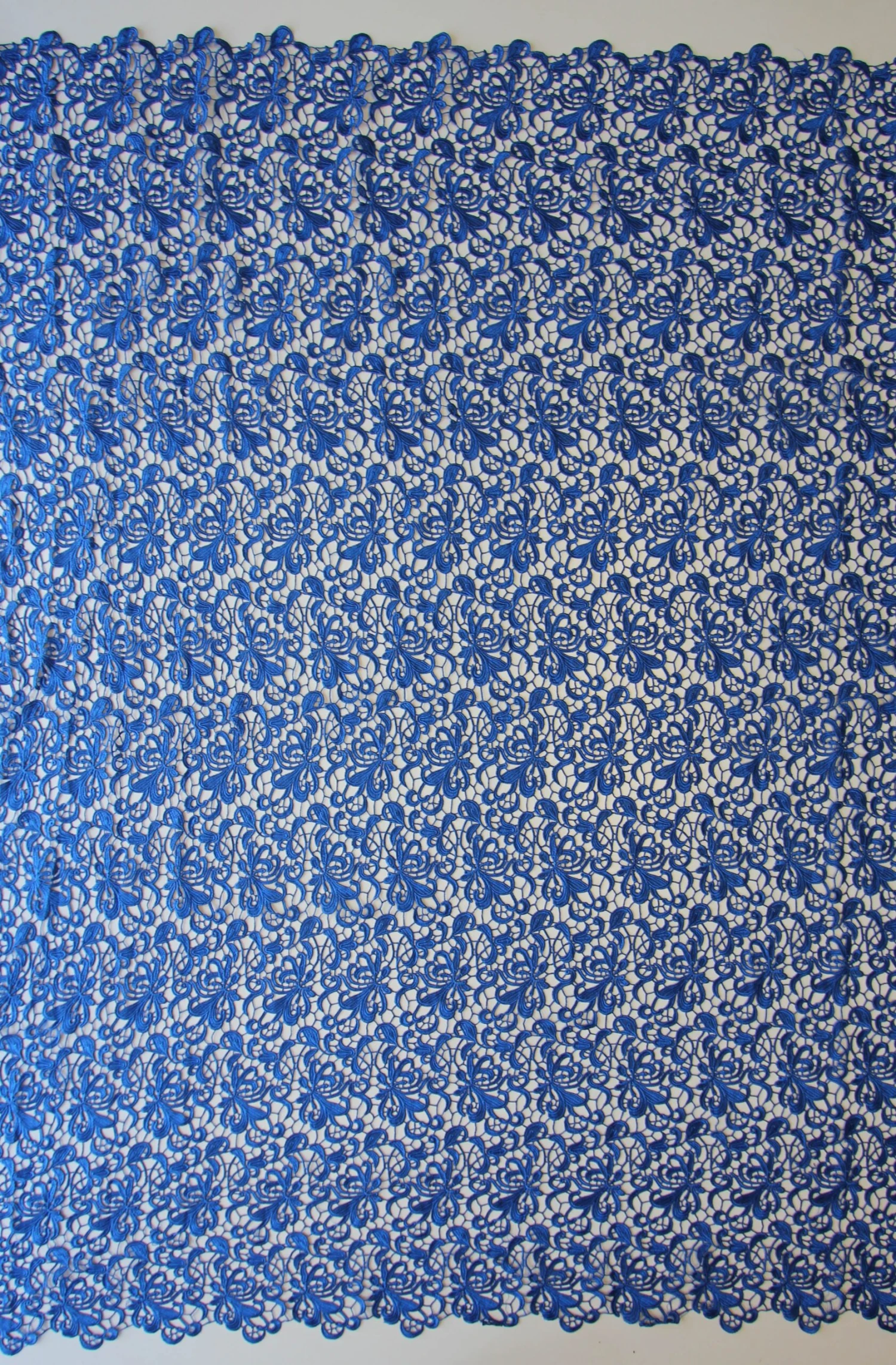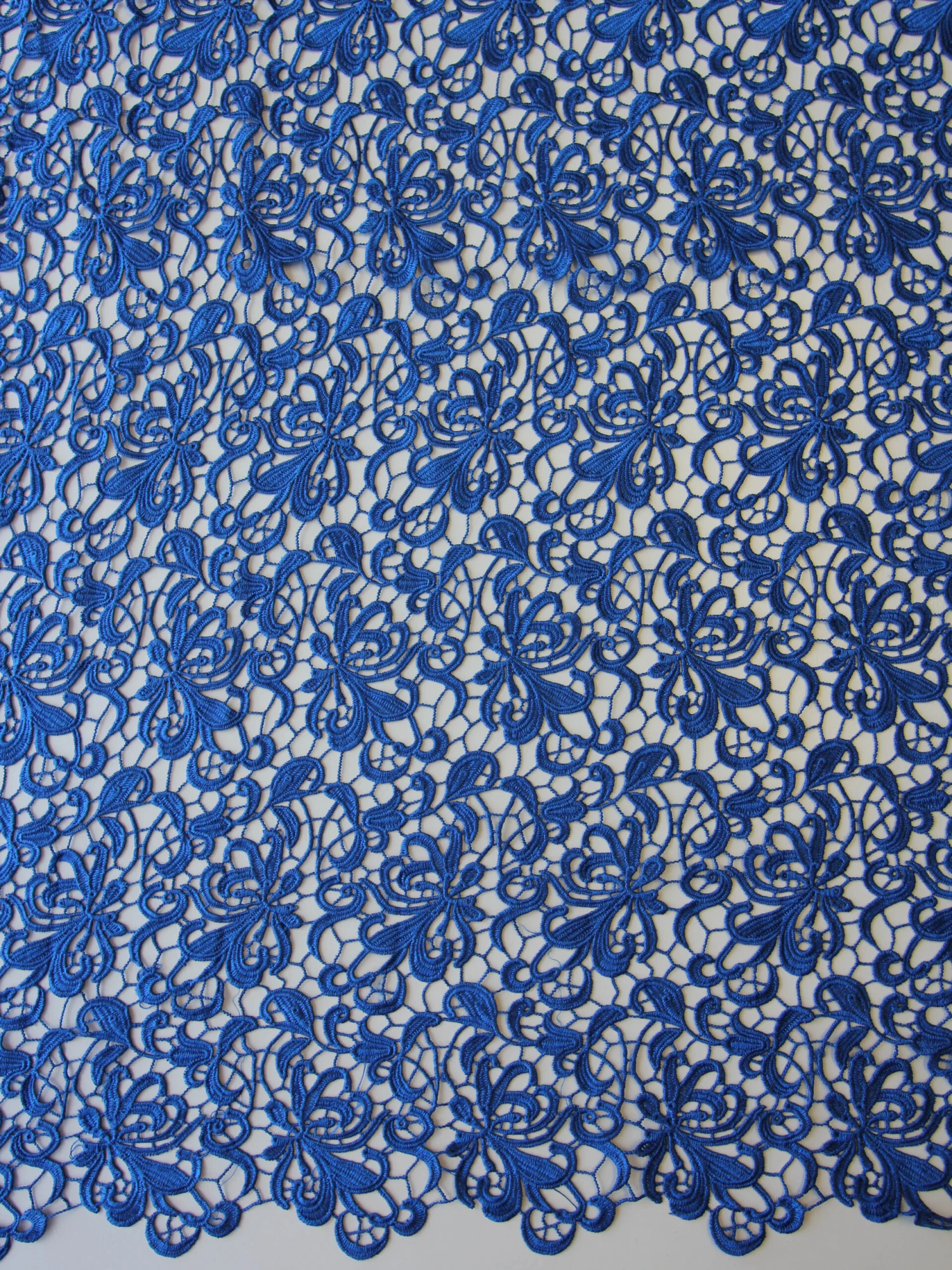 An elegant royal blue guipure lace , that is also available in a range of other colours. This lace measures 130 cm (51″) across the width.