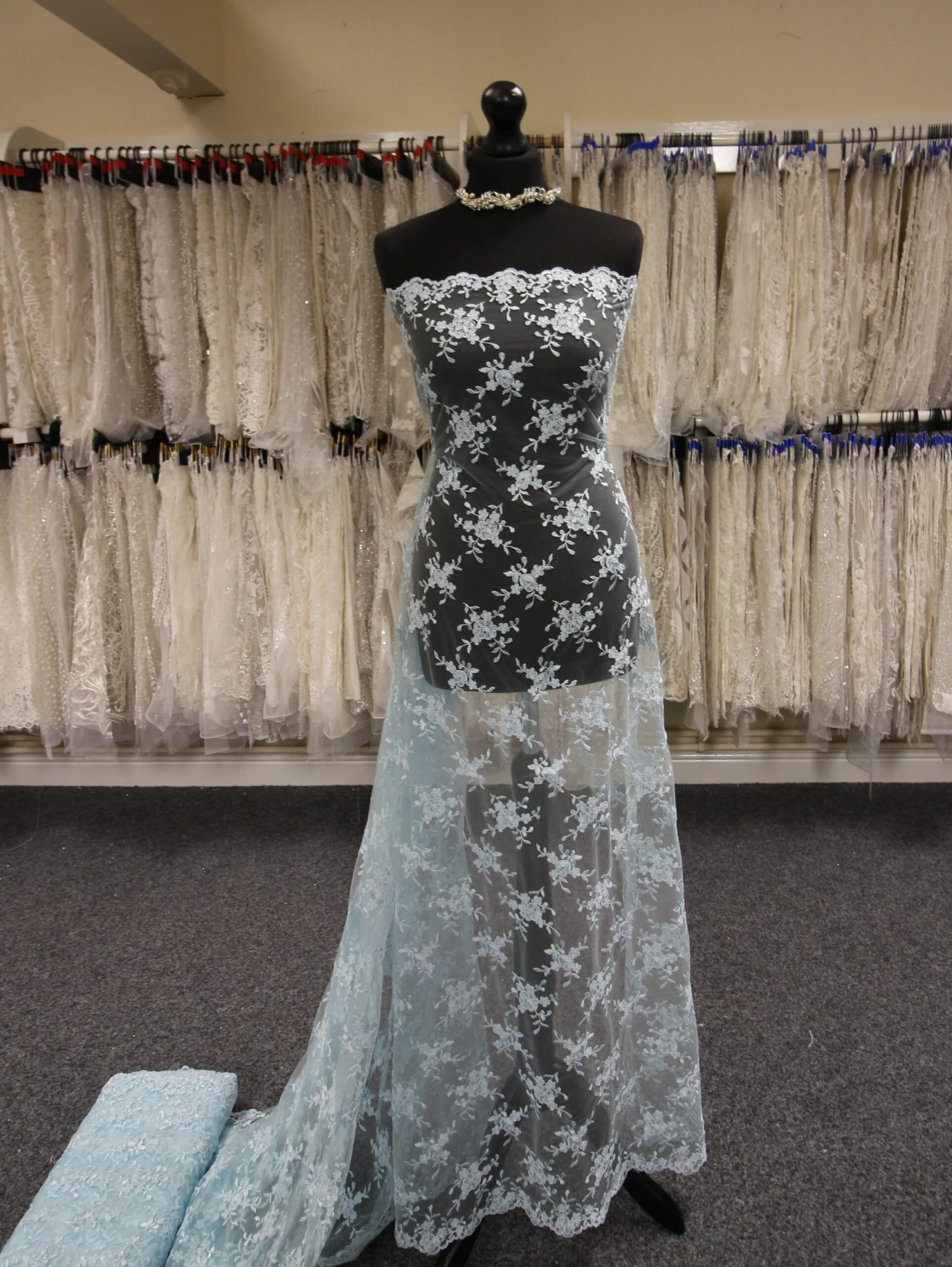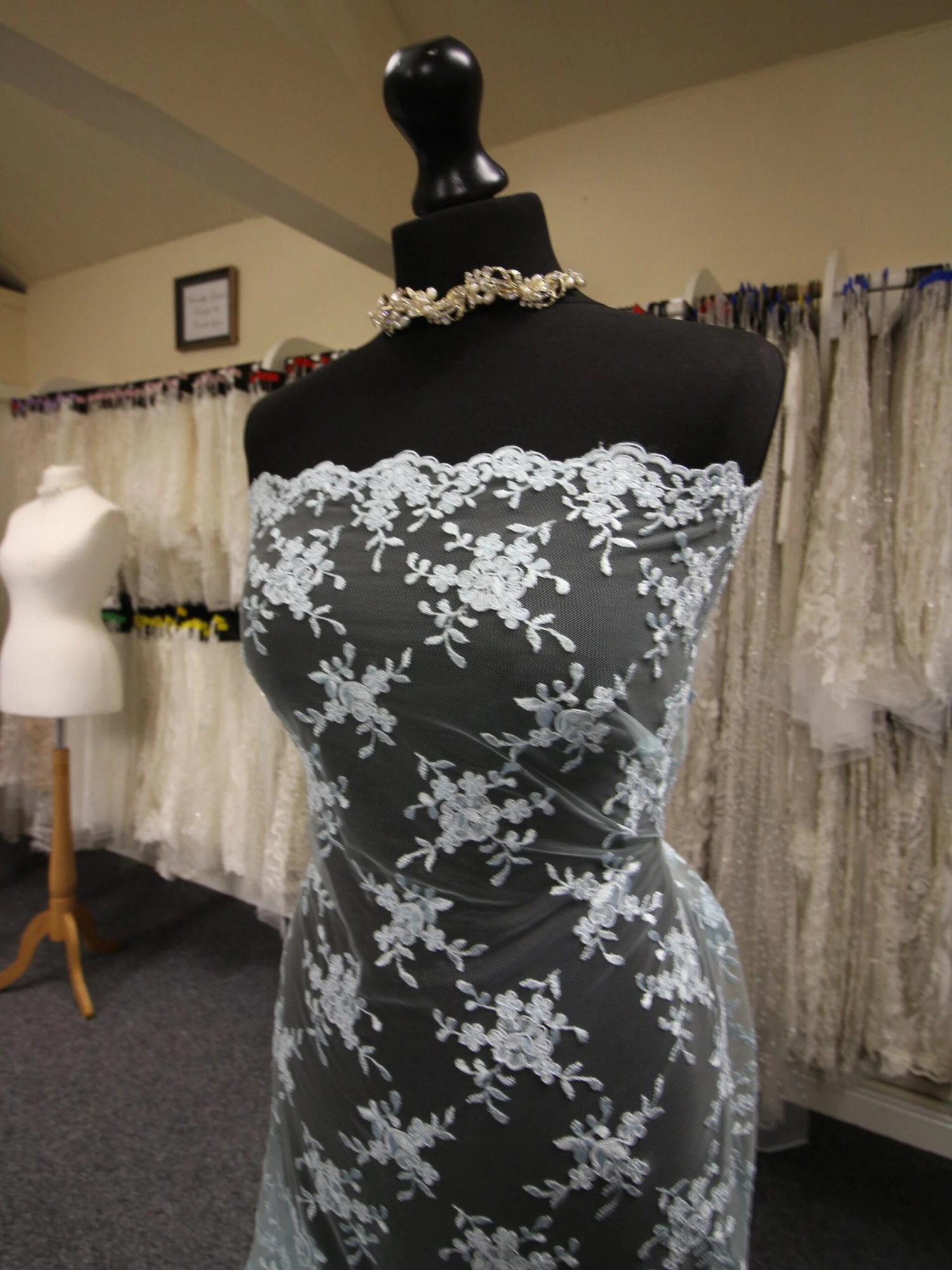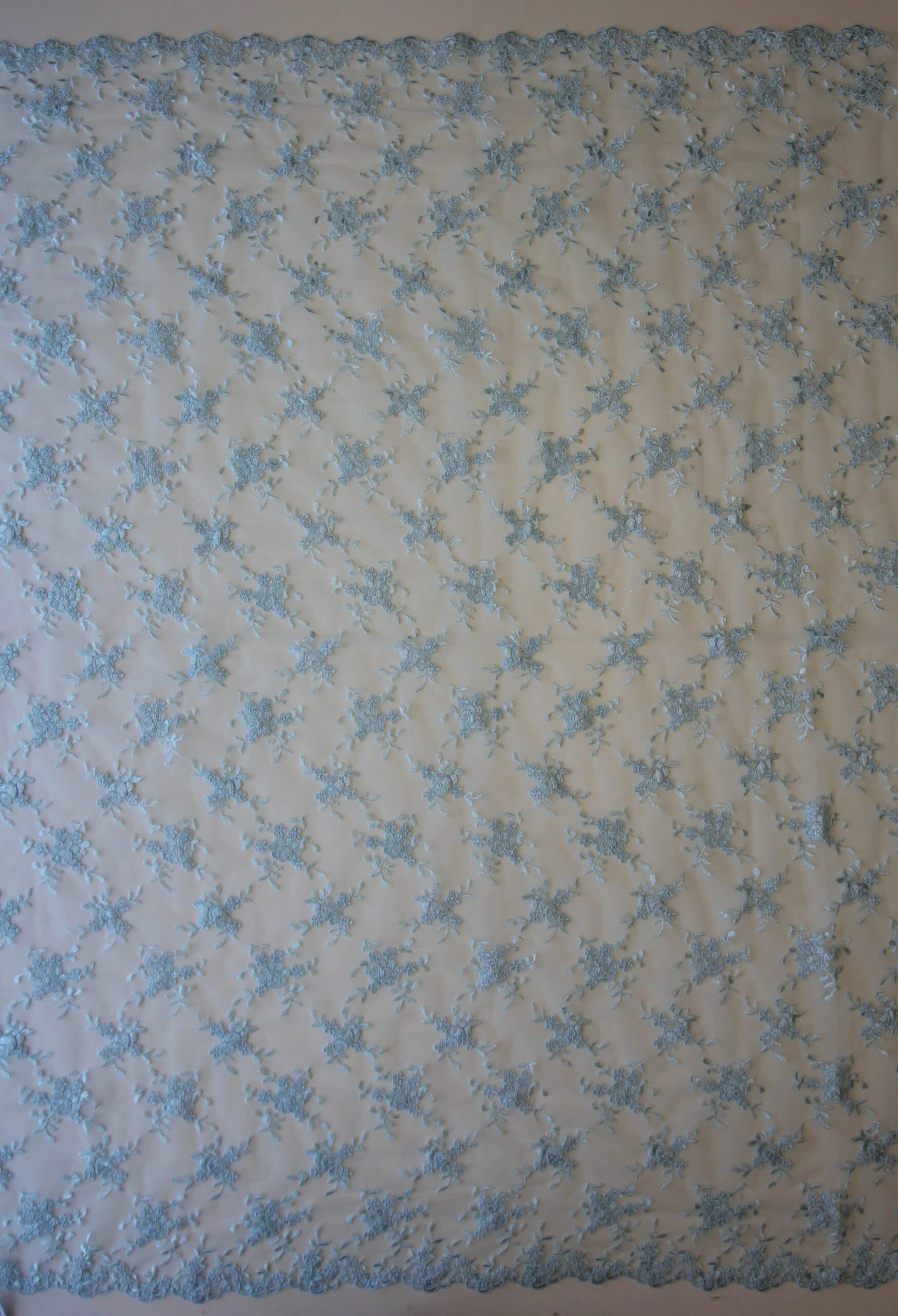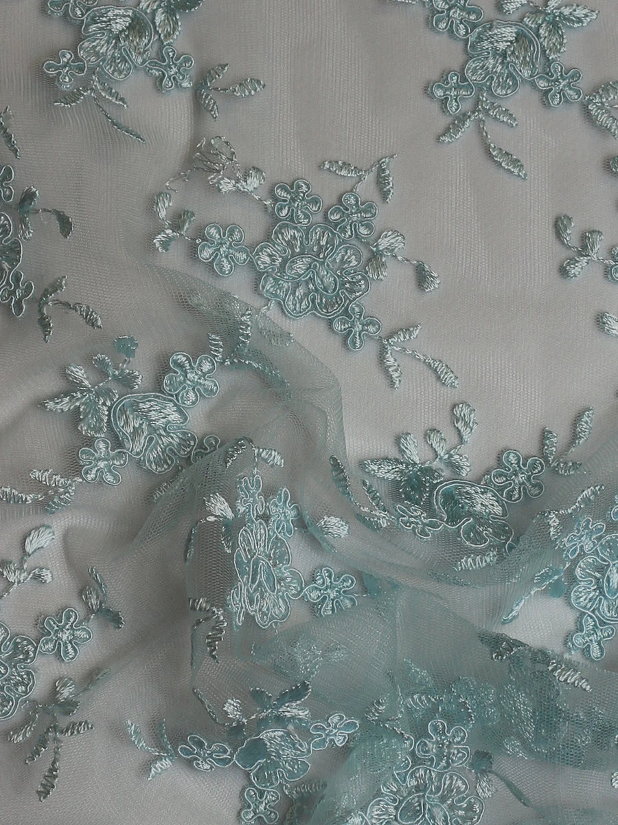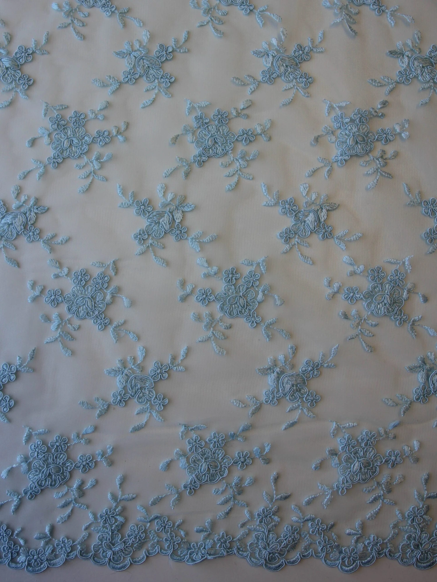 A pale blue corded embroidery lace, available from stock, we have called this design Geraldine.