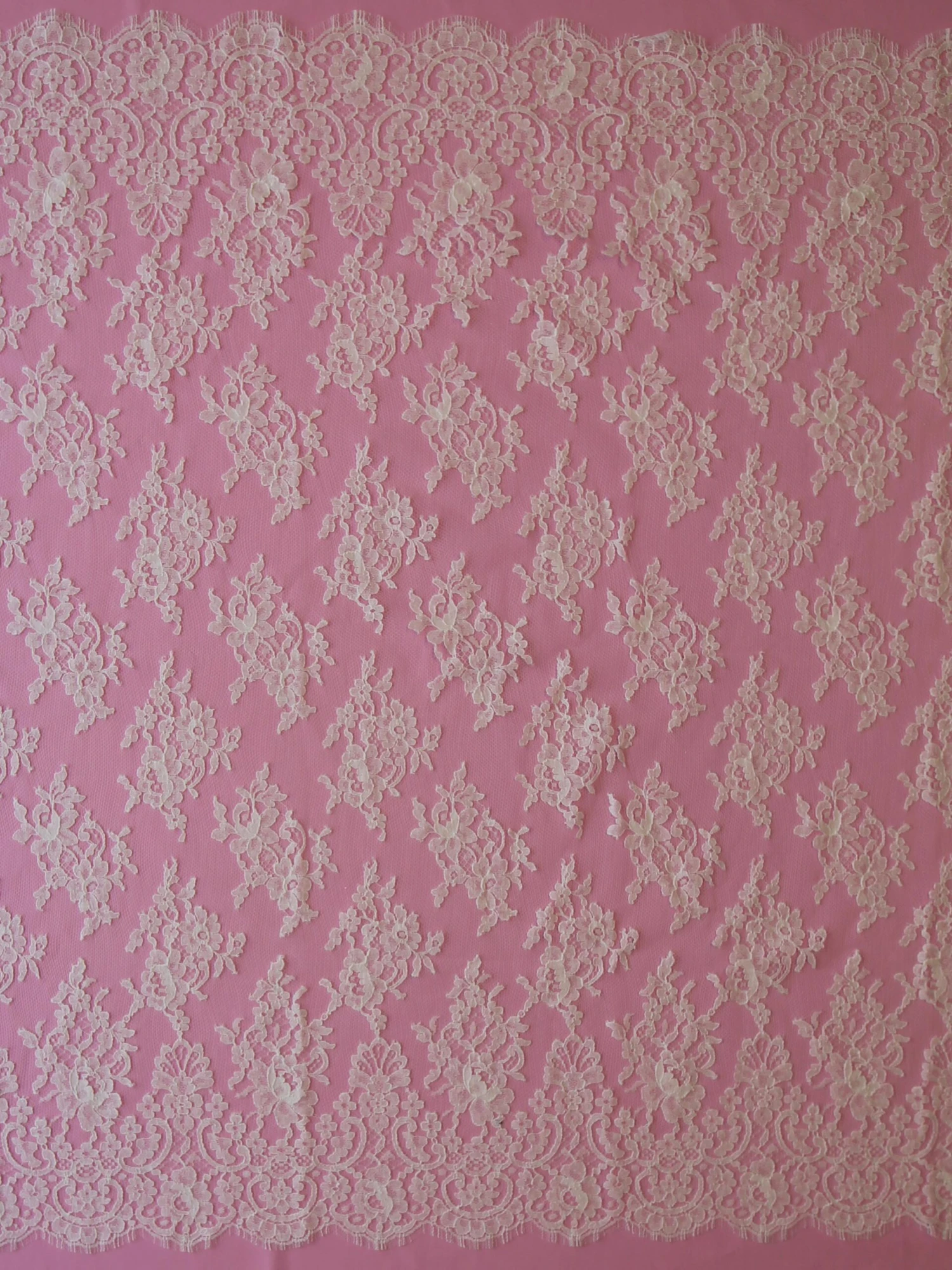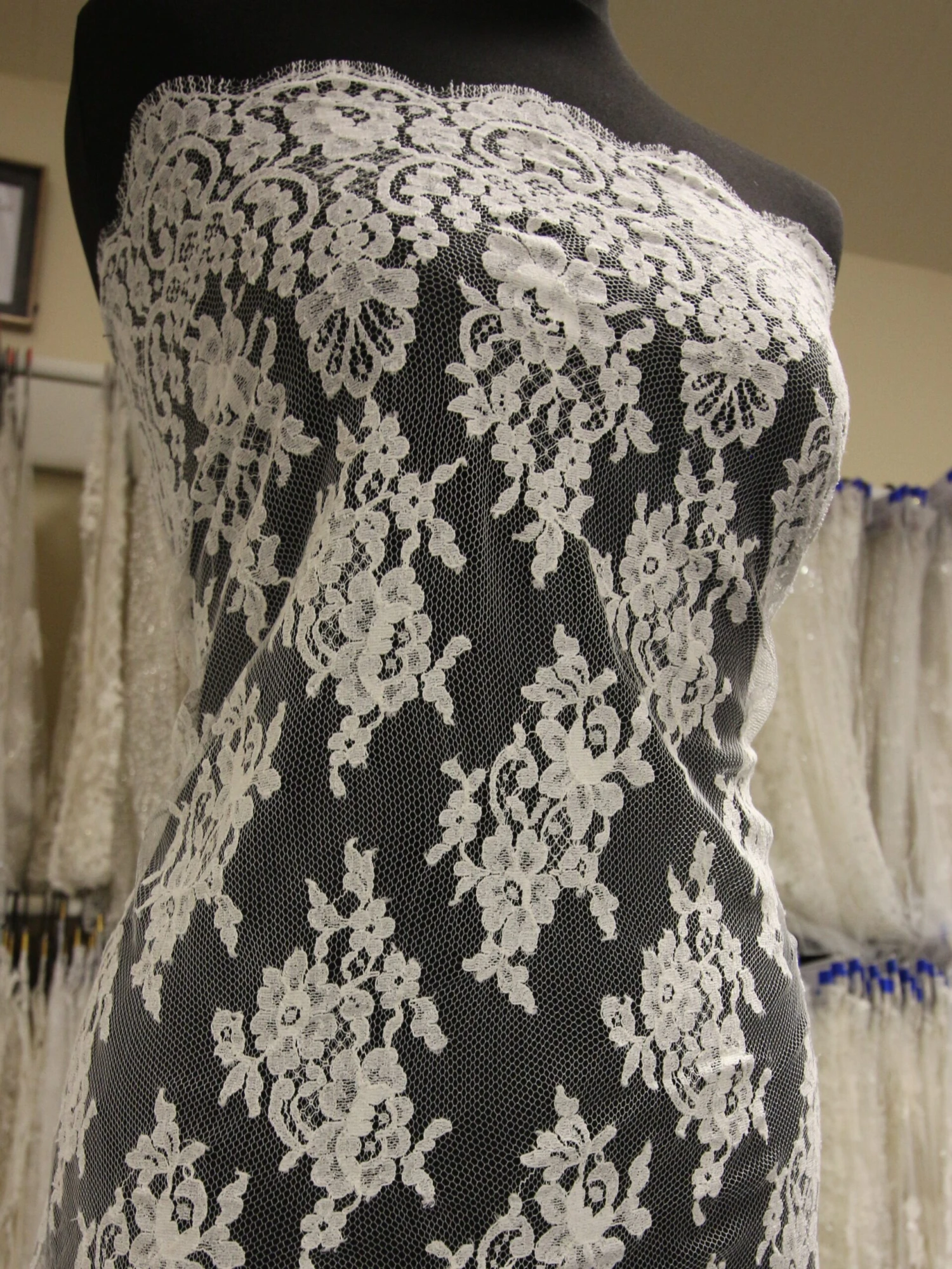 Natasha is an elegant Bridal Chantilly Lace with motifs closely spaced thoughout the design, that we also offer ivory.